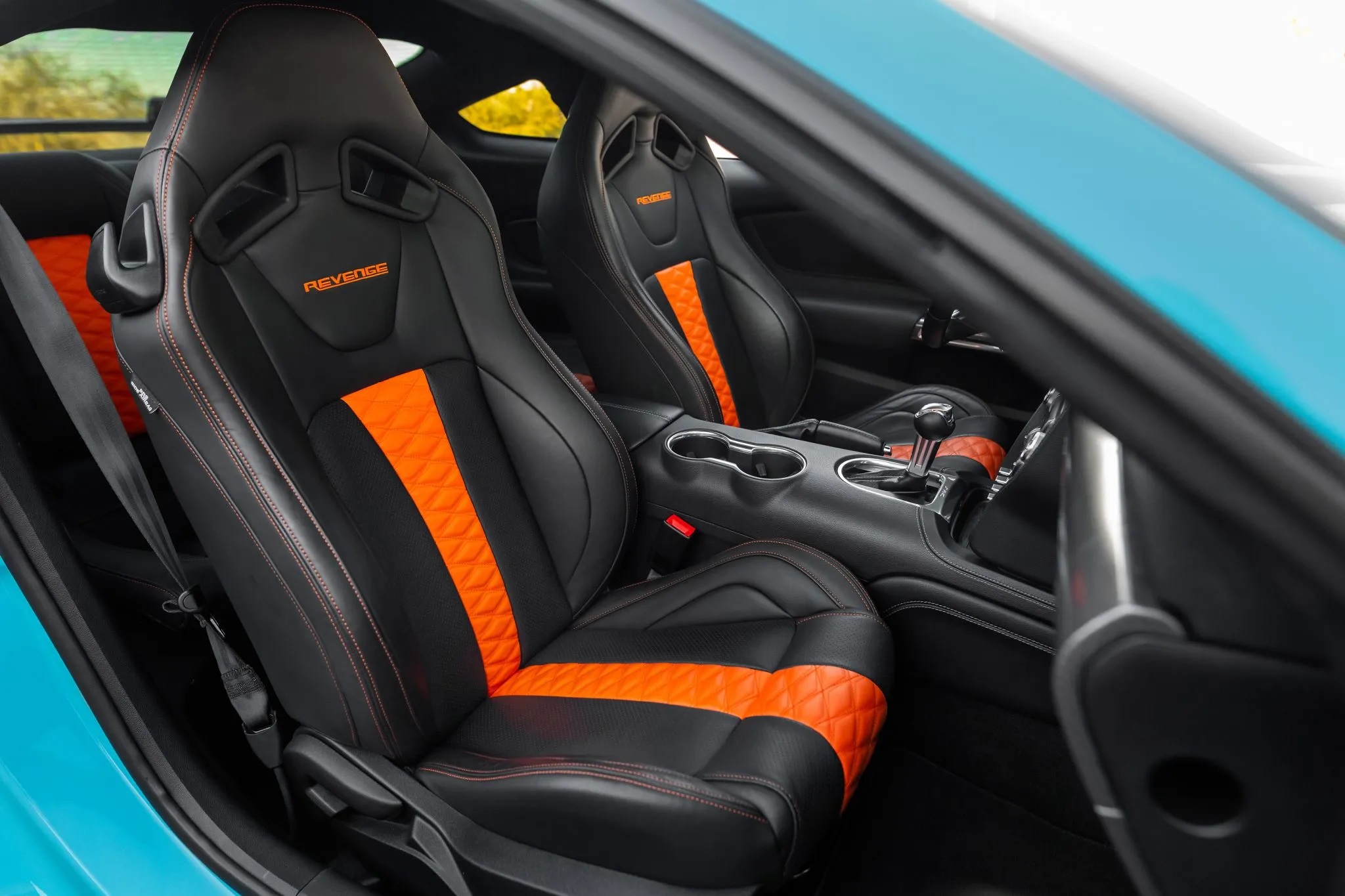 The Peregrine conversion extends to the interior. The car features black Napa leather with contrasting orange stitching and embossed Revenge logos on the backrests of the heated and cooled Recaro front seats. Matching leather extends to the door panels.
