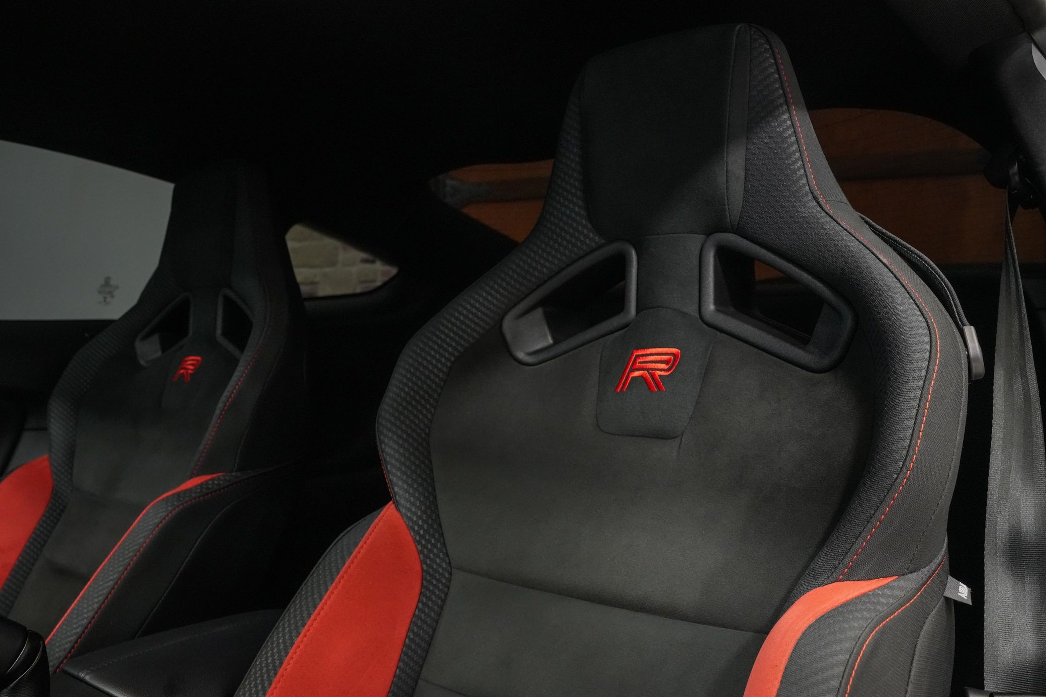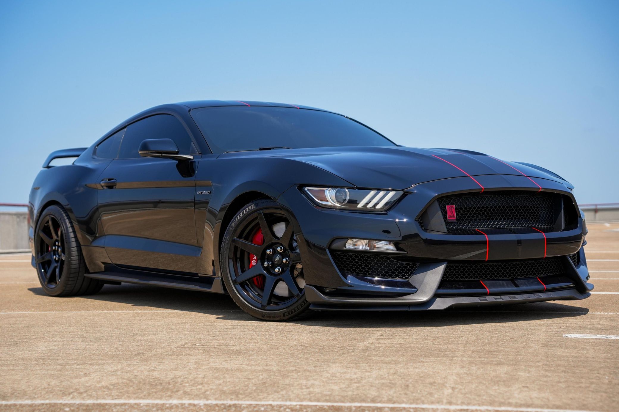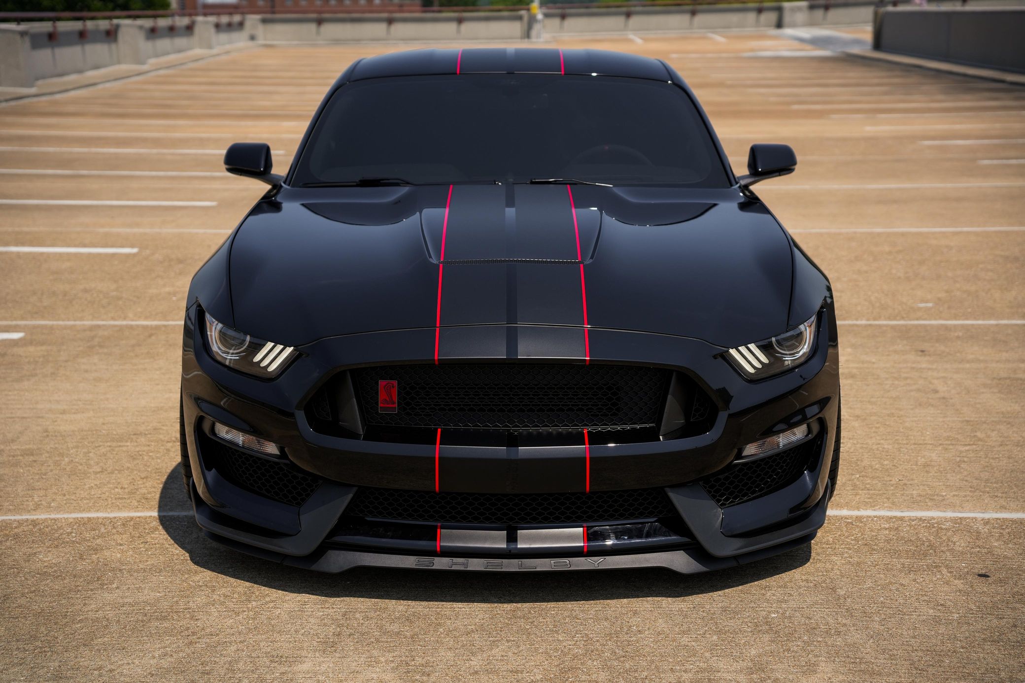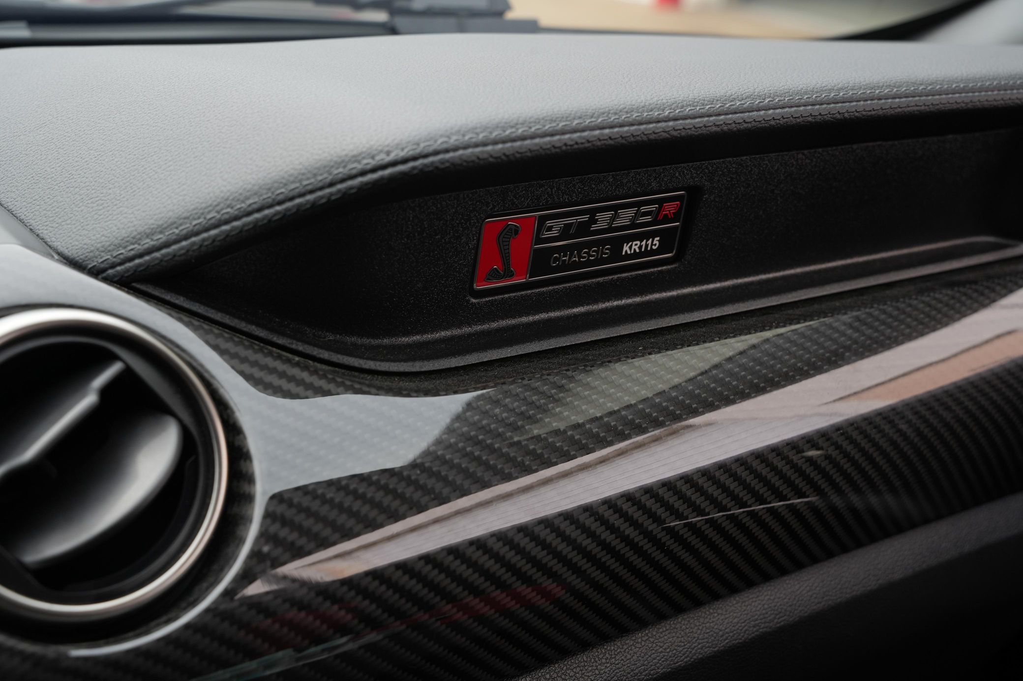 This GT350R boasts a stunning Shadow Black exterior with black racing stripes, 19-inch carbon fiber wheels, and a prominent rear wing. The interior features Recaro seats upholstered in cloth and Miko suede, with carbon fiber trim and red accents. The Electronics Package adds premium features, including dual-zone climate control, a 9-speaker audio system, SiriusXM, and the SYNC 3 infotainment system with an 8-inch touchscreen, all for an additional $3,000.