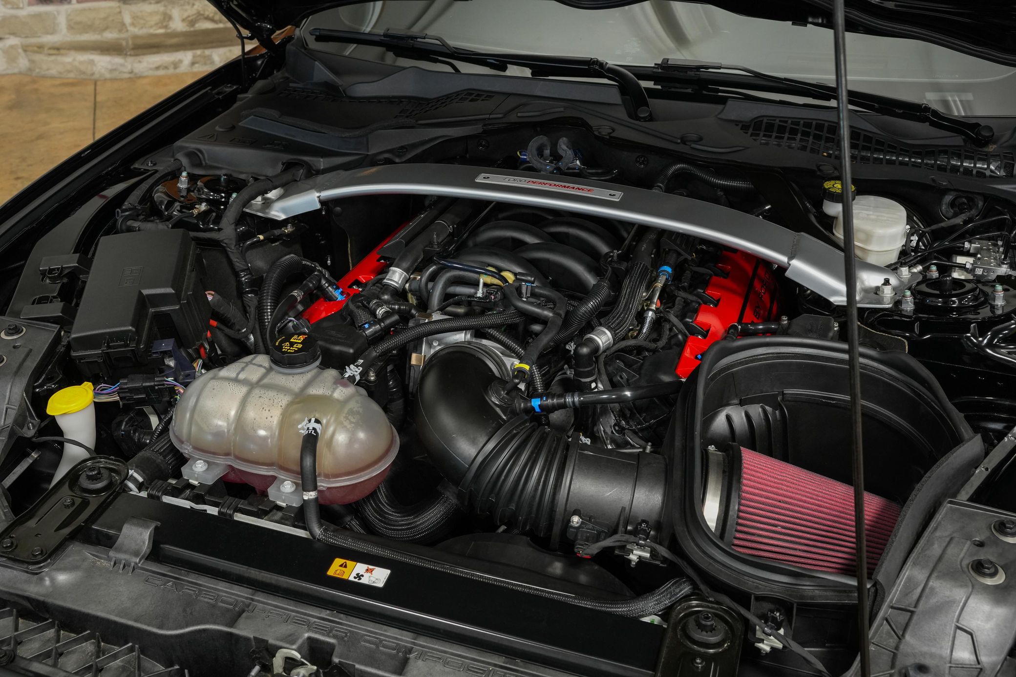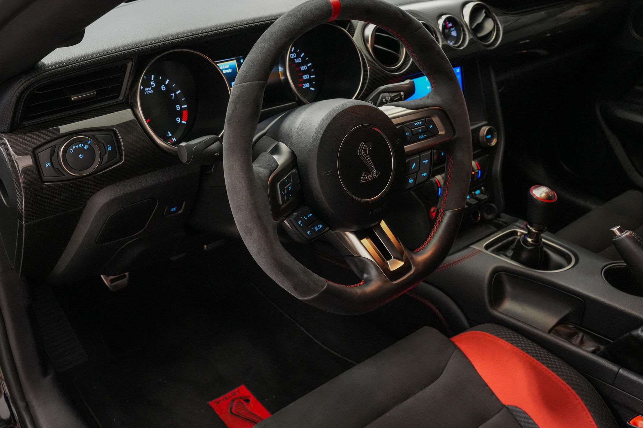 Powered by a 5.2L DOHC 32-valve V-8 engine, this Mustang is equipped with a flat-plane crank, allowing it to rev up to 7,500 RPM, producing 526 HP and peak torque at 4,750 RPM. This advanced engine, along with variable valve timing, ensures a flat power curve, pushing the car effortlessly to go from 0 to 60 MPH in 3.9 seconds and a top speed of 175 MPH.