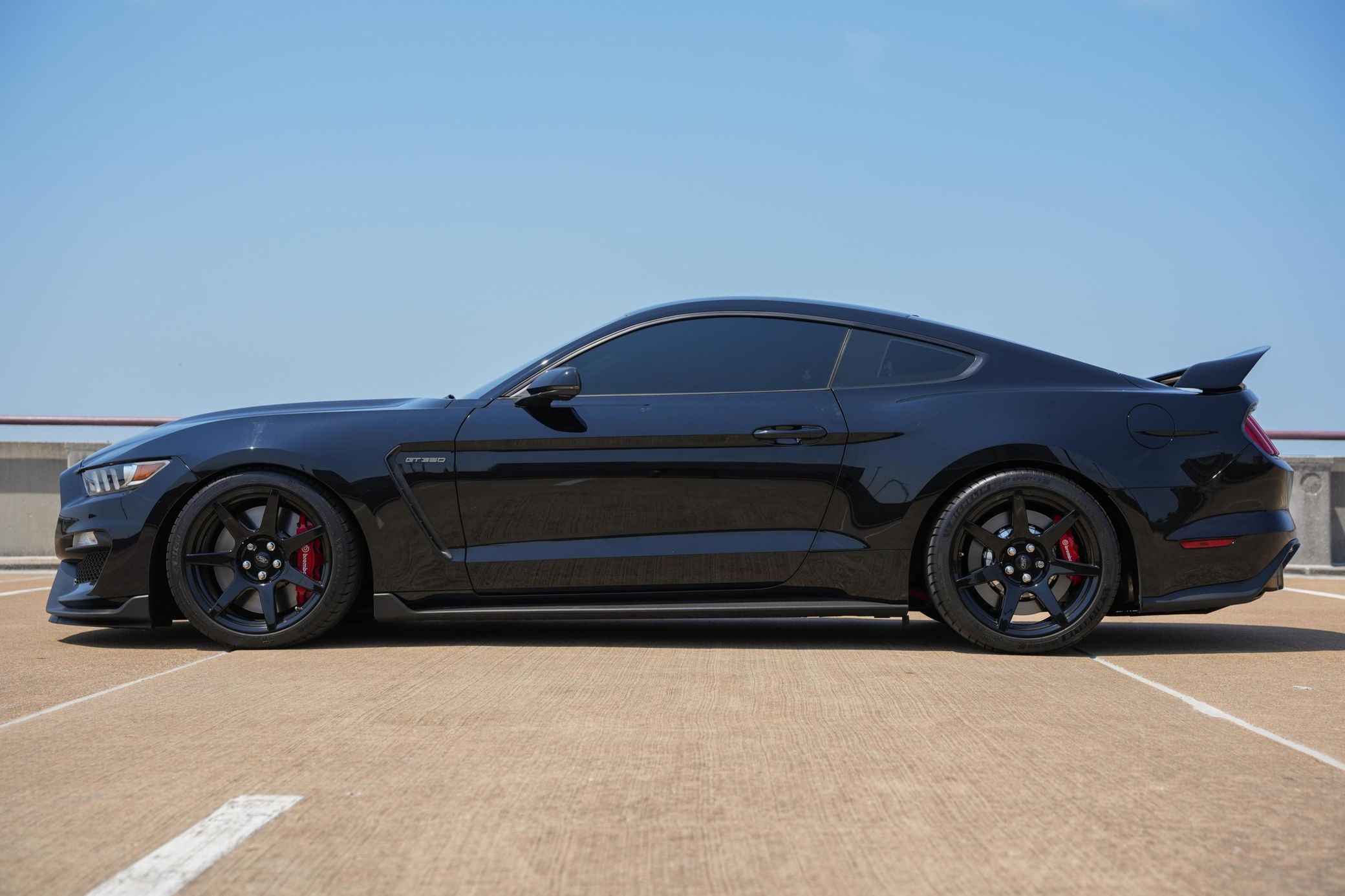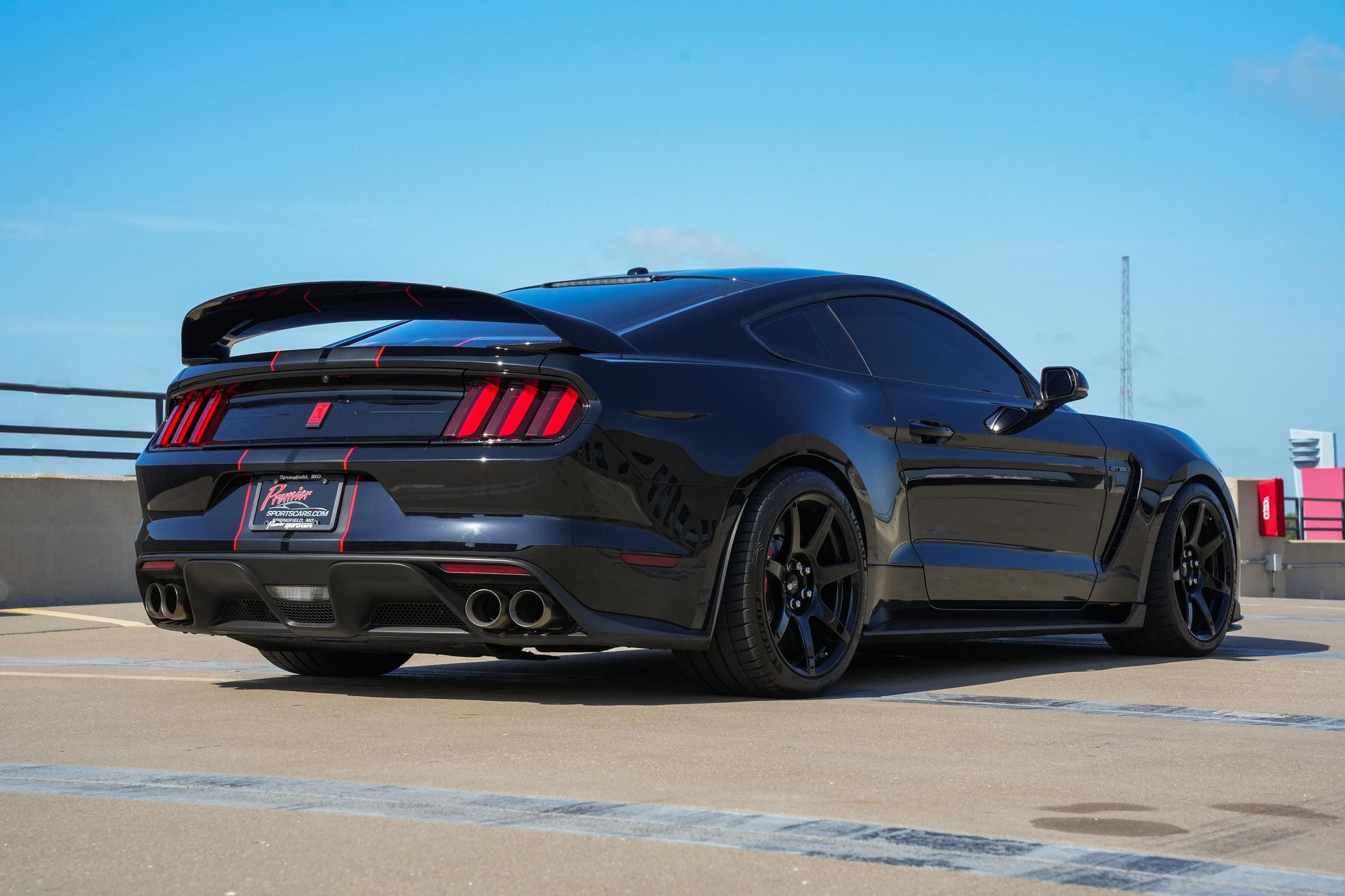 The 2019 GT350R is distinguished by a larger front splitter, a carbon fiber rear wing, and 19-inch black carbon fiber wheels. It features substantial suspension upgrades, including relocated front suspension points, alloy uprights, and counter-wound rear springs, enhancing its cornering ability. The drivetrain includes a 6-speed Tremec manual transmission and a Torsen 3.73:1 limited-slip differential, ensuring smooth power delivery.