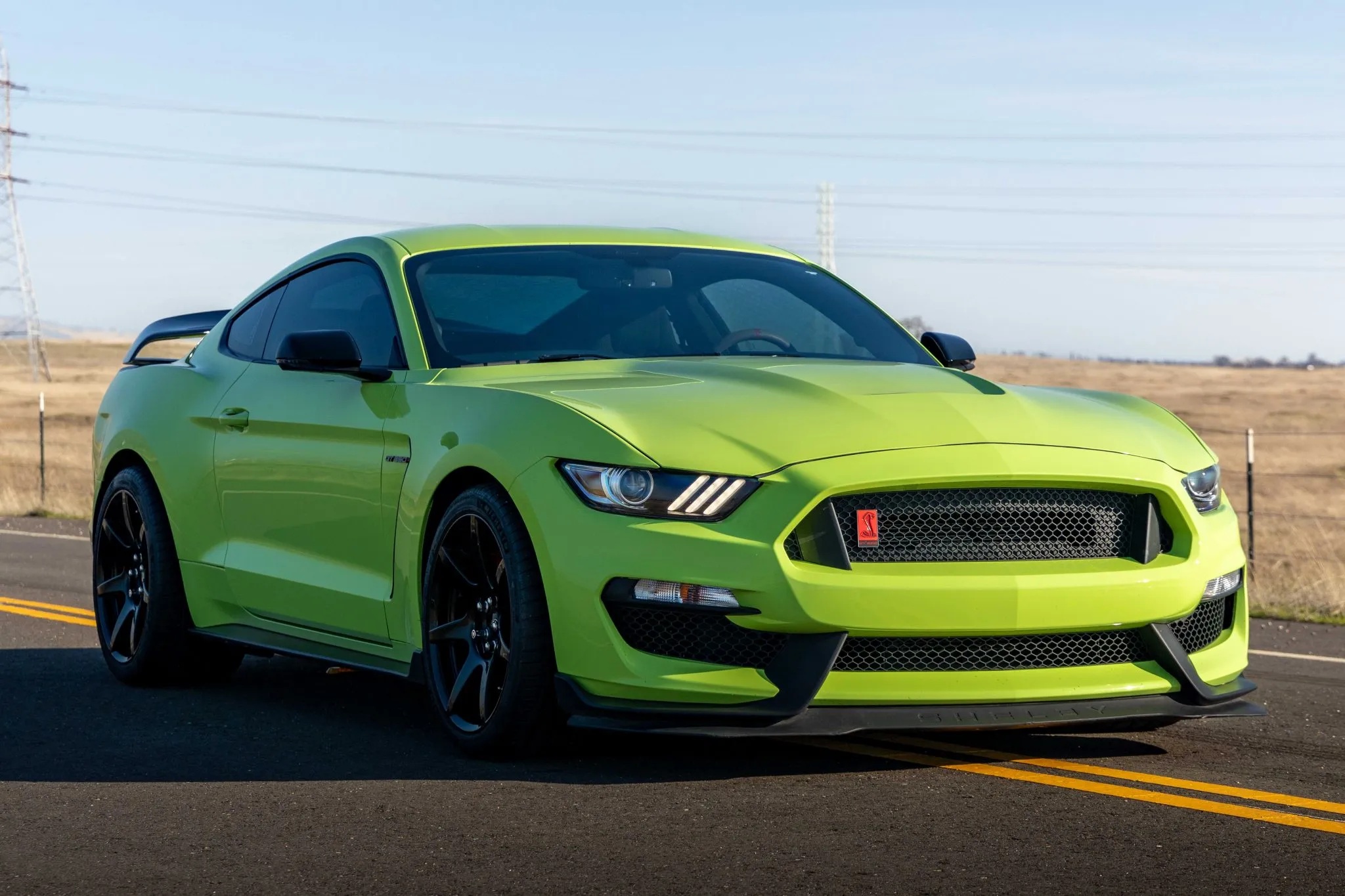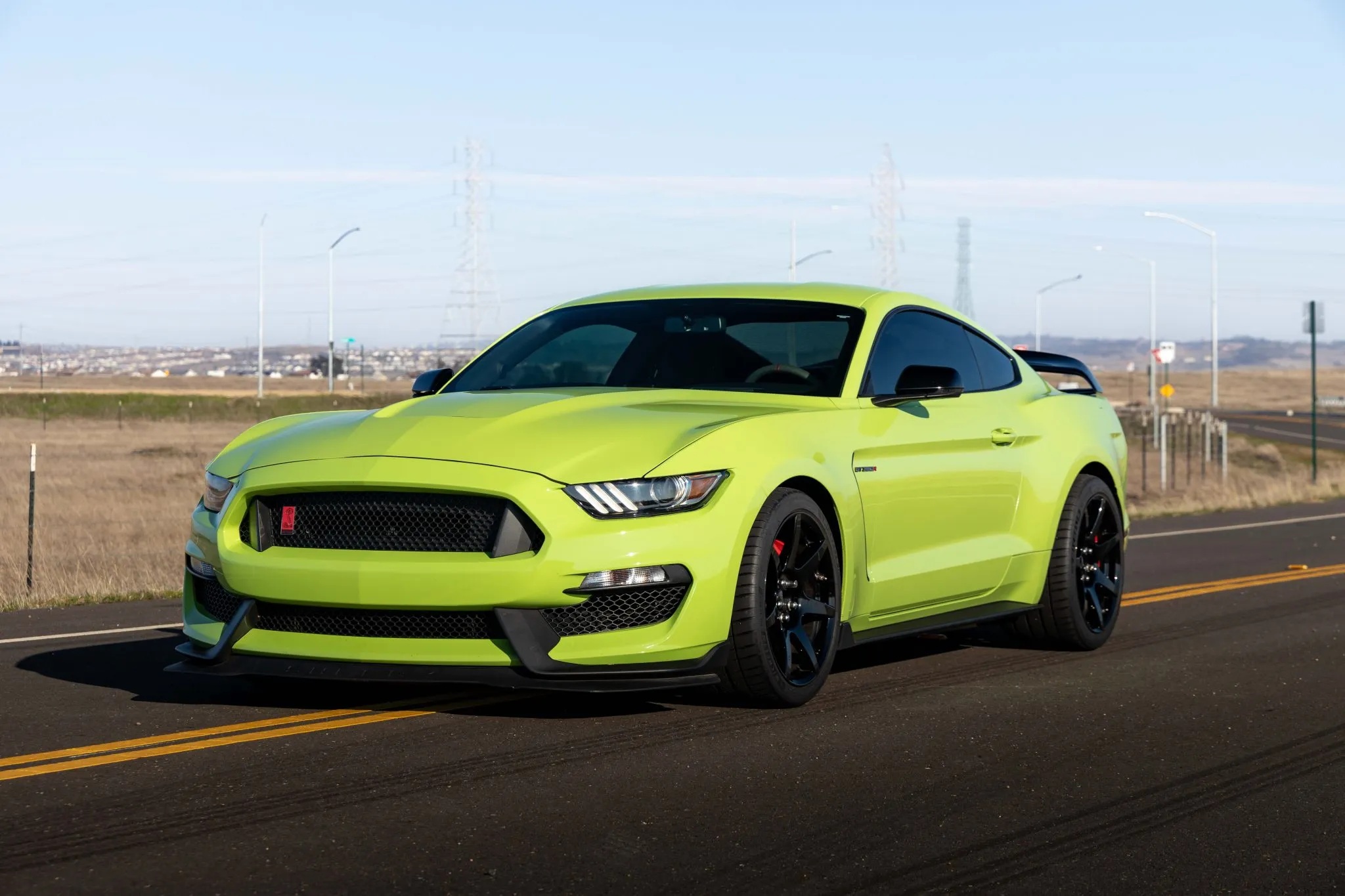 This 2020 GT350R, listed on Bring A Trailer, is a visual standout in Grabber Lime with a black roof, prominent front splitter, and high rear wing. The Ebony interior boasts carbon fiber trim, red accents, and supportive Recaro seats upholstered in cloth and Miko suede, ensuring comfort and stability during spirited drives.