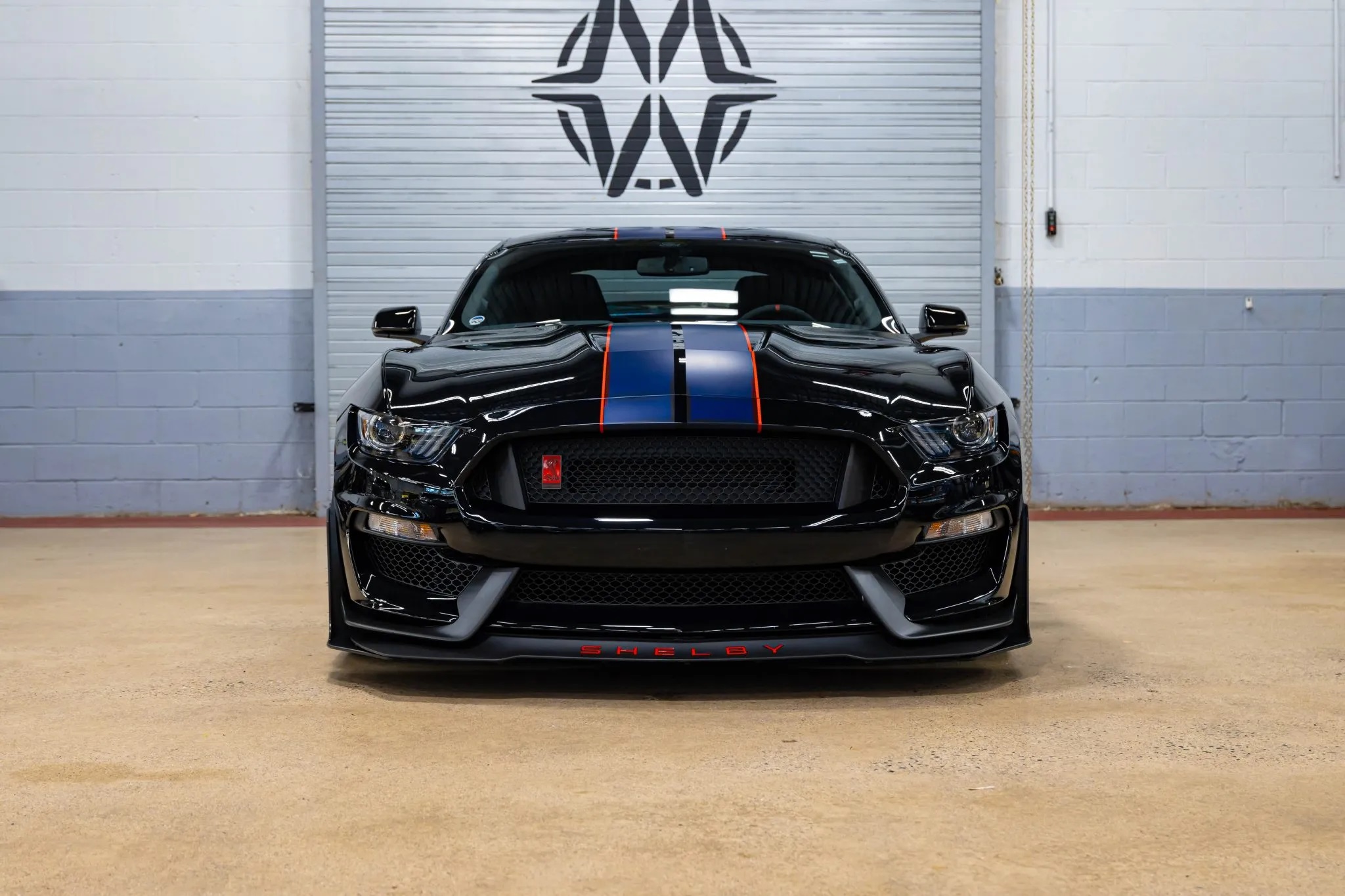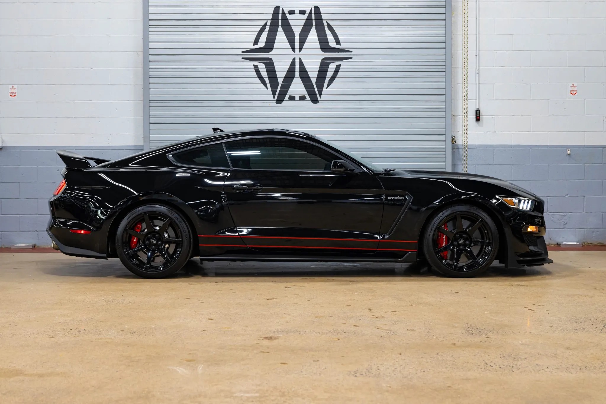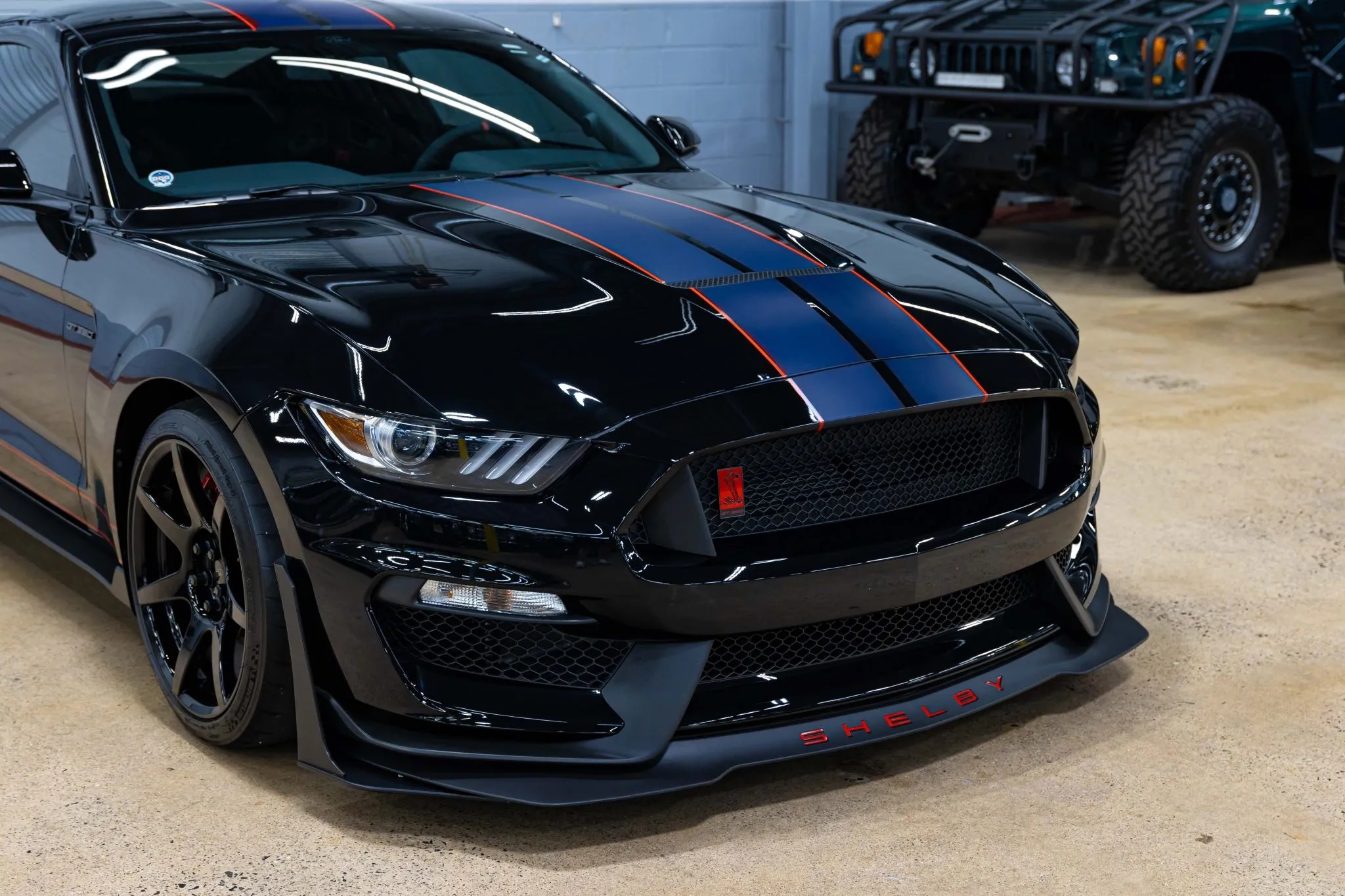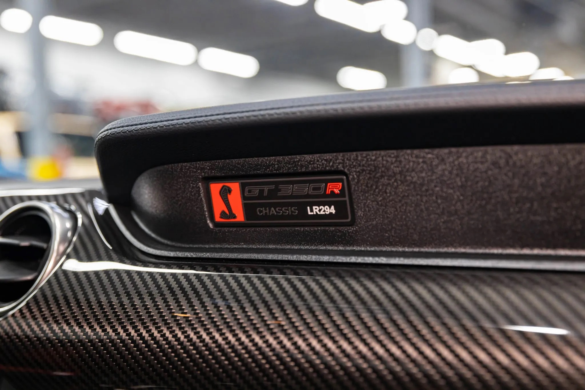 This black-over-black GT350R, initially delivered to Ford of Port Richey in Florida, features blue and red over-the-top stripes, black-finished 19″ carbon-fiber seven-spoke wheels, Brembo brake calipers, and a carbon-fiber wing.