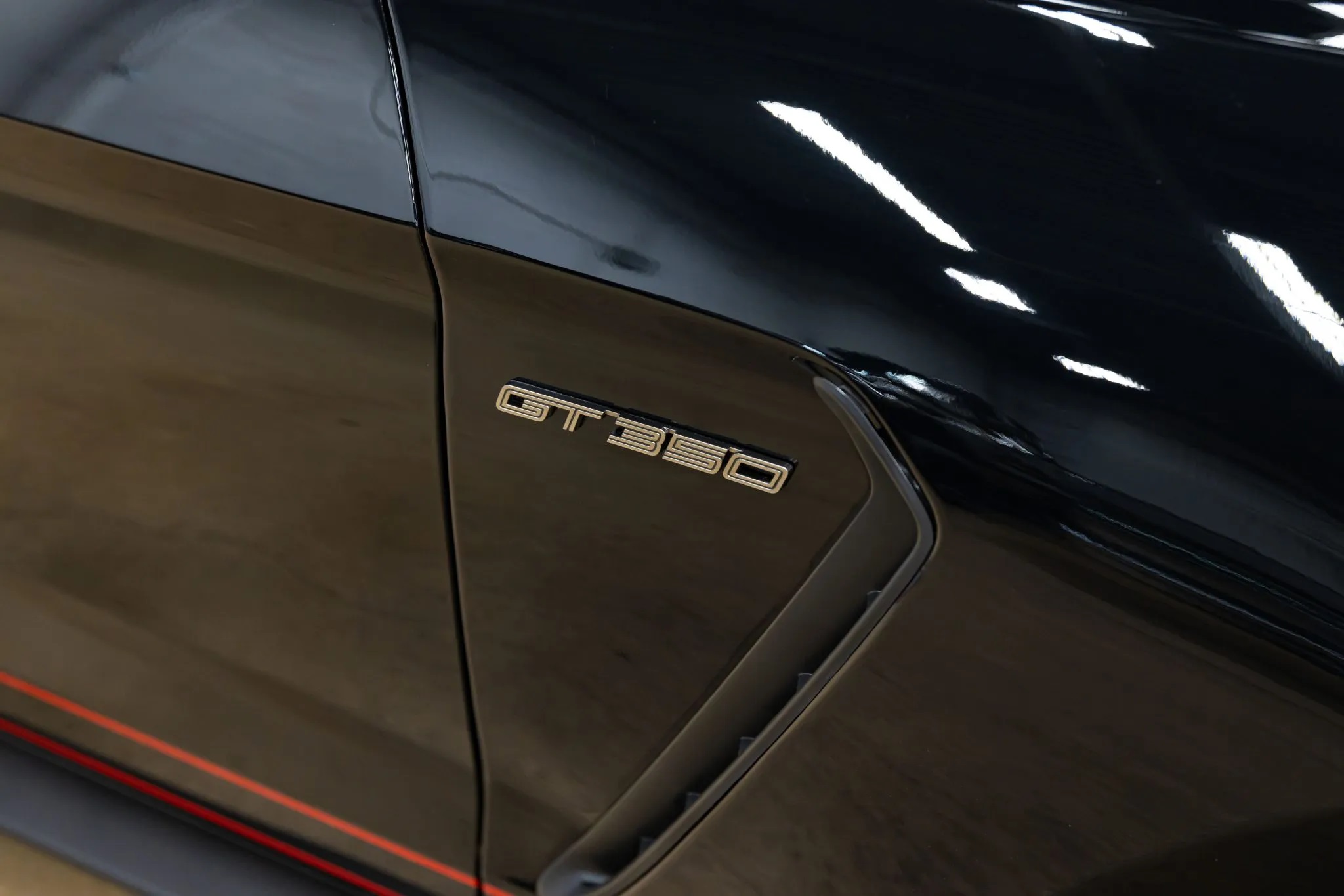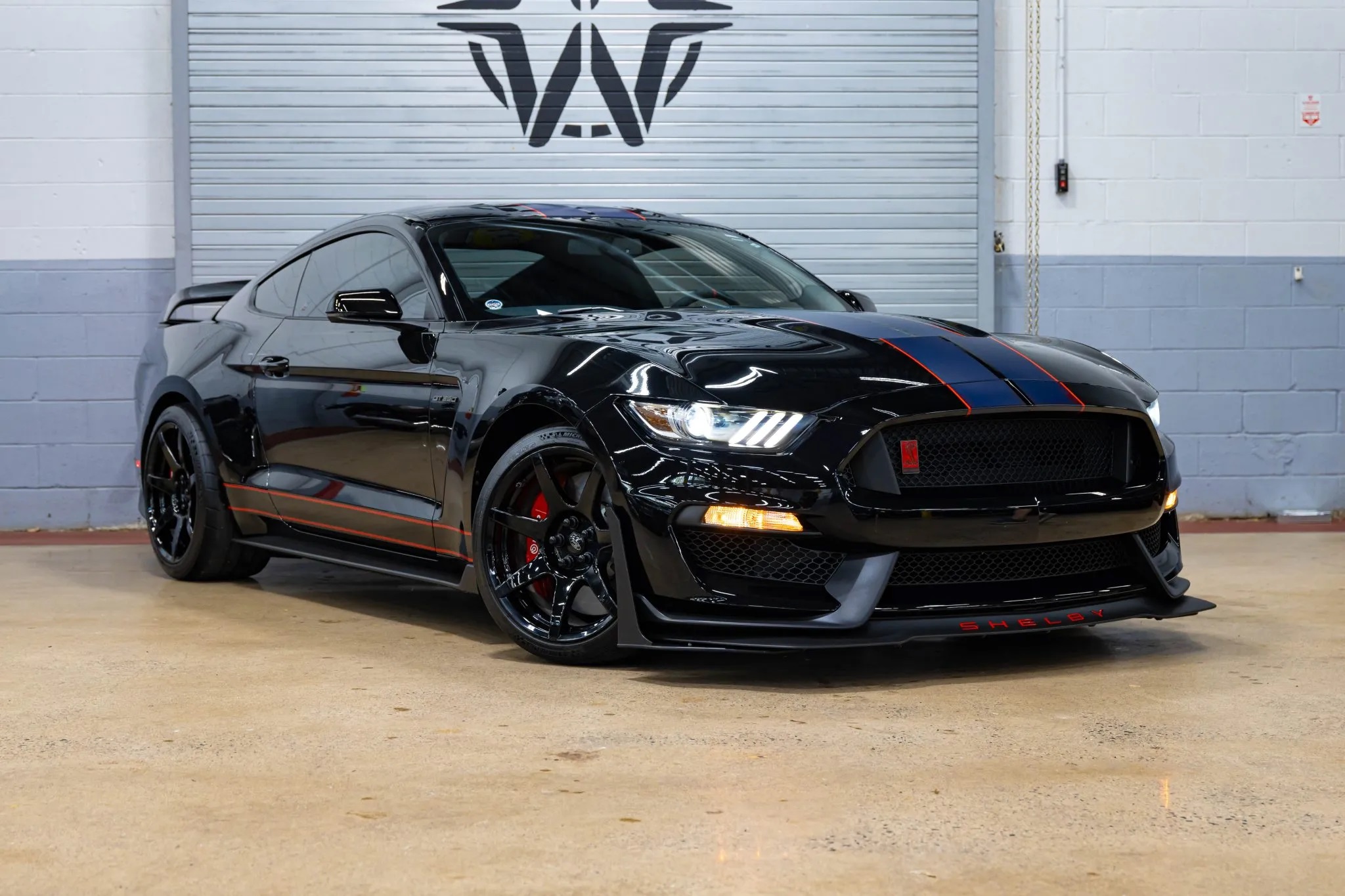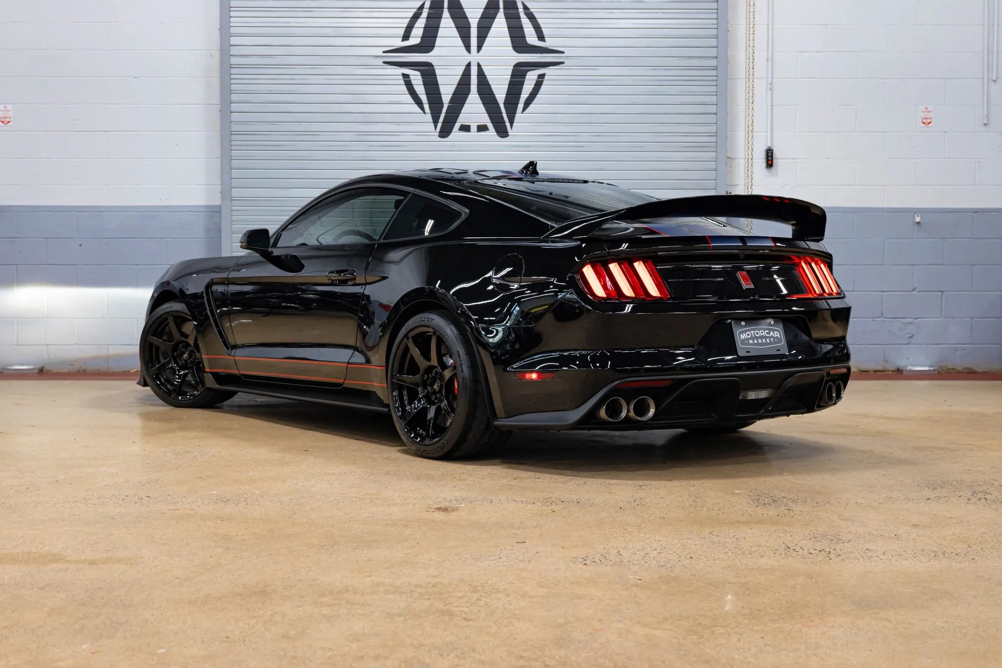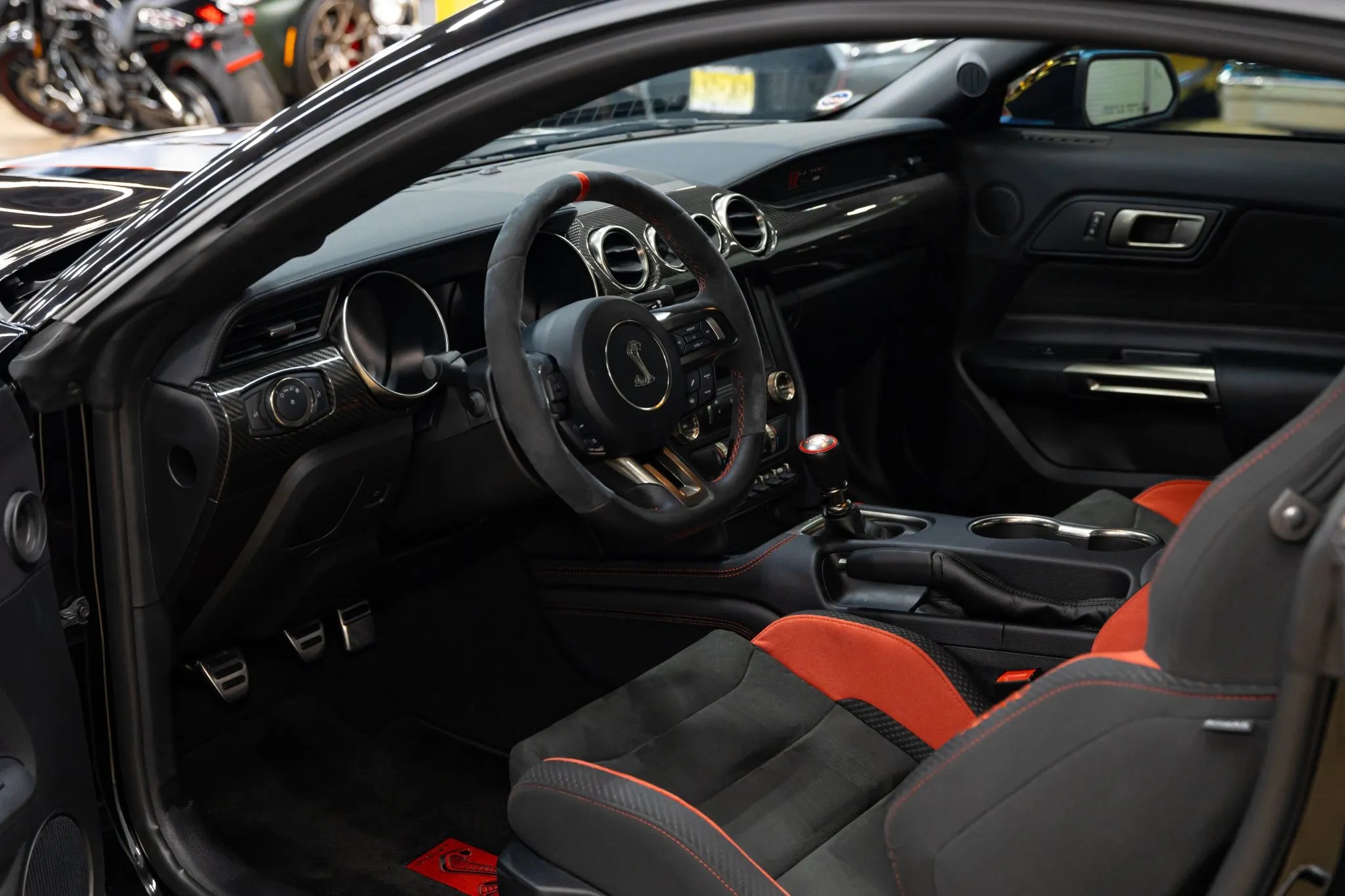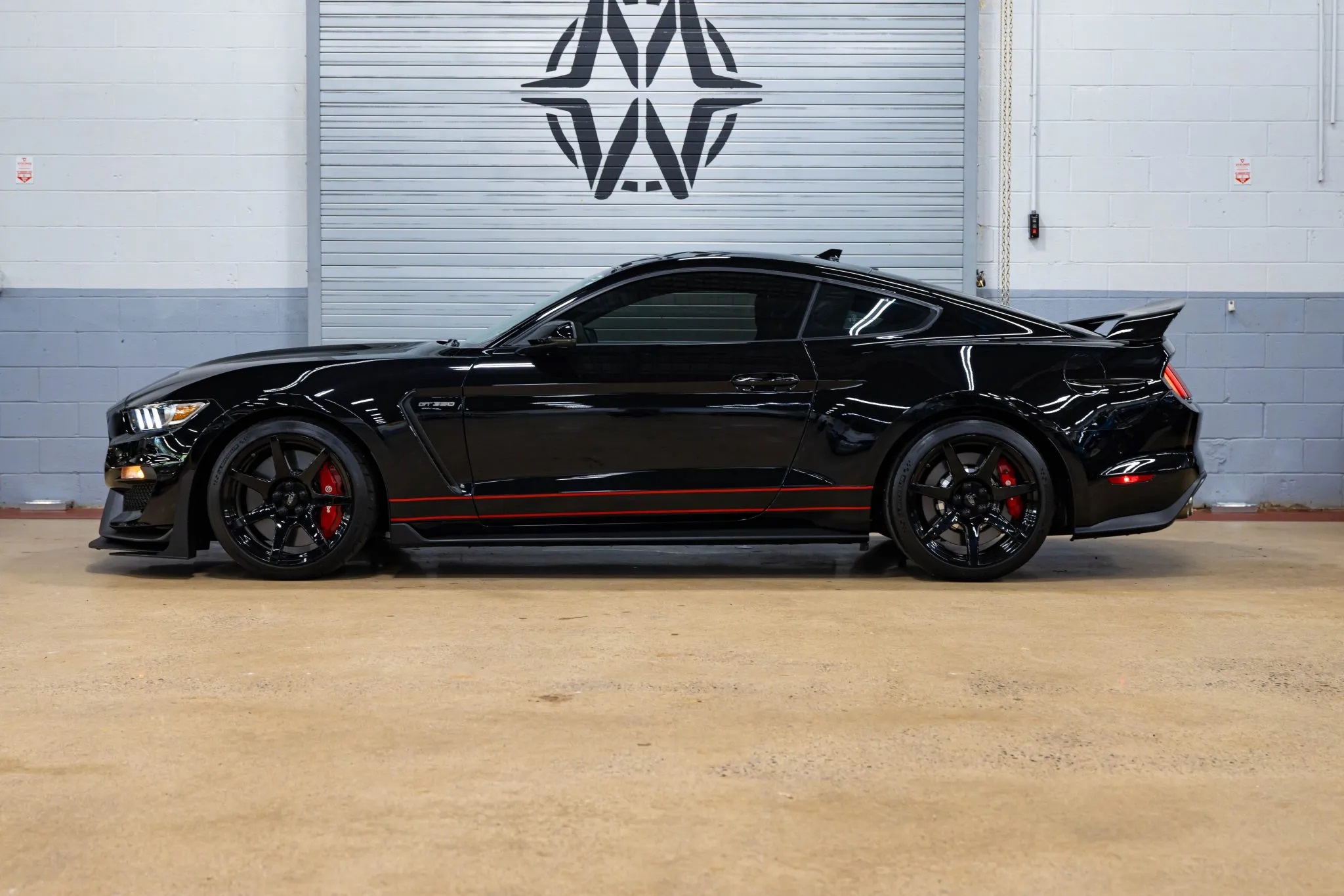 This black-over-black GT350R, initially delivered to Ford of Port Richey in Florida, features blue and red over-the-top stripes, black-finished 19″ carbon-fiber seven-spoke wheels, Brembo brake calipers, and a carbon-fiber wing.