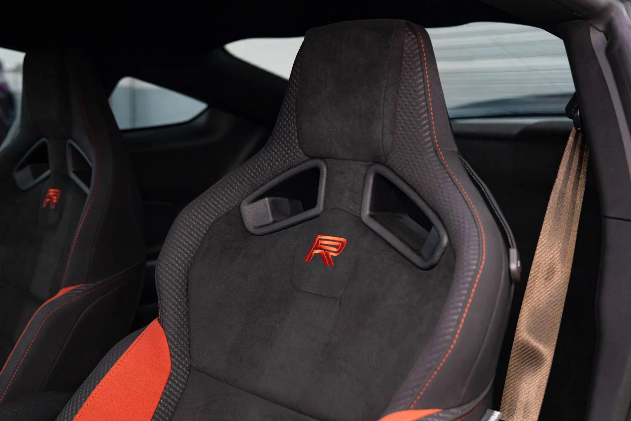 The cabin boasts Recaro sport seats in Ebony cloth and Miko suede with red accents, and carbon-fiber trim on the dashboard. Interior features include carpeted floor mats, a rearview camera, dual-zone automatic climate control, a touchscreen infotainment system with navigation, a Bang & Olufsen sound system, a CD stereo, cruise control, and the Technology Package, which offers cross-traffic alert and navigation.