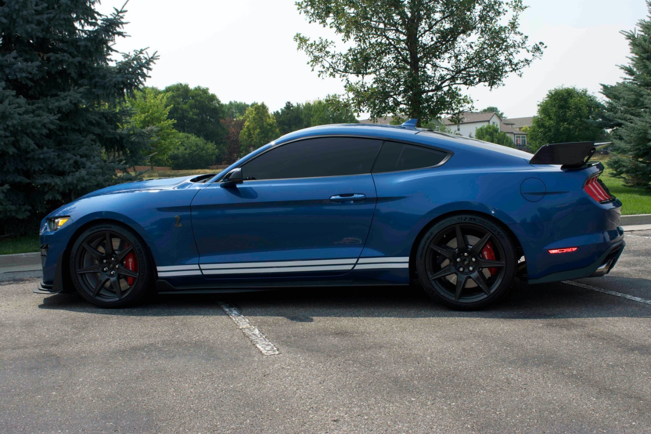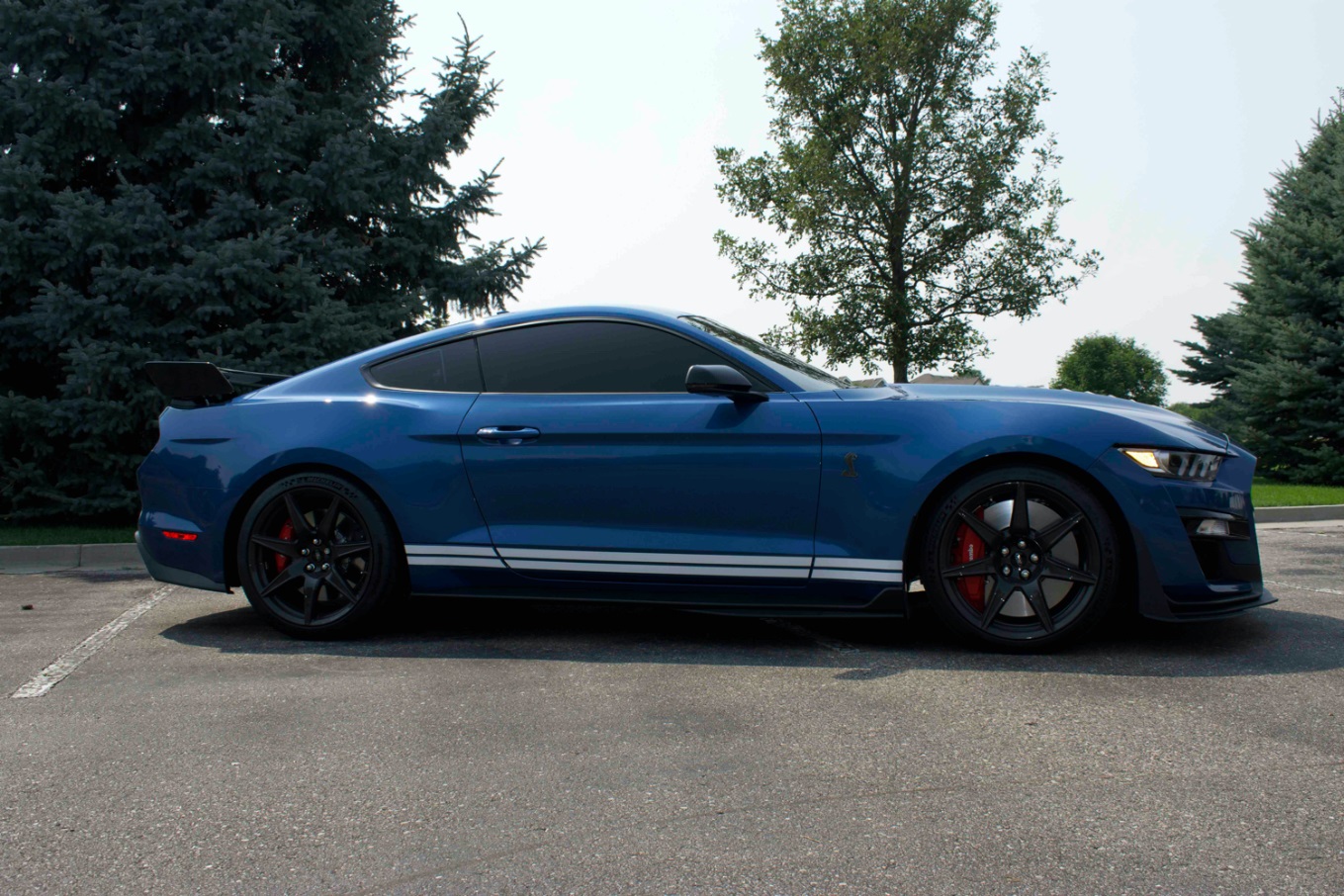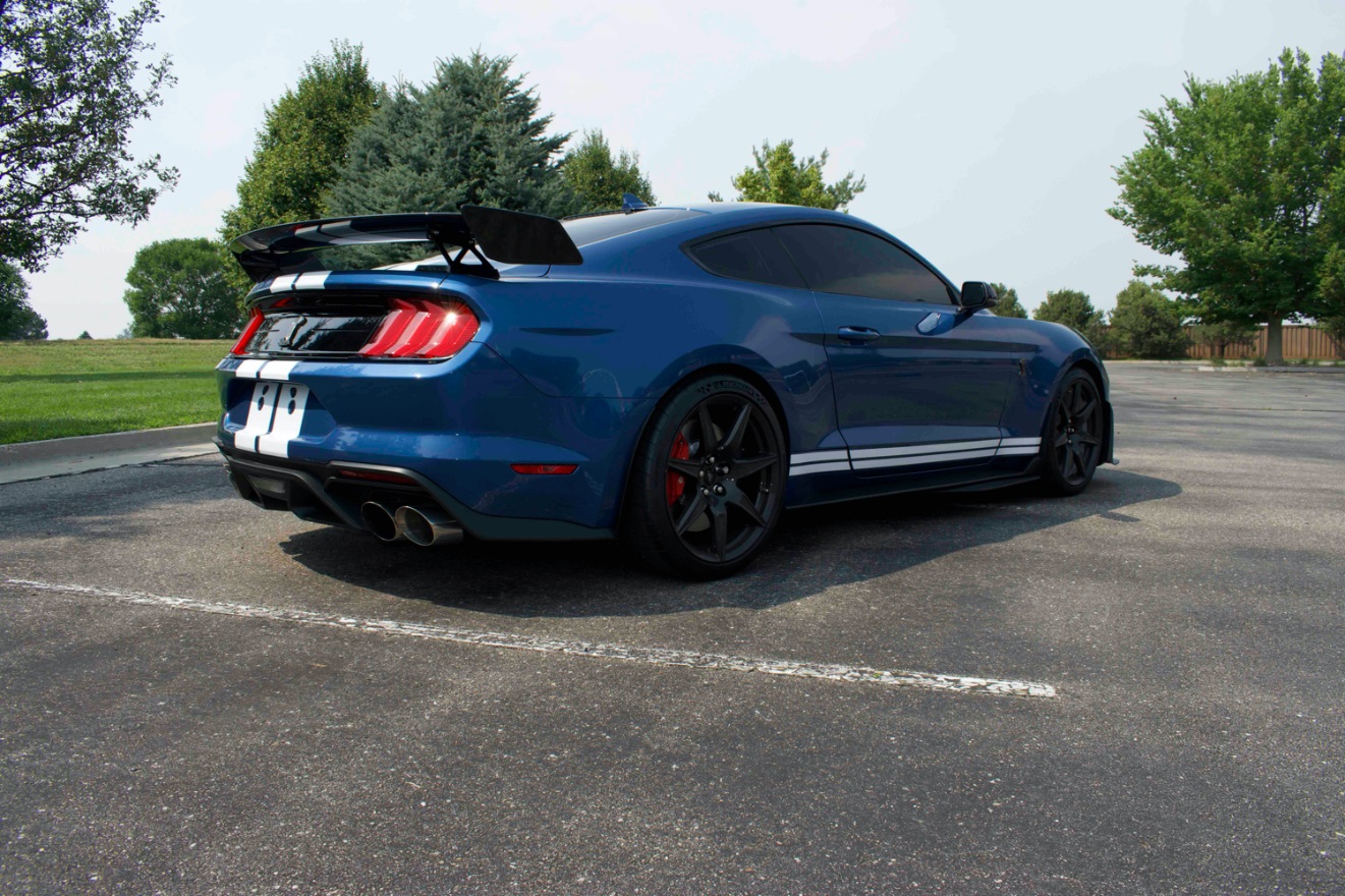 Listed with just 656 miles on Bring A Trailer, finished in Ford Performance Blue Metallic with Bright White stripes and Ebony and gray interior. Equipped with a supercharged 5.2L V8 engine producing 760 HP and a Tremec 7-speed dual-clutch transmission, this GT500 also features the Technology Package, Brembo brakes, Recaro seats, and carbon-fiber 20″ seven-spoke wheels.