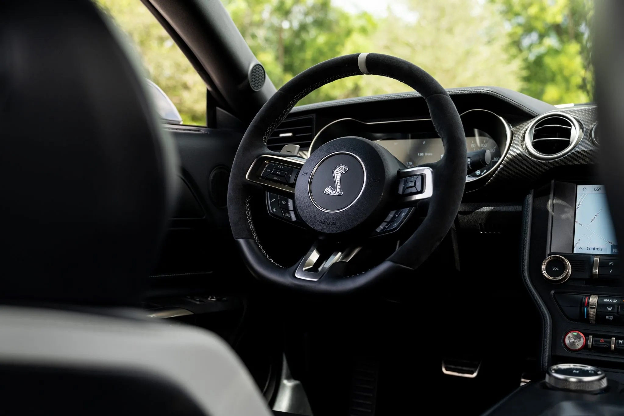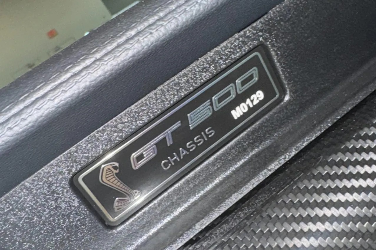 Its hand-built 5.2-liter Predator V8 engine is factory-rated at 760 horsepower and 625 lb-ft of torque, featuring an inverted roots-type supercharger, air-to-liquid intercooler, and engine oil cooler. The engine is paired with a Tremec seven-speed dual-clutch automatic transmission and includes a plaque engraved with the engine builder’s signature.
