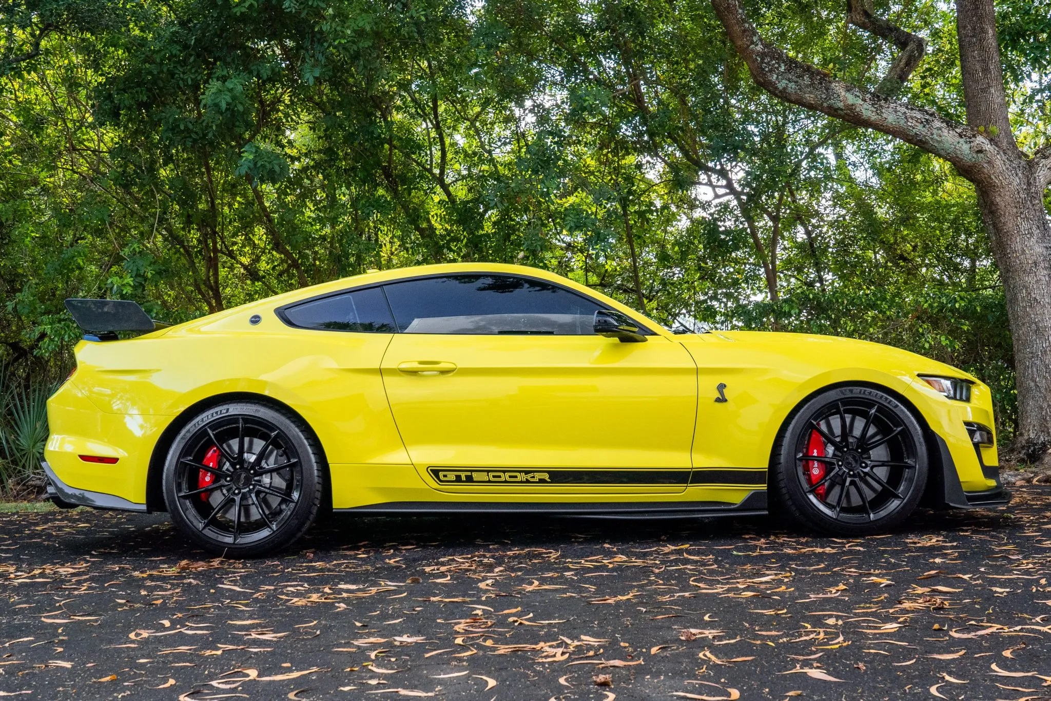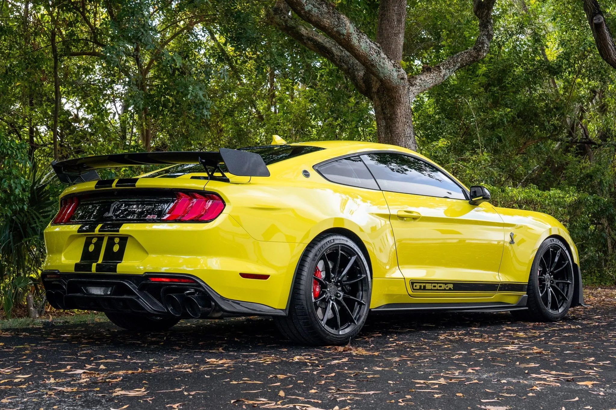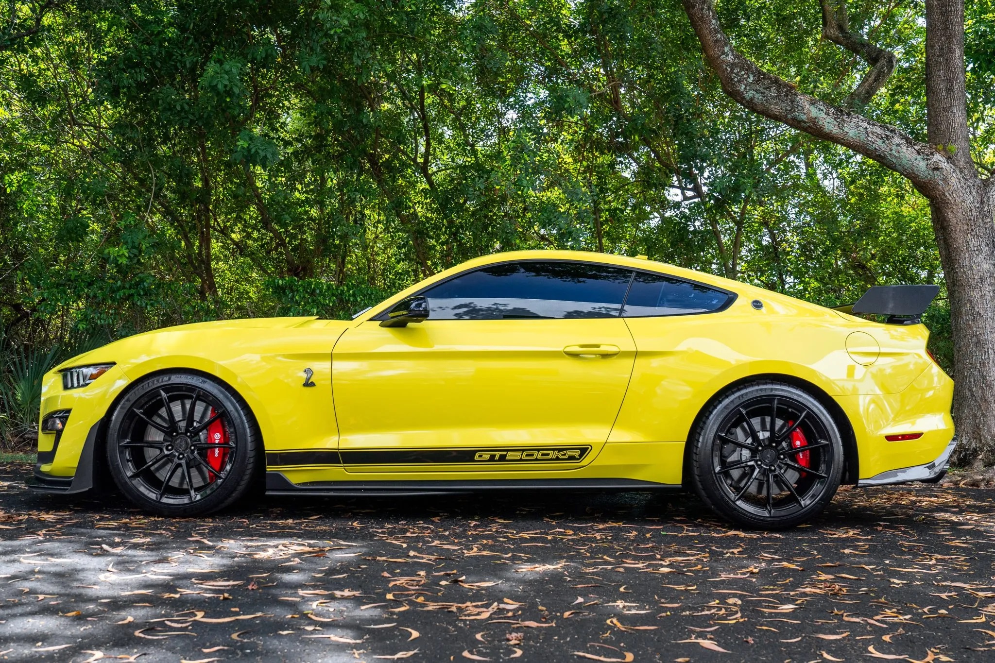 Shelby enhanced the GT500’s MagneRide suspension, adding adjustable camber/caster plates, ride height-adjustable springs, and Shelby-spec sway bars. Brembo 4-wheel disc brakes with red-painted calipers and Michelin Pilot Sport 4S tires on custom Shelby forged aluminum wheels complete the setup.