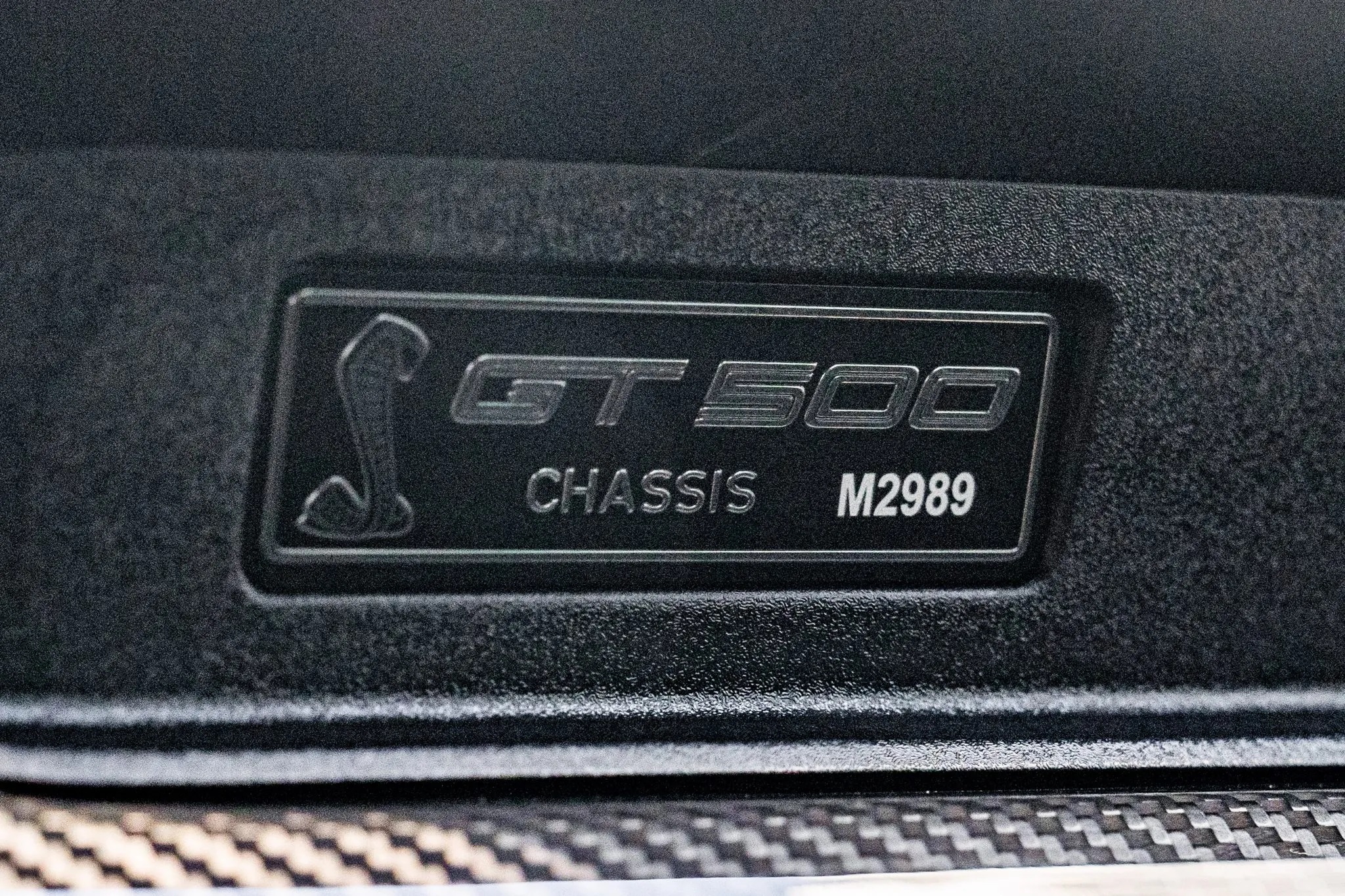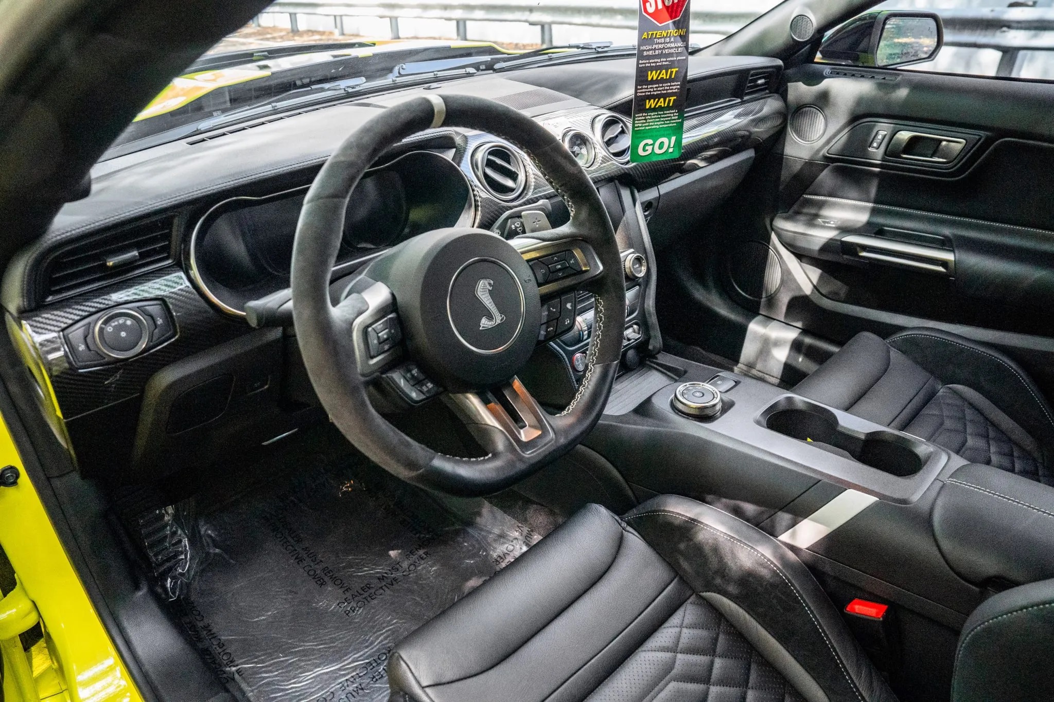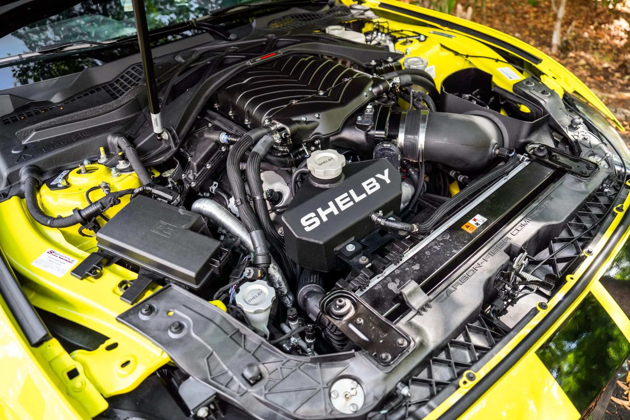 The supercharged V8 is paired with a 7-speed, paddle-shifted automatic transmission, supported by performance half-shafts, extended and hardened wheel studs, and Shelby-spec lug nuts for drivetrain durability.
