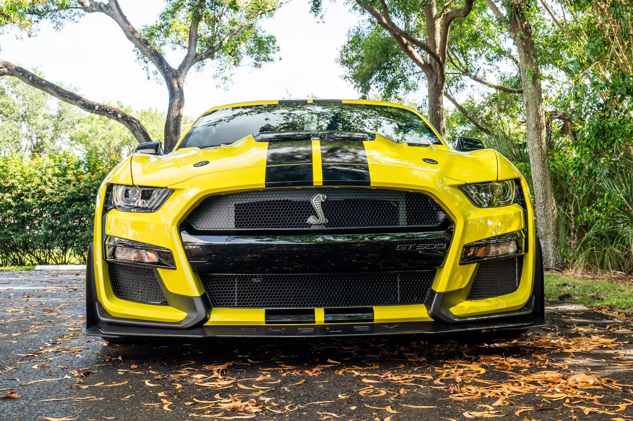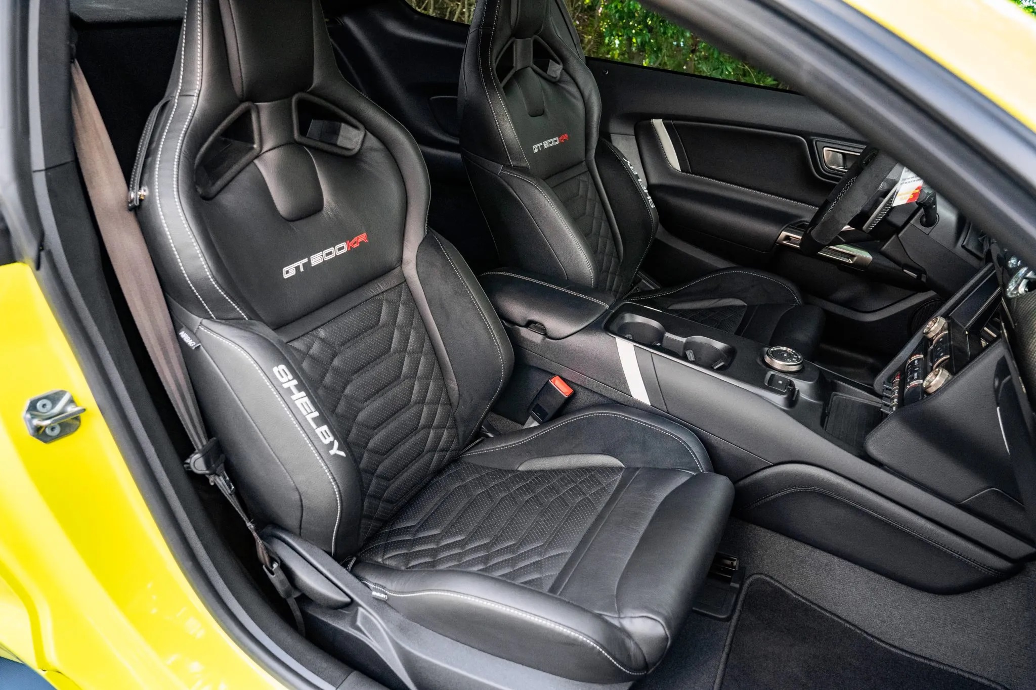 One of just 180 GT500KRs made from 2020 to 2022, this 2021 Shelby GT500, with only 288 miles, features the Carbon Fiber Track Pack and Technology package. It is finished in Grabber Yellow with black stripes, GT500KR graphics, and a carbon-fiber diffuser, hood, and rear wing, with a well-appointed interior featuring Recaro seats in black leather with microsuede panels and GT500KR embroidery.