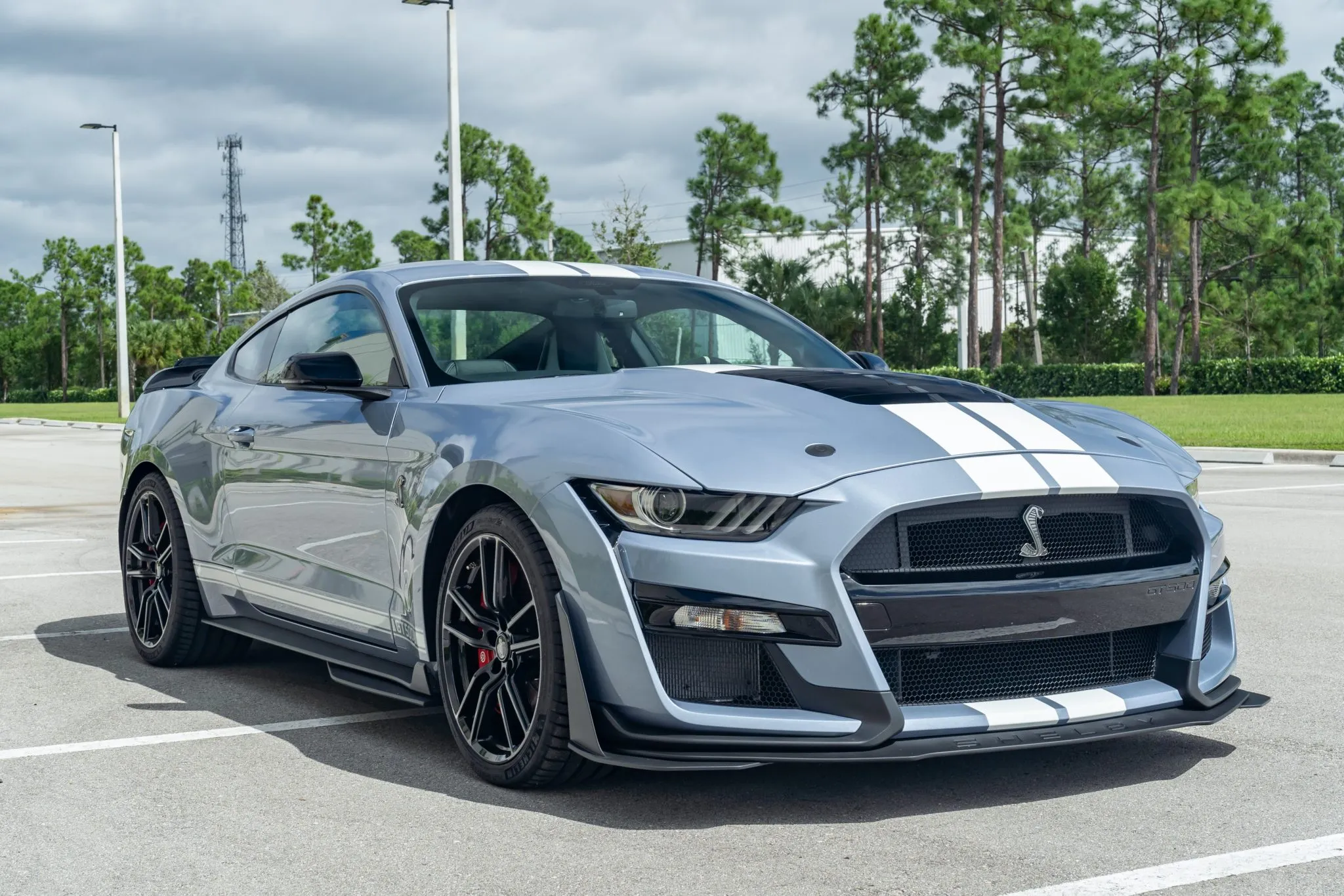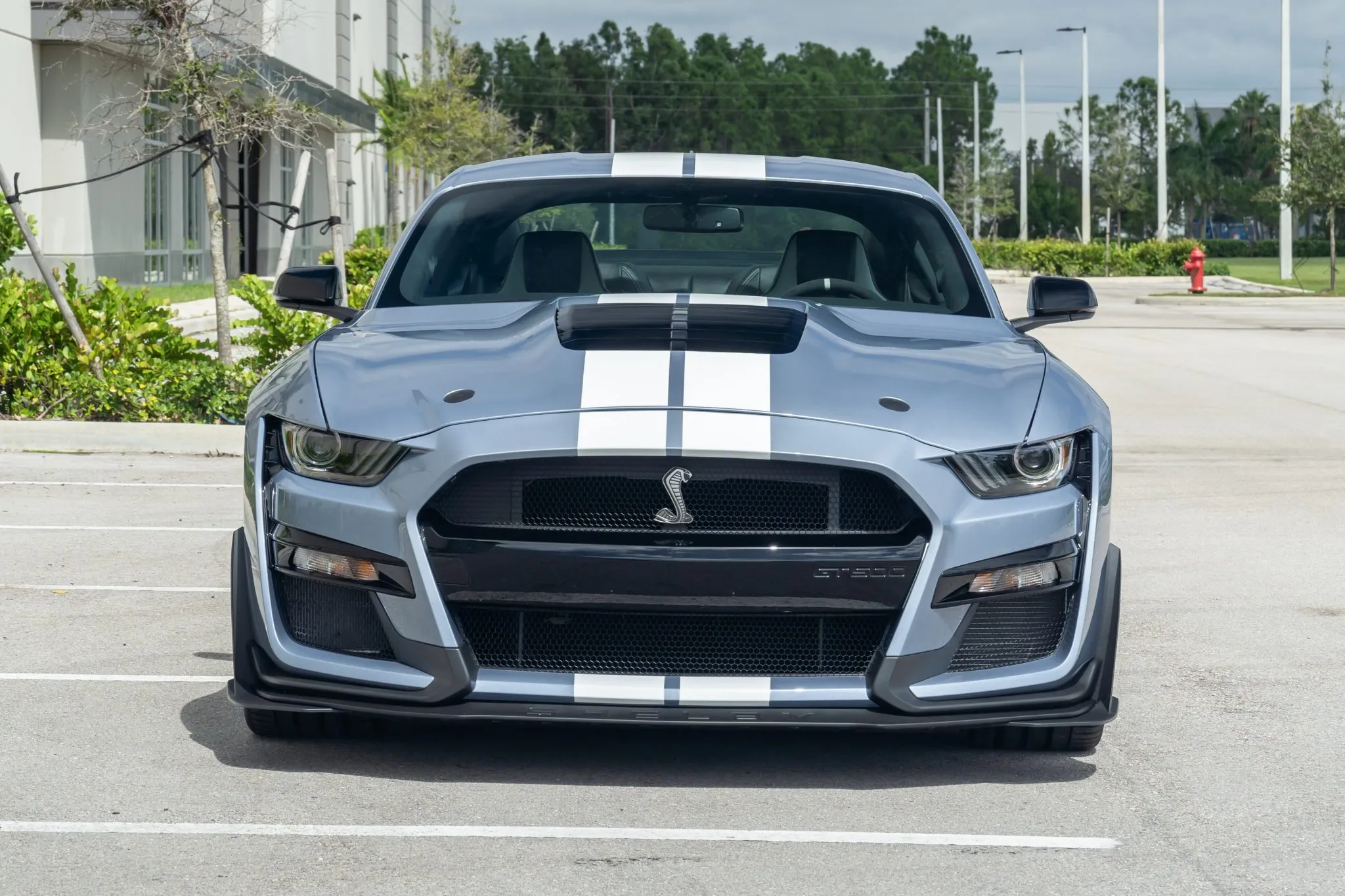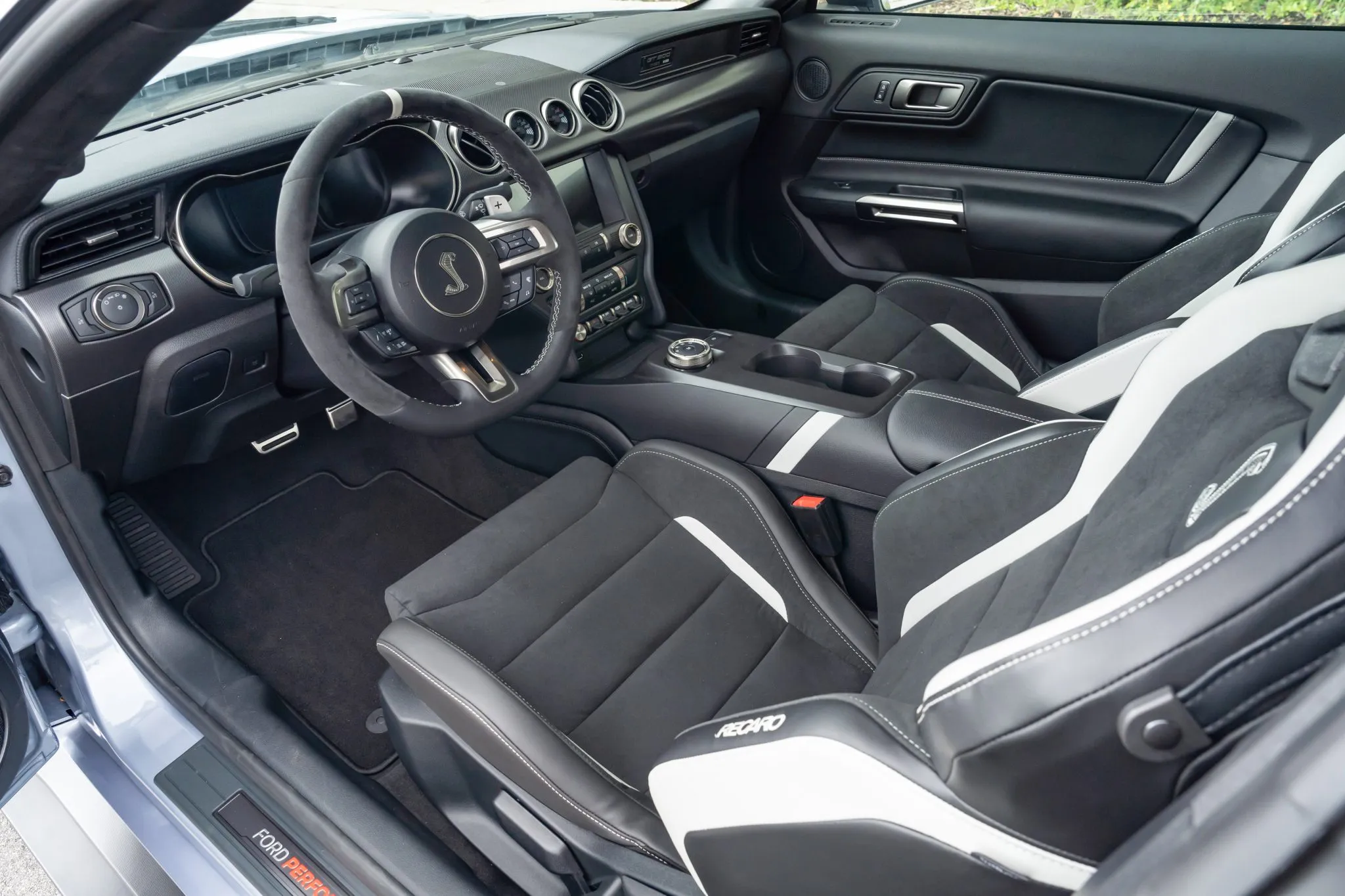 All Heritage Edition GT500s were painted in Brittany Blue—a color popular in 1967—and this one features Wimbledon White vinyl stripes running along the sides and over the top. This collector-grade car also comes with the Technology package, which enhances the Ebony interior with Recaro leather-trimmed seats, a premium Bang and Olufsen 12-speaker sound system, a voice-activated touchscreen, navigation, and blind spot/cross-traffic alert systems.