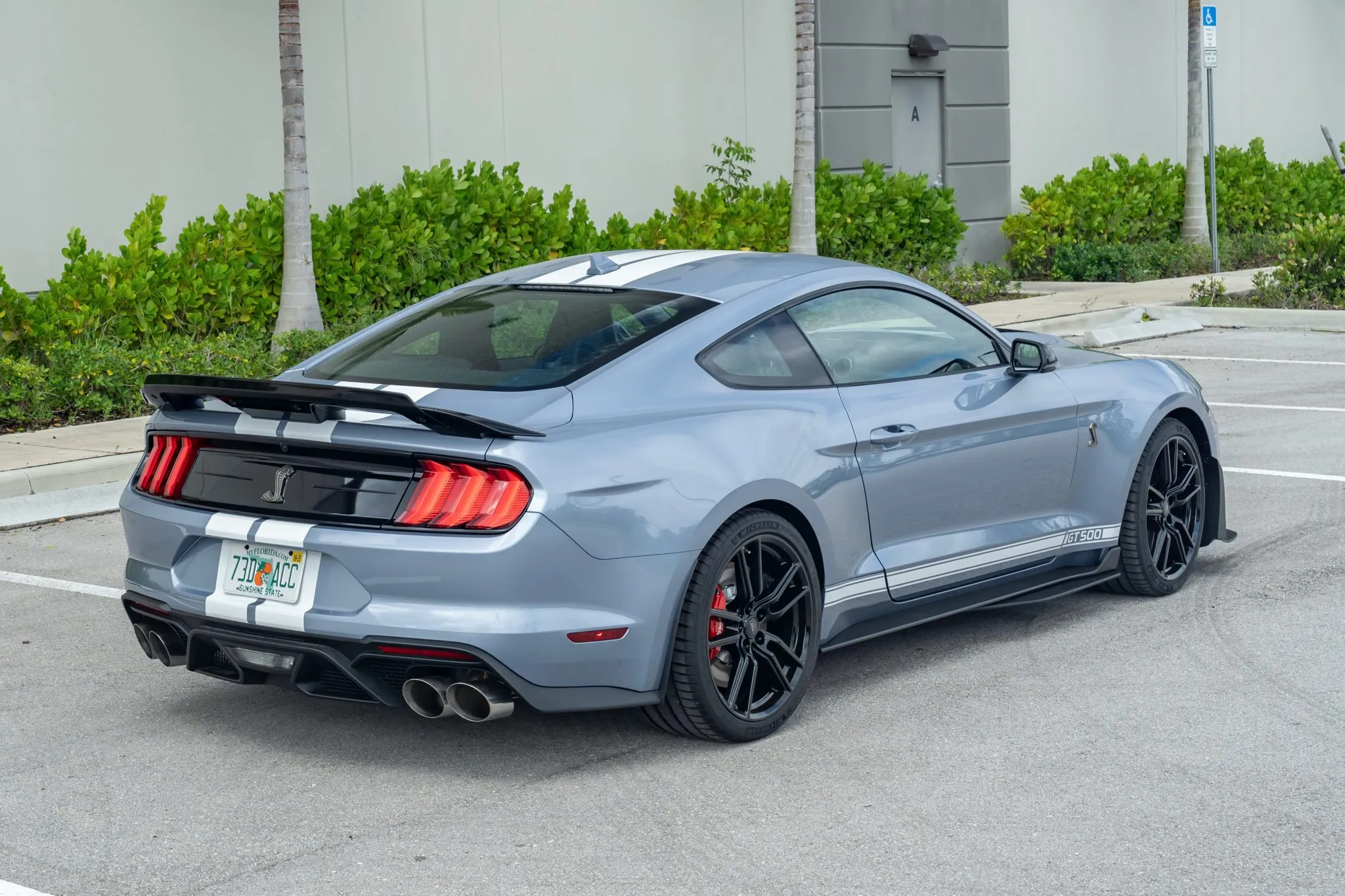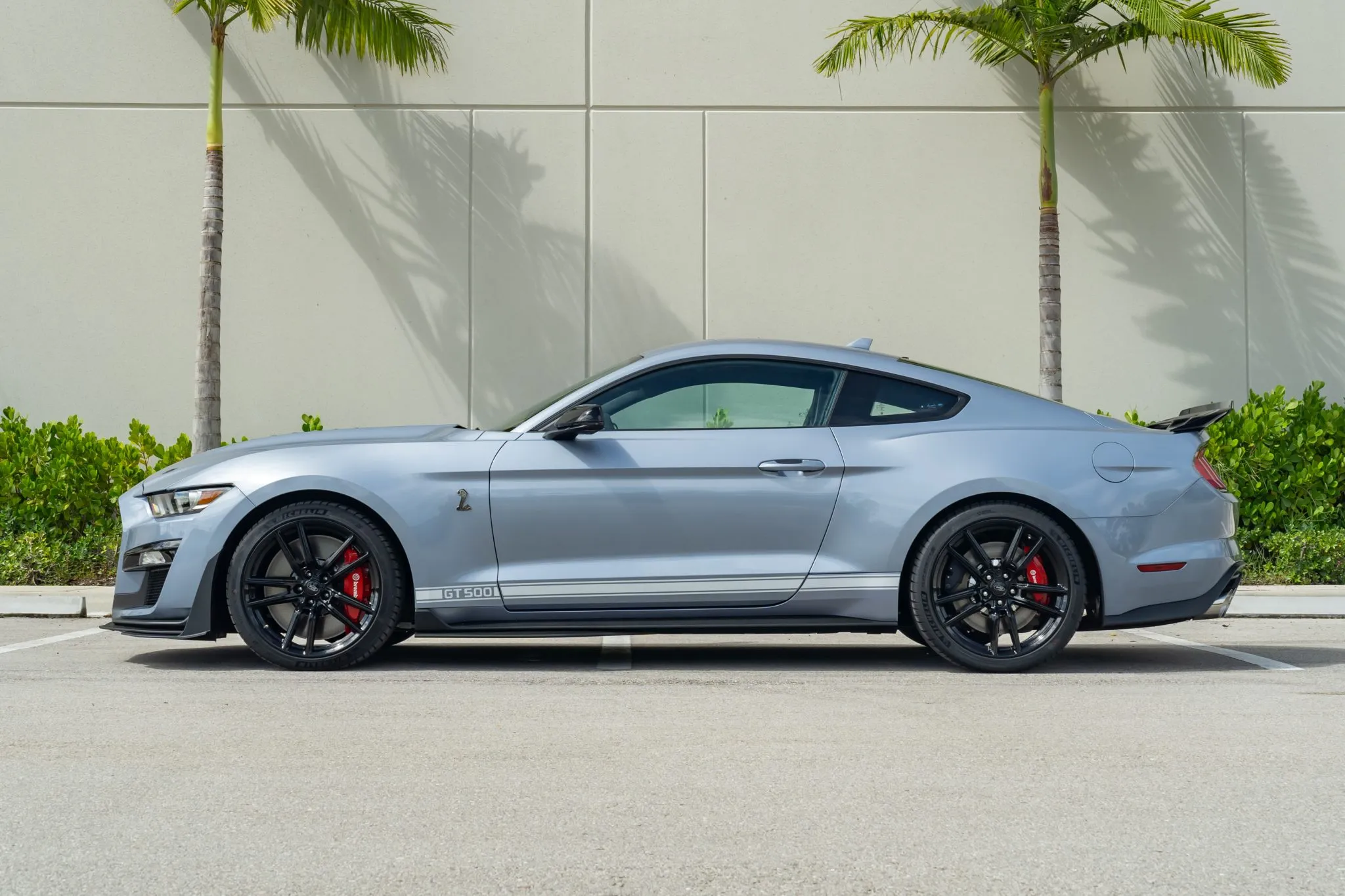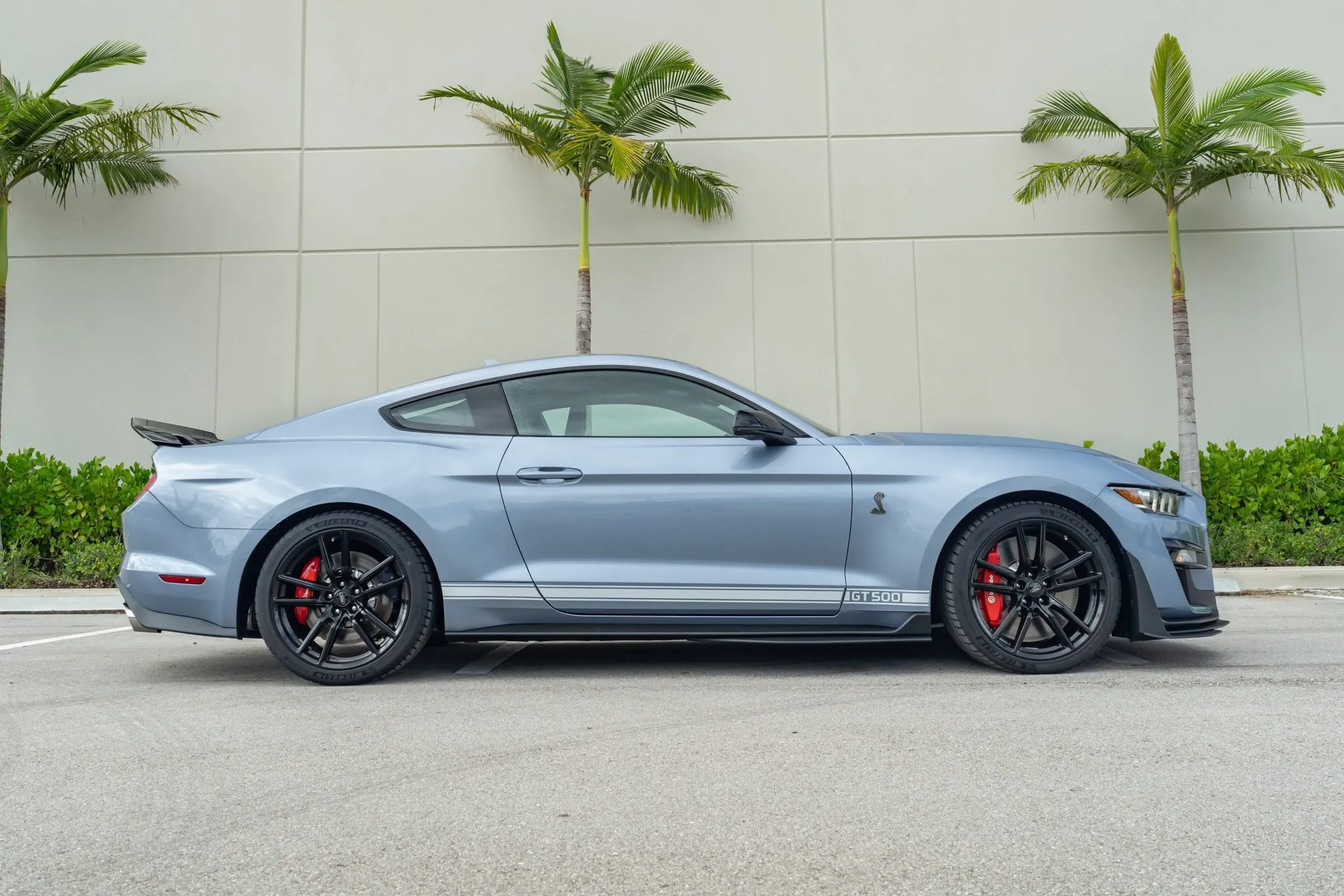All Heritage Edition GT500s were painted in Brittany Blue—a color popular in 1967—and this one features Wimbledon White vinyl stripes running along the sides and over the top. This collector-grade car also comes with the Technology package, which enhances the Ebony interior with Recaro leather-trimmed seats, a premium Bang and Olufsen 12-speaker sound system, a voice-activated touchscreen, navigation, and blind spot/cross-traffic alert systems.