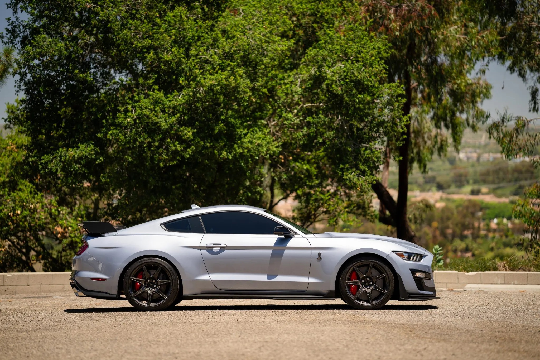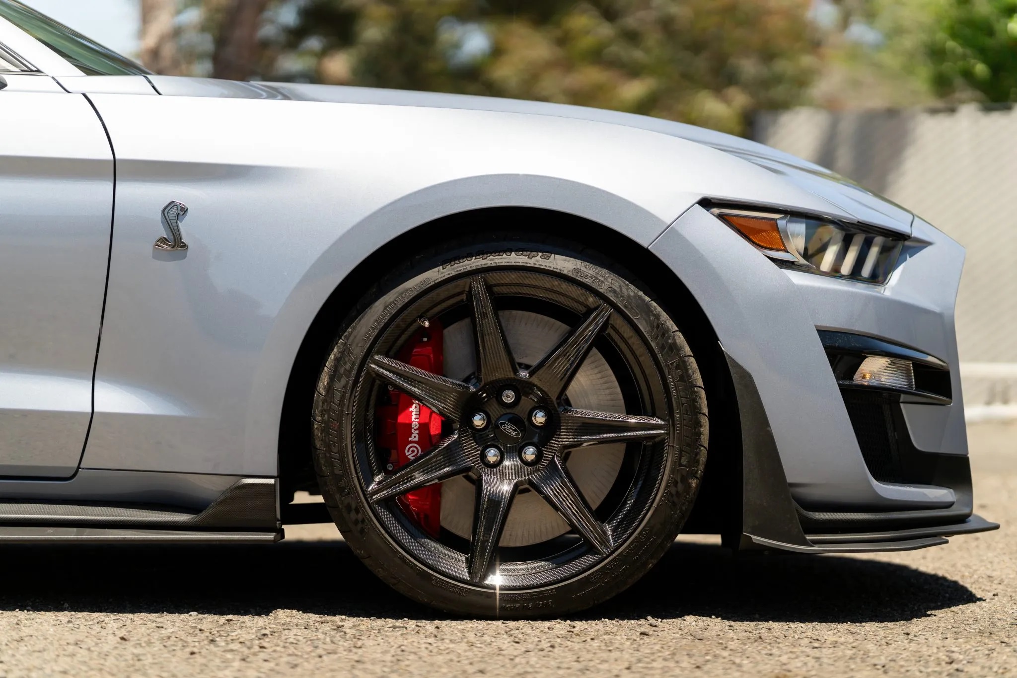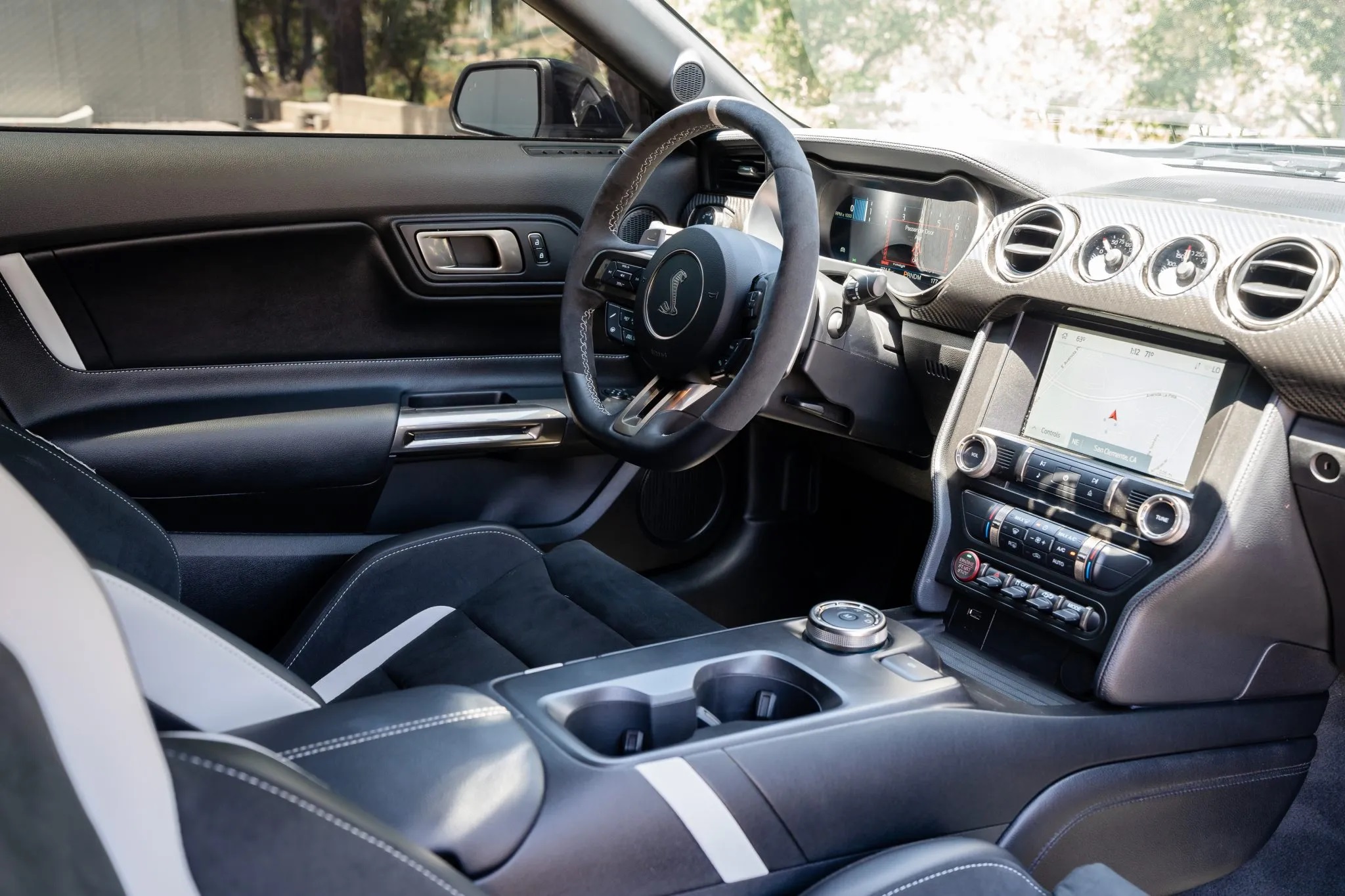 This GT500 also includes the $18,500 Carbon Fiber Track Pack, which features 20-inch exposed carbon-fiber wheels with locks, an exposed carbon fiber rear wing, adjustable strut-top mounts, Recaro leather-trimmed seats, a rear-seat delete, and carbon fiber details on the instrument panel.