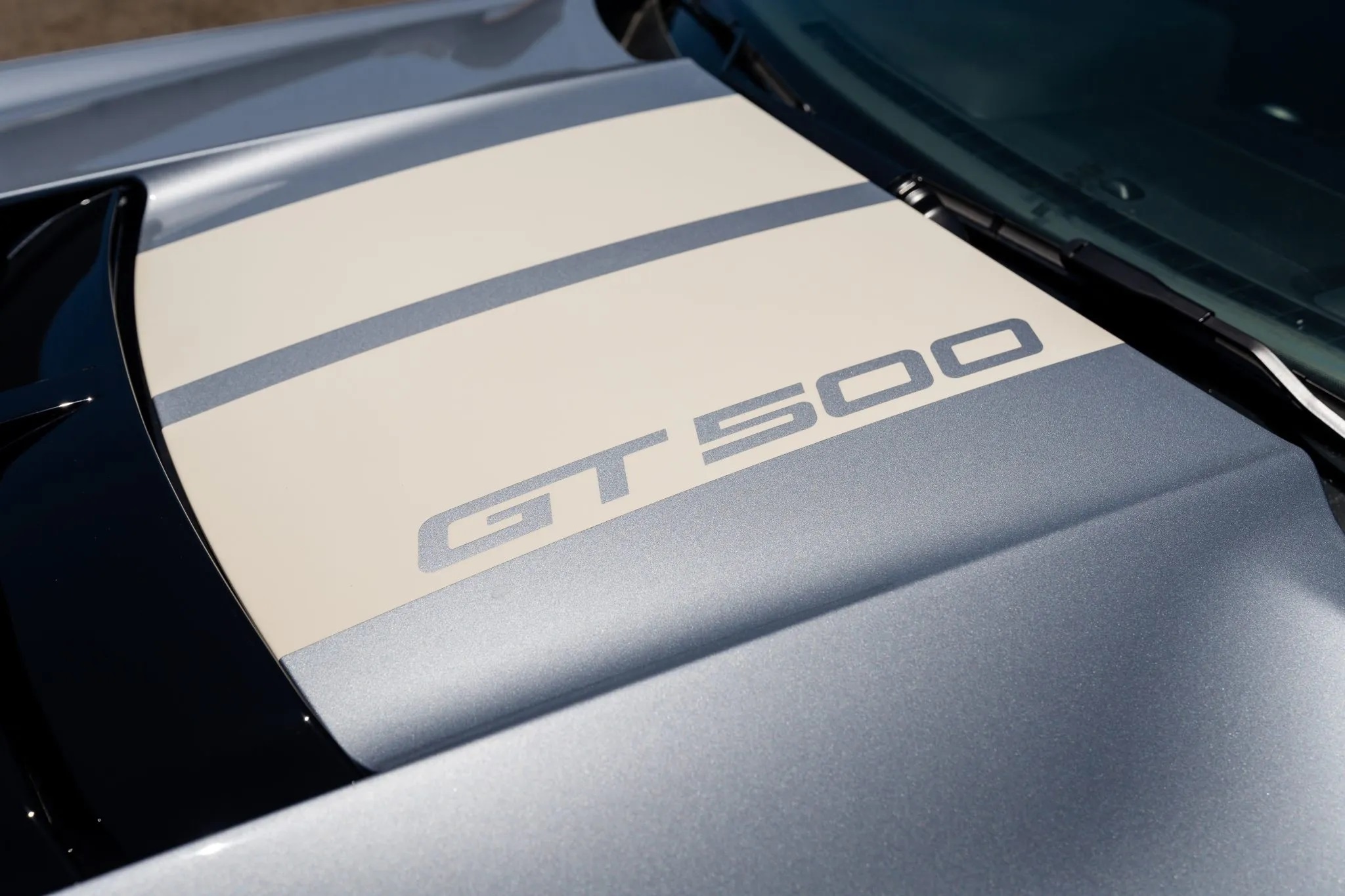Each Heritage Edition GT500 was painted in Brittany Blue, a nod to the 1967 model, and features hand-painted white over-the-top stripes, a $10,000 option in addition to the $2,140 cost of the Heritage Edition package.