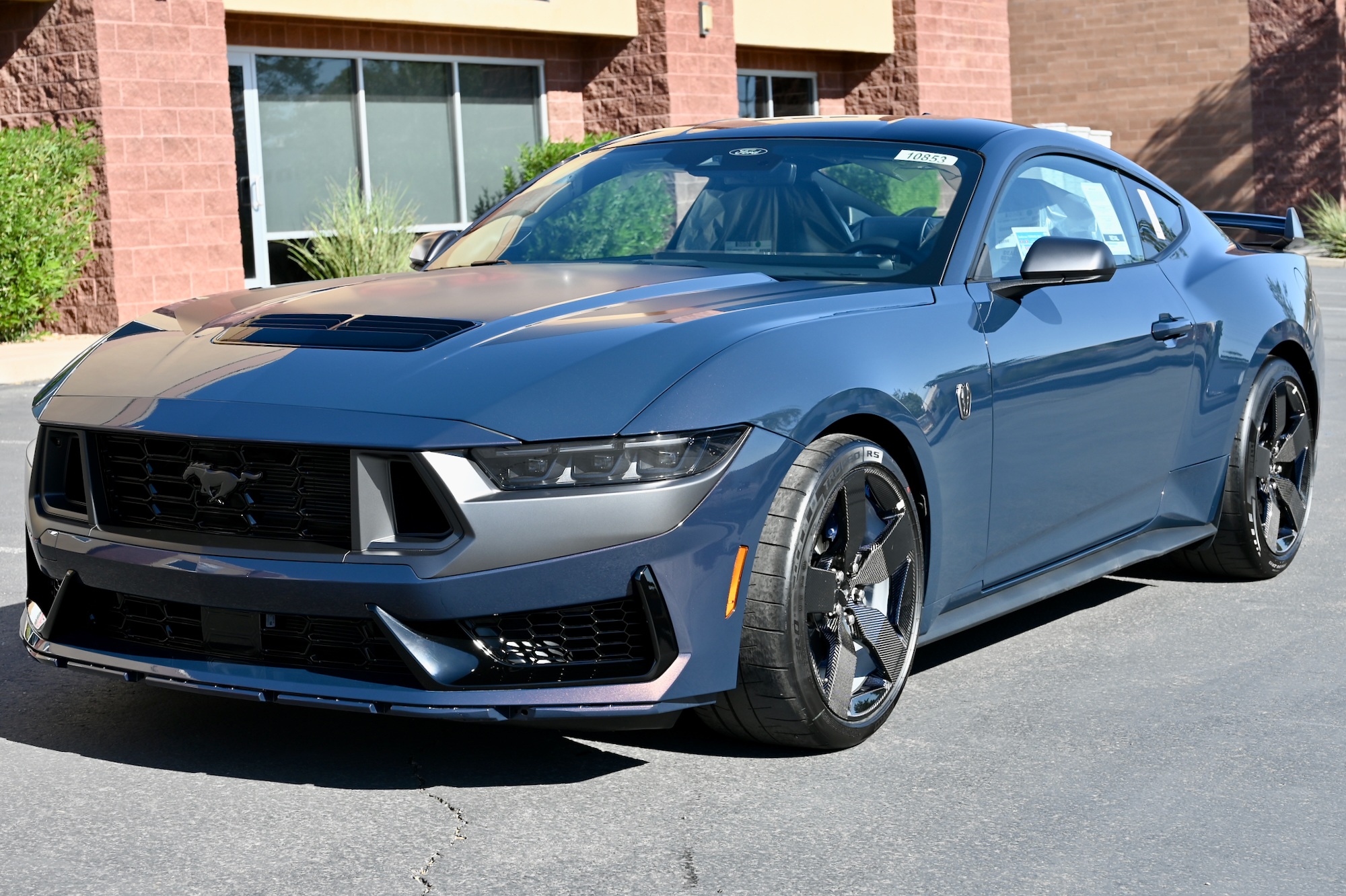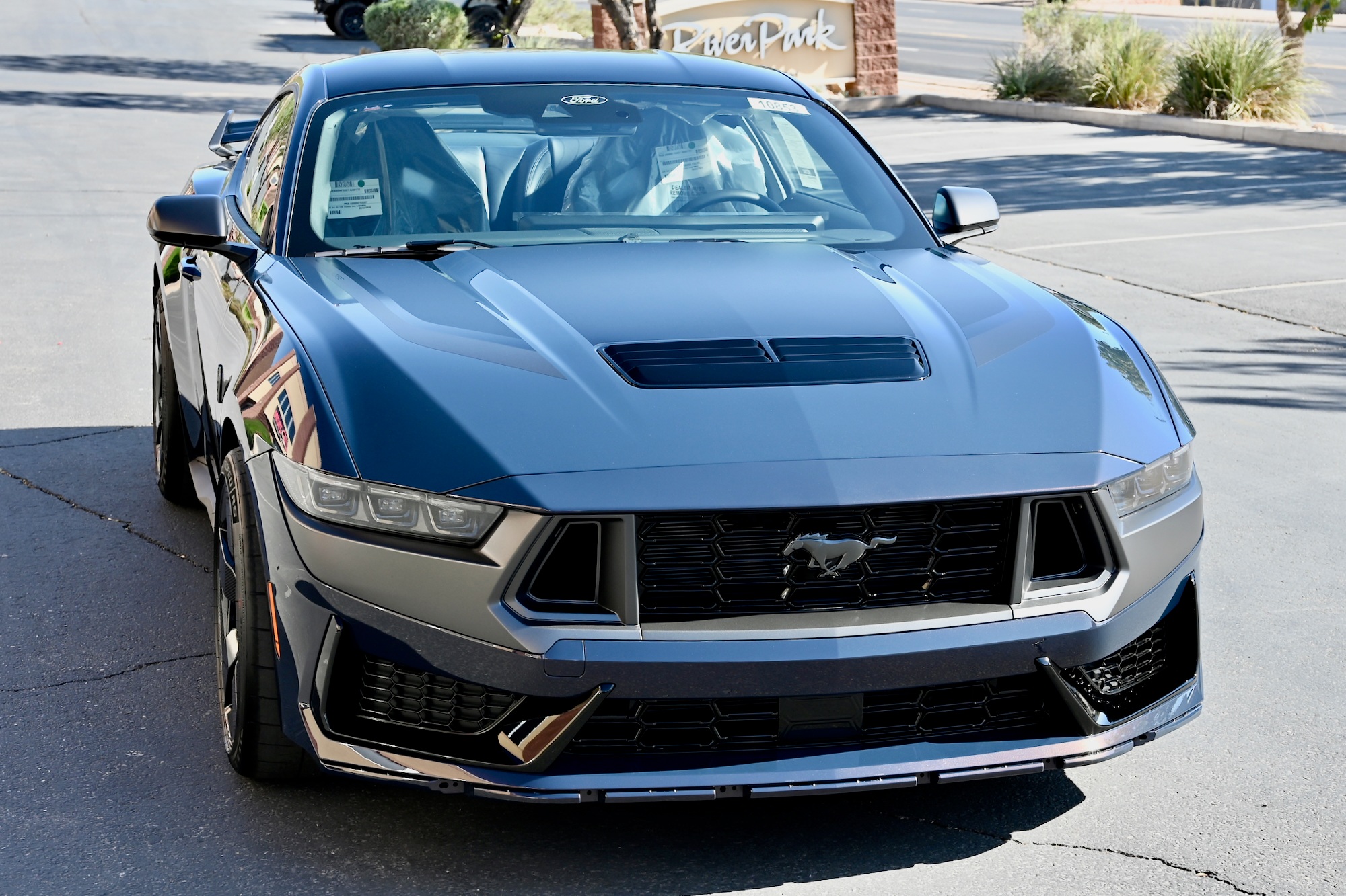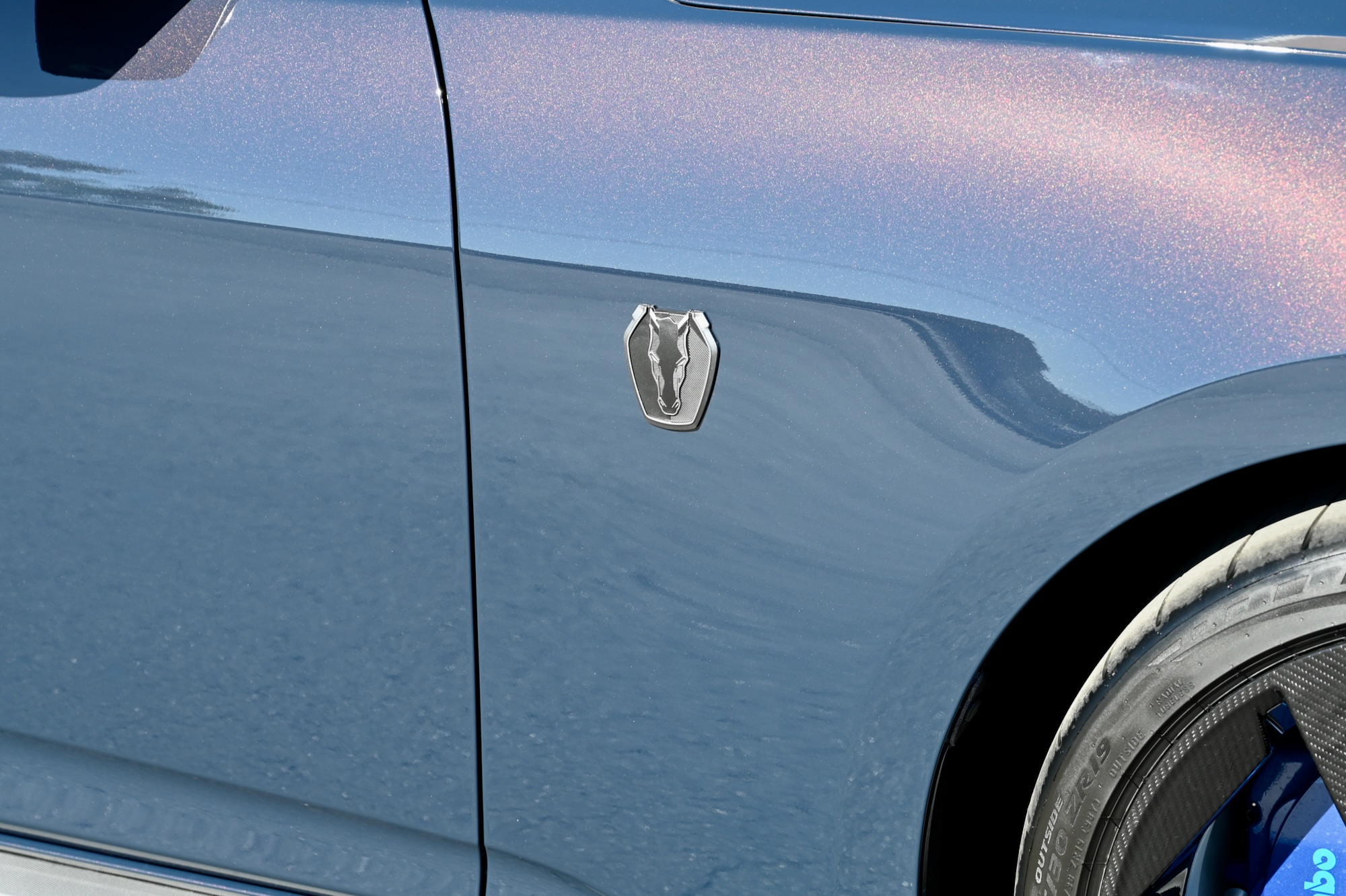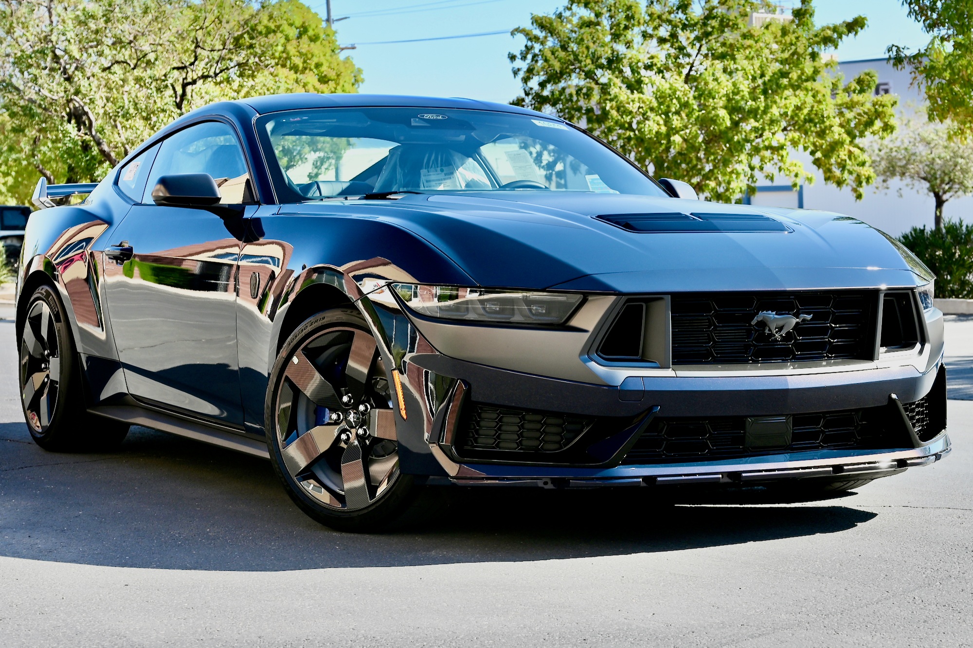 The Dark Horse’s Blue Ember Metallic paint is accentuated by a grey graphic surrounding the LED headlamps and trapezoidal air intakes. The aggressive styling is further enhanced by a revised front bumper, front splitter, lower side skirts, and darkened quad exhaust tips integrated into the updated rear fascia.