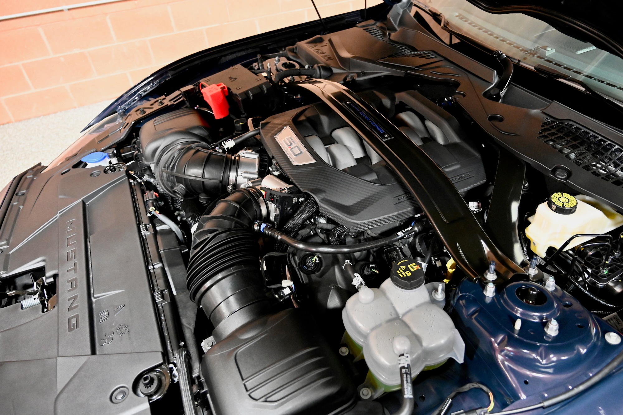 Ford’s engineers equipped the Dark Horse with advanced technology to elevate its driving dynamics. Selectable-effort electronic power steering, a specialized powertrain and chassis tune, and MagneRide damping all contribute to exceptional handling. Paired with Pirelli P-Zero tyres mounted on lightweight 19-inch carbon fibre wheels, the Dark Horse is built for precision. Braking is equally impressive, thanks to Brembo disc brakes with massive 15.4-inch front and 14-inch rear rotors, complemented by striking blue-painted callipers.