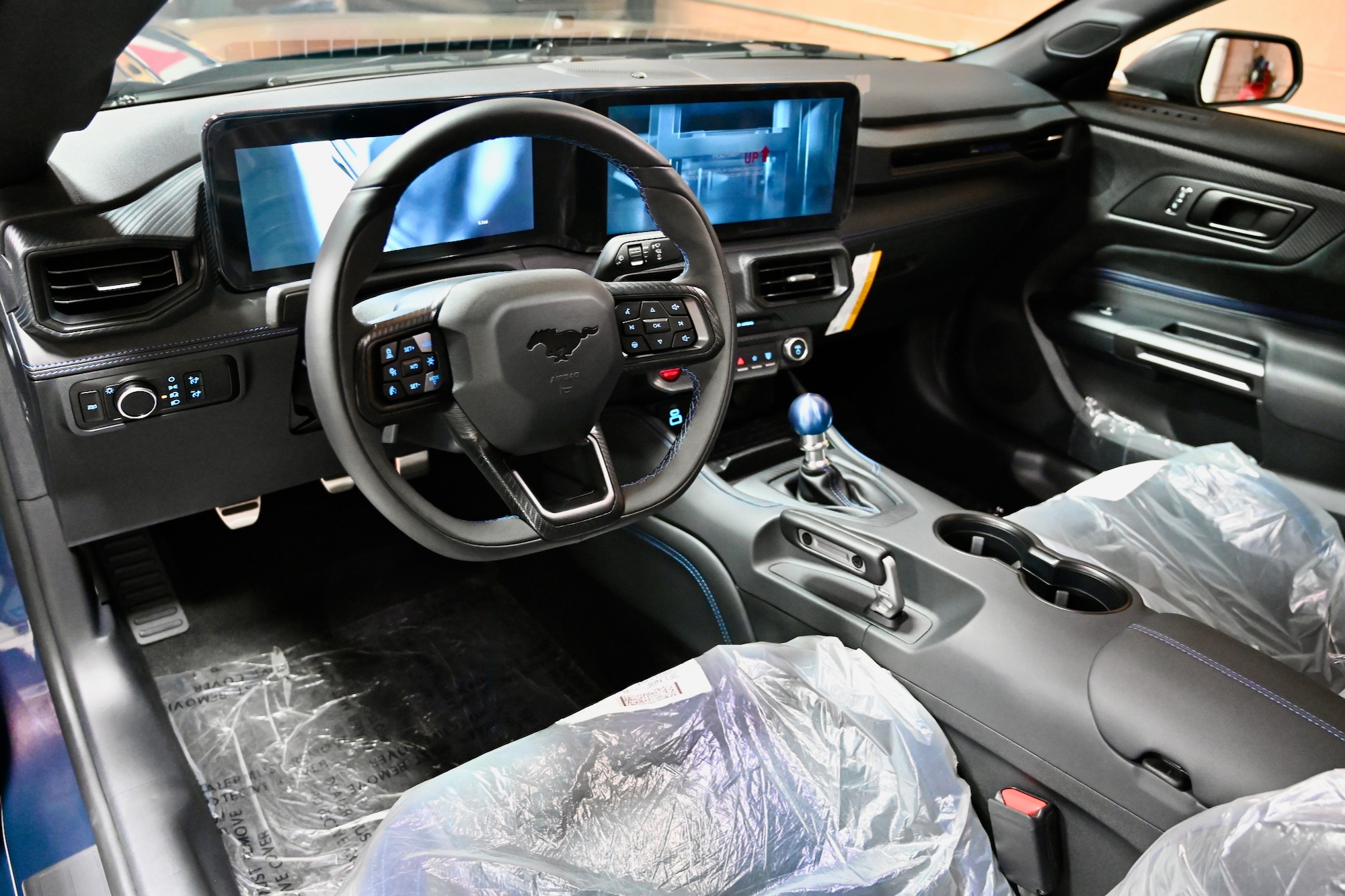 Inside, the Dark Horse offers a driver-centric cabin. Highlights include a fully programmable widescreen display, push-button start, and Recaro seats with black-and-blue upholstery that extends to the door panels. The comfort features include a heated leather and suede steering wheel, dual-zone climate control, and the premium Bang & Olufsen 12-speaker sound system.