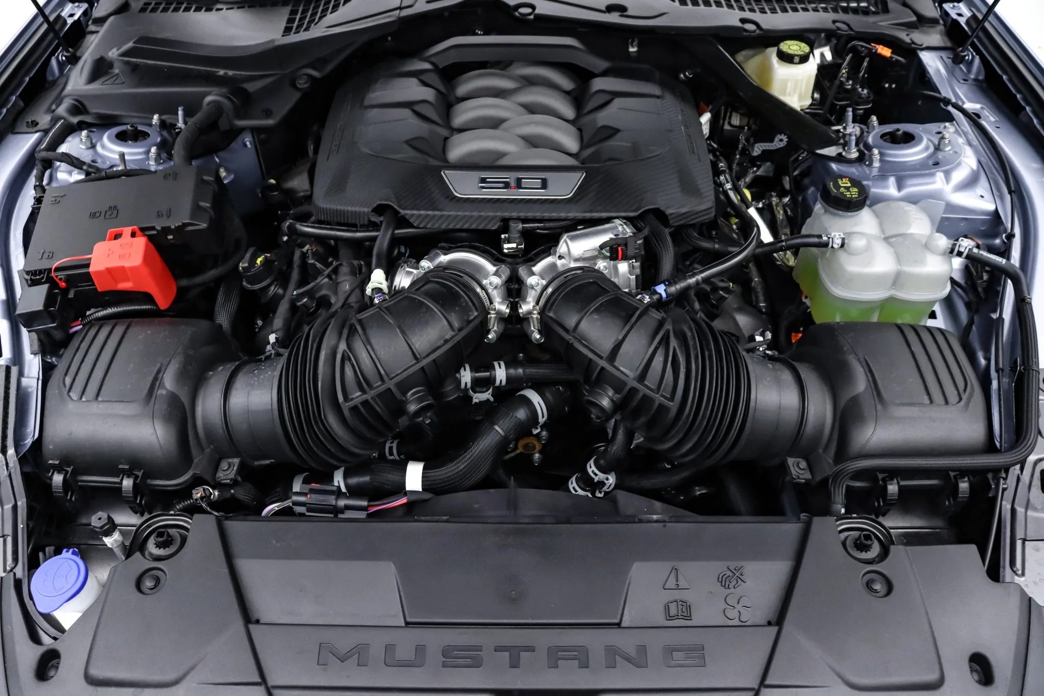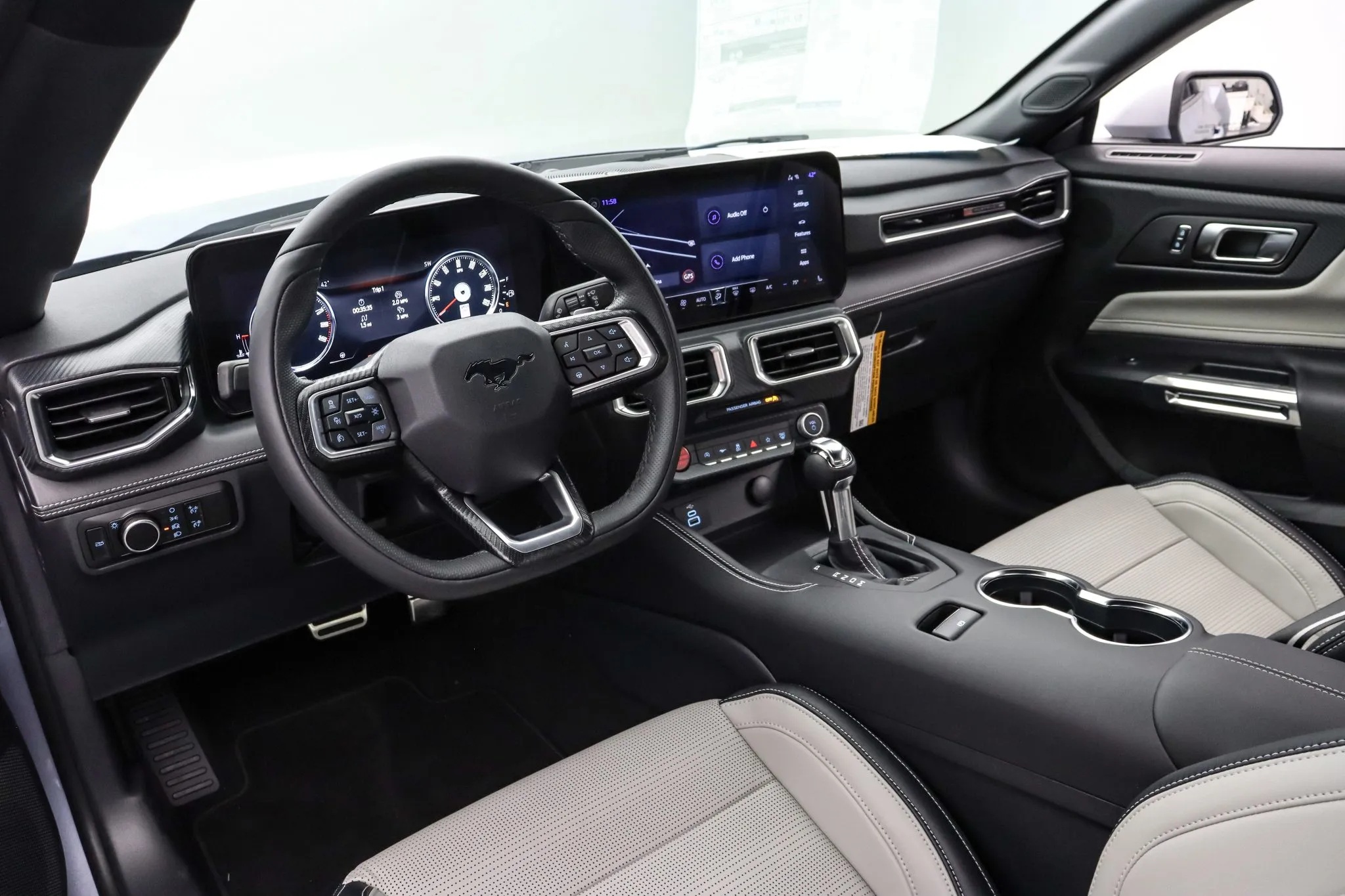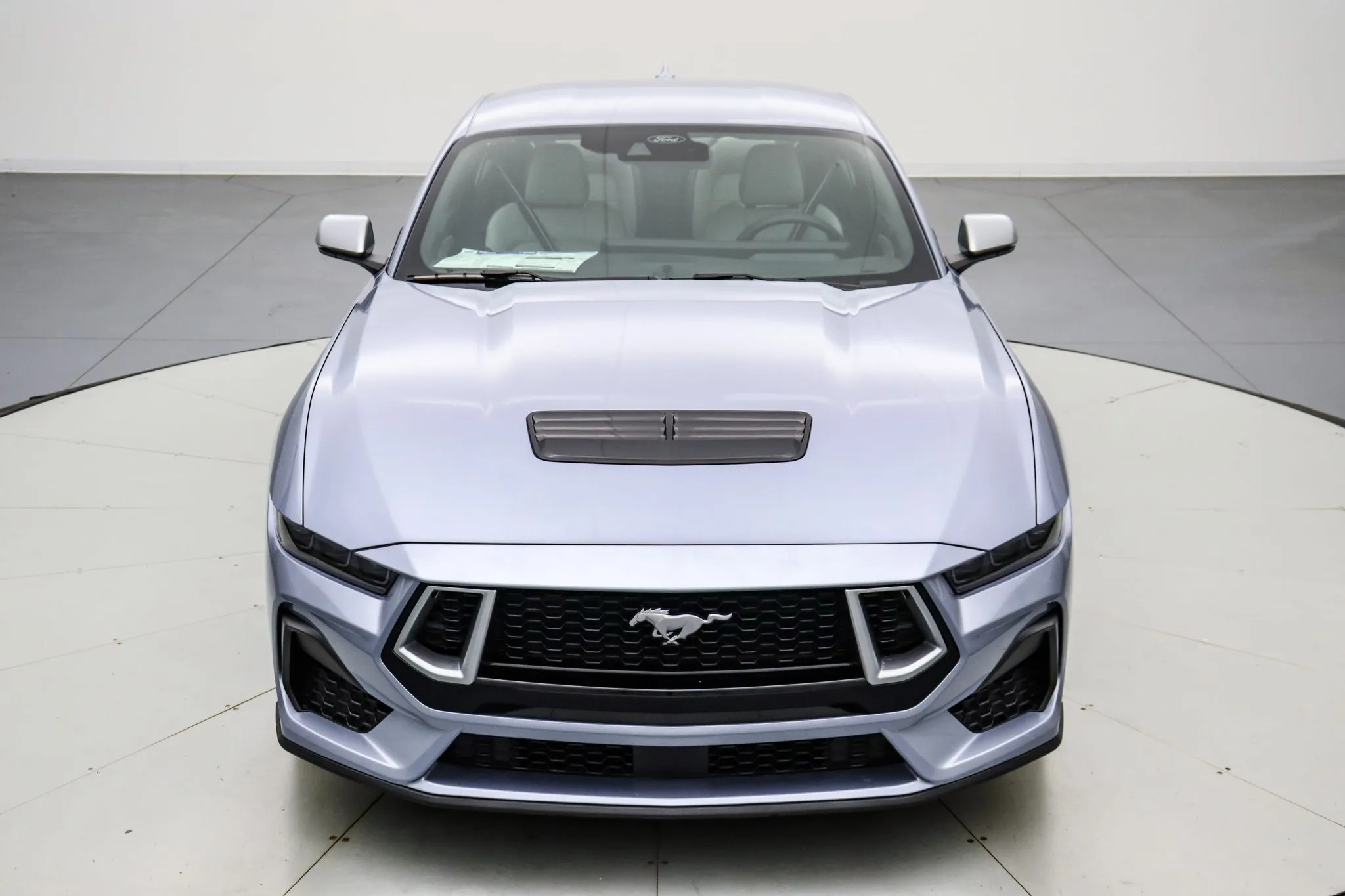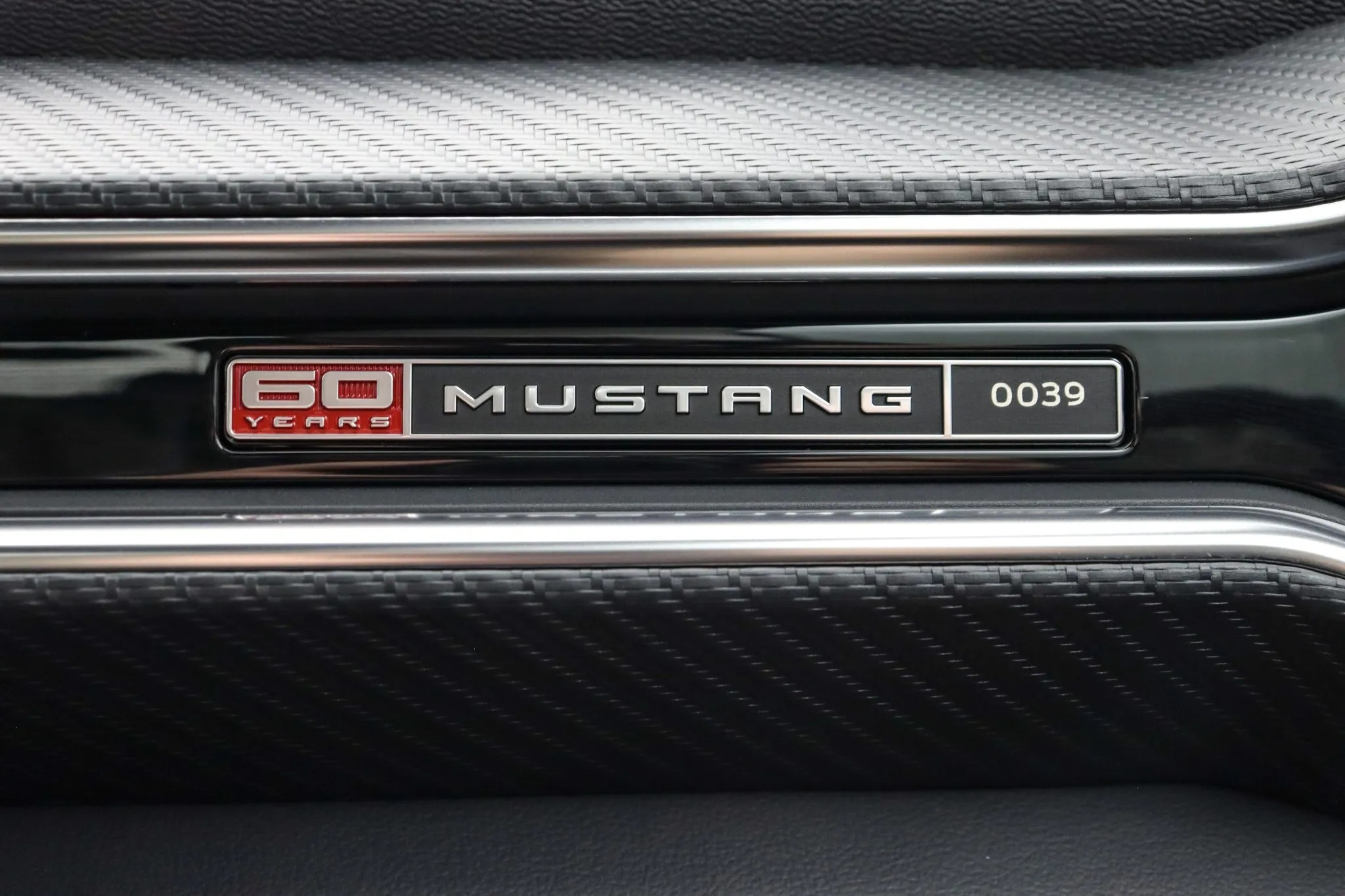 The wheels complement the car’s aesthetic, and silver mirror caps for most colors, while Wimbledon White models receive body-colored caps. Each vehicle in this limited run features a serialized dash plaque, emphasizing its exclusivity. The package also includes a dark-finished grille inspired by the Mustang Night Pony package, with silver accents to match the mirror caps. Inside, the space gray interior pays tribute to past Mustang models, featuring a retro-inspired combination of white or tan seats against a black background.