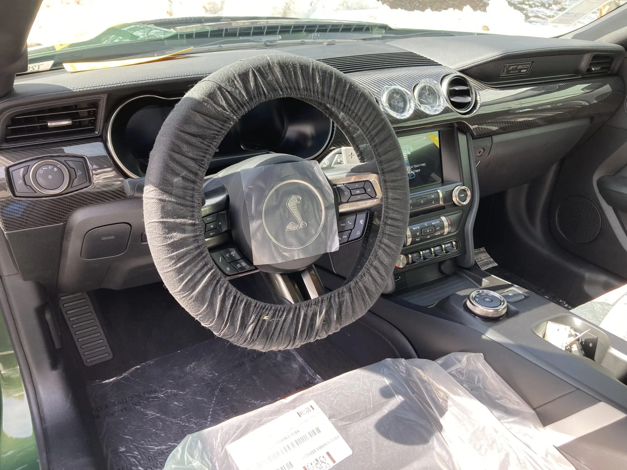 The 5.2-liter Predator V8 engine is hand-assembled and rated at 760 horsepower and 625 lb-ft of torque, with power delivered to the rear wheels via a Tremec seven-speed dual-clutch automatic transmission and a Torsen limited-slip differential with 3.73:1 gearing. The passenger-side dashboard plaque identifies this GT500 as chassis 1031, and the digital odometer indicates 60 miles, with 45 of those added by the selling dealer.
