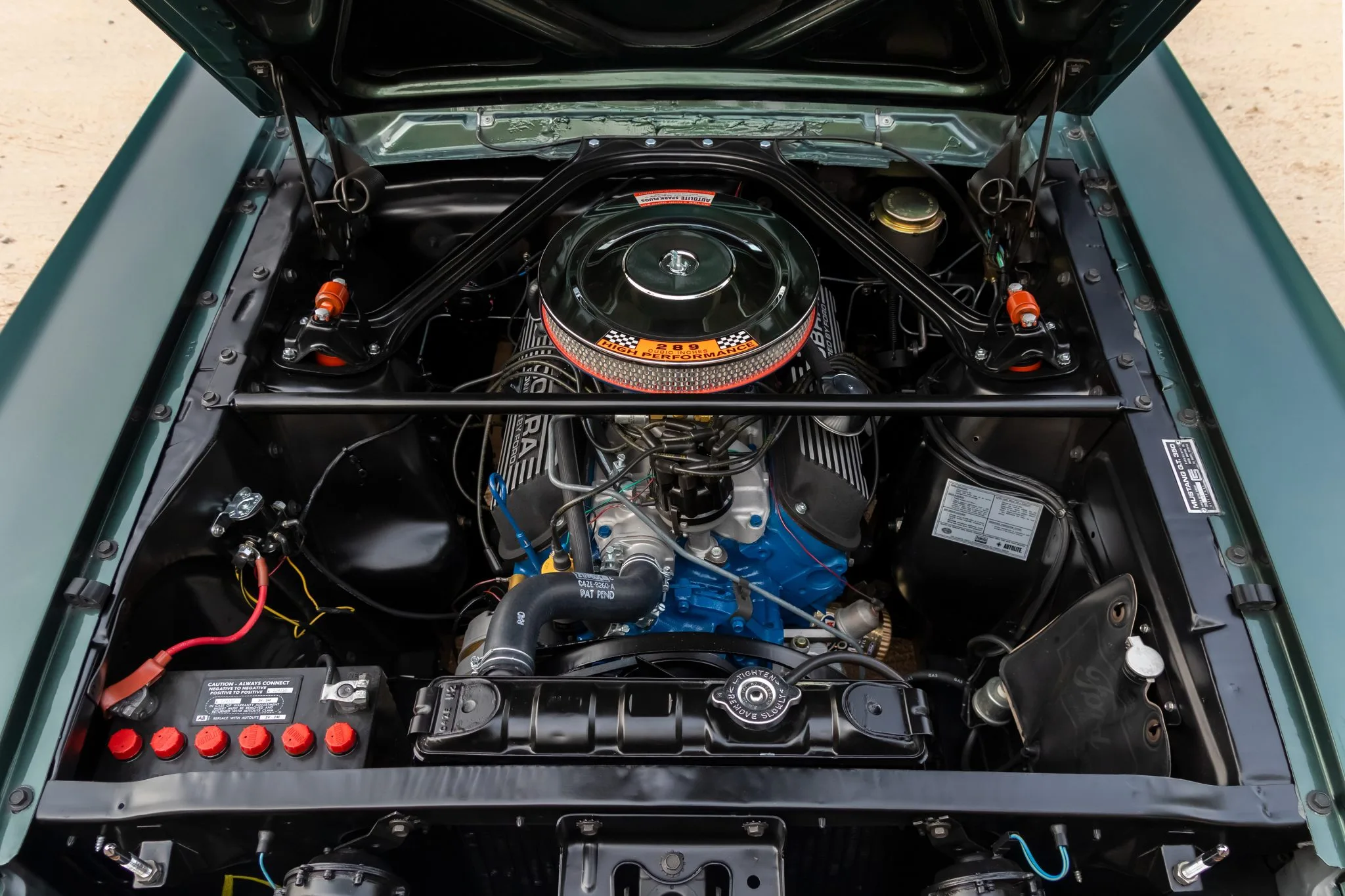 Power is sourced from a 289ci Windsor V8 that’s been fitted with a four-barrel Holley 715-cfm carburetor and a cast-aluminum high-rise intake manifold. Additional GT350-specific features include a finned-aluminum “T” oil pan with hinged baffles, open-letter valve covers, and tri-Y exhaust headers.