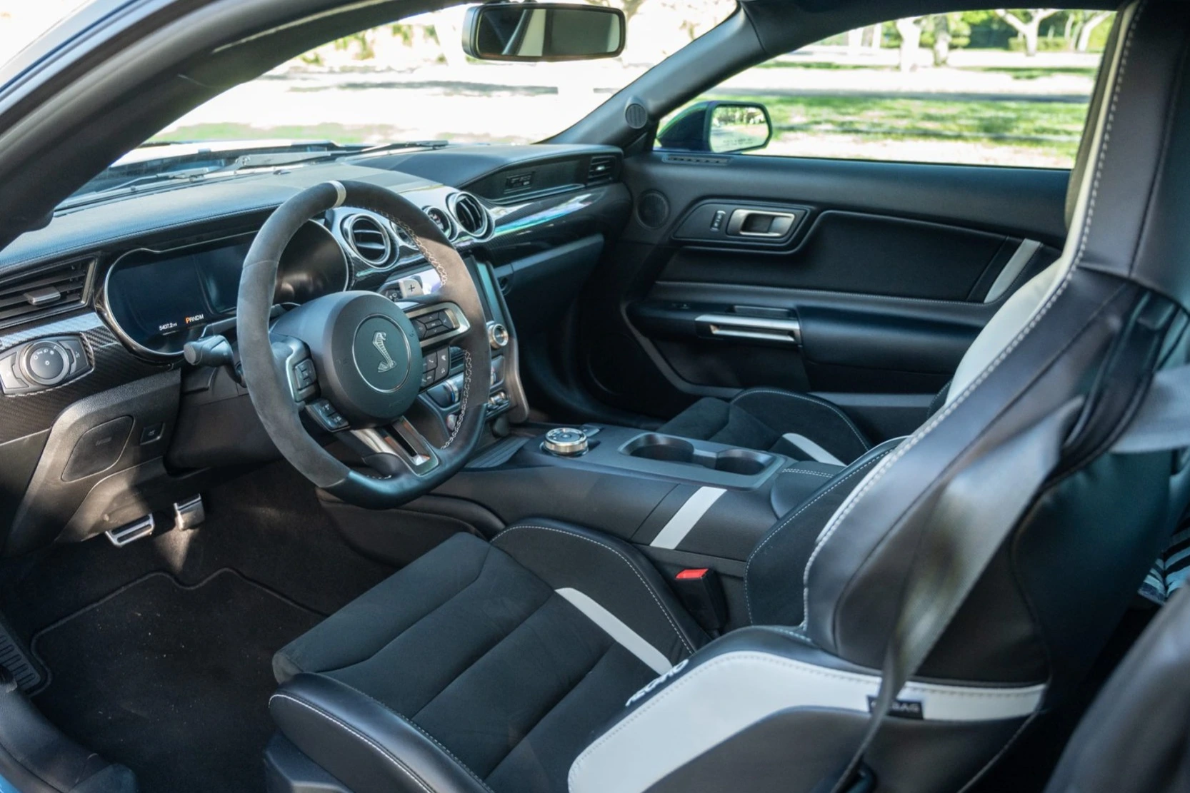 Our example offered here comes finished in Ford Performance Blue with over-the-top Oxford White center stripes and the Ford’s Carbon Fiber Track Pack. This package includes 20-inch carbon fiber wheels, a revised front fascia with splitter wickers and a manually adjustable carbon-fiber wing.