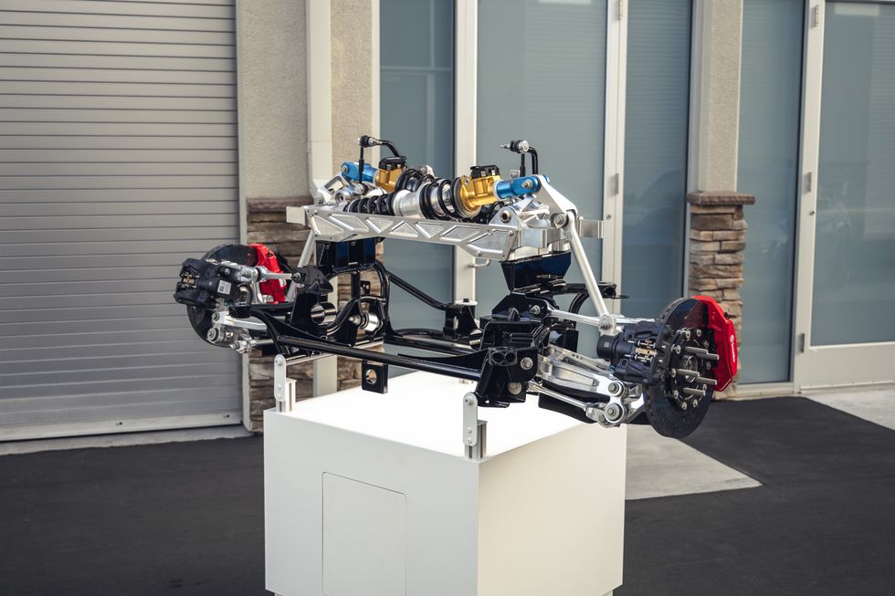 Up front, the system uses short-long arm suspension with active ride height and spring rate. This allows for the car to corner flat, varying the stiffness of the outer suspension to keep the tire with the most force going through it planted hard into the road.