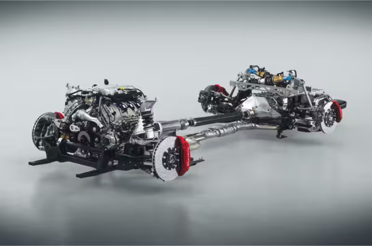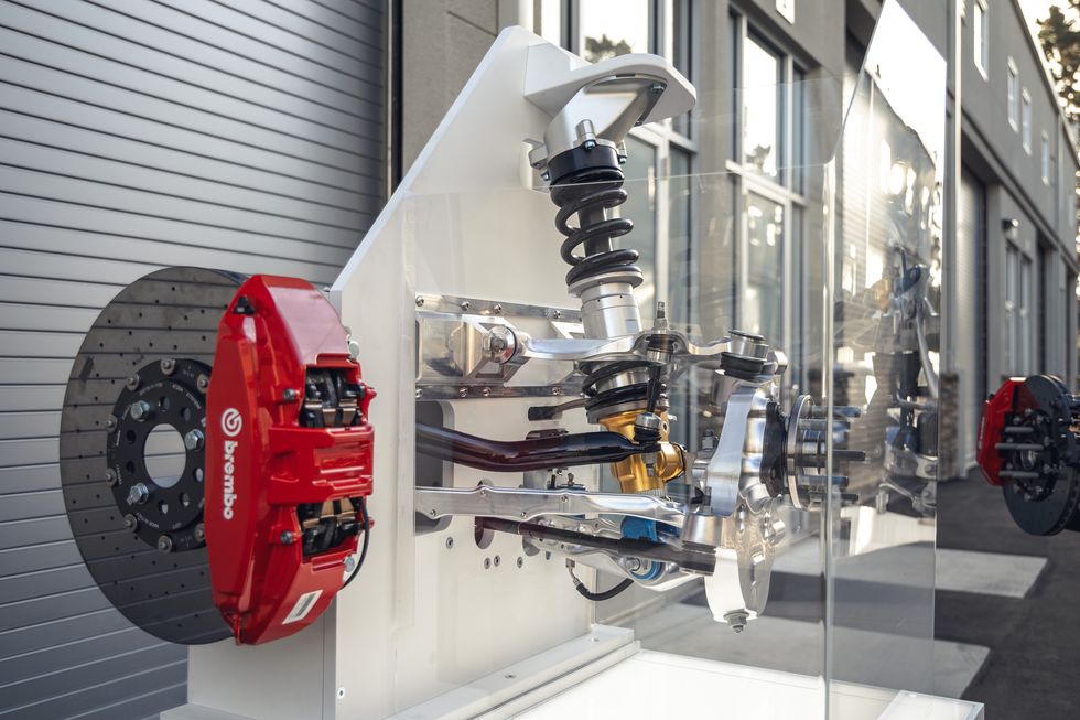 Out back, an integral-link pushrod and rocker arm system is in place, with the main shock absorber and coil over springs are mounted to tubular frame cross-body brace, which itself is securely mounted to the rear-mounted transaxle. This architecture, once more lifted straight from the GT3 car but modified to include the active components, allows for a motion ratio of pushrod to damper at a perfect 1:1.