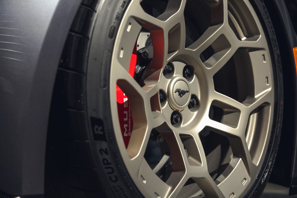 This placement is lifted directly from the GT3 race car, and has the engine entirely, and quite literally by a millimeter, behind the chassis front axle line, but ahead of the driver. That means that the driver and passenger seats have been shoved back and down so that the firewall can be moved back, and puts a lot more weight between the wheels than over them. The result is a nearly perfect 50/50 weight distribution, giving the Mustang GTD exceptional cornering.