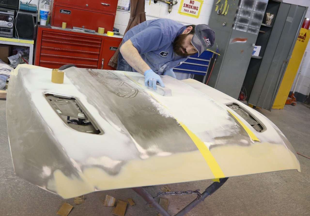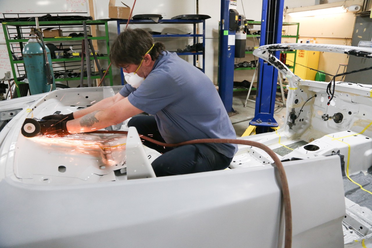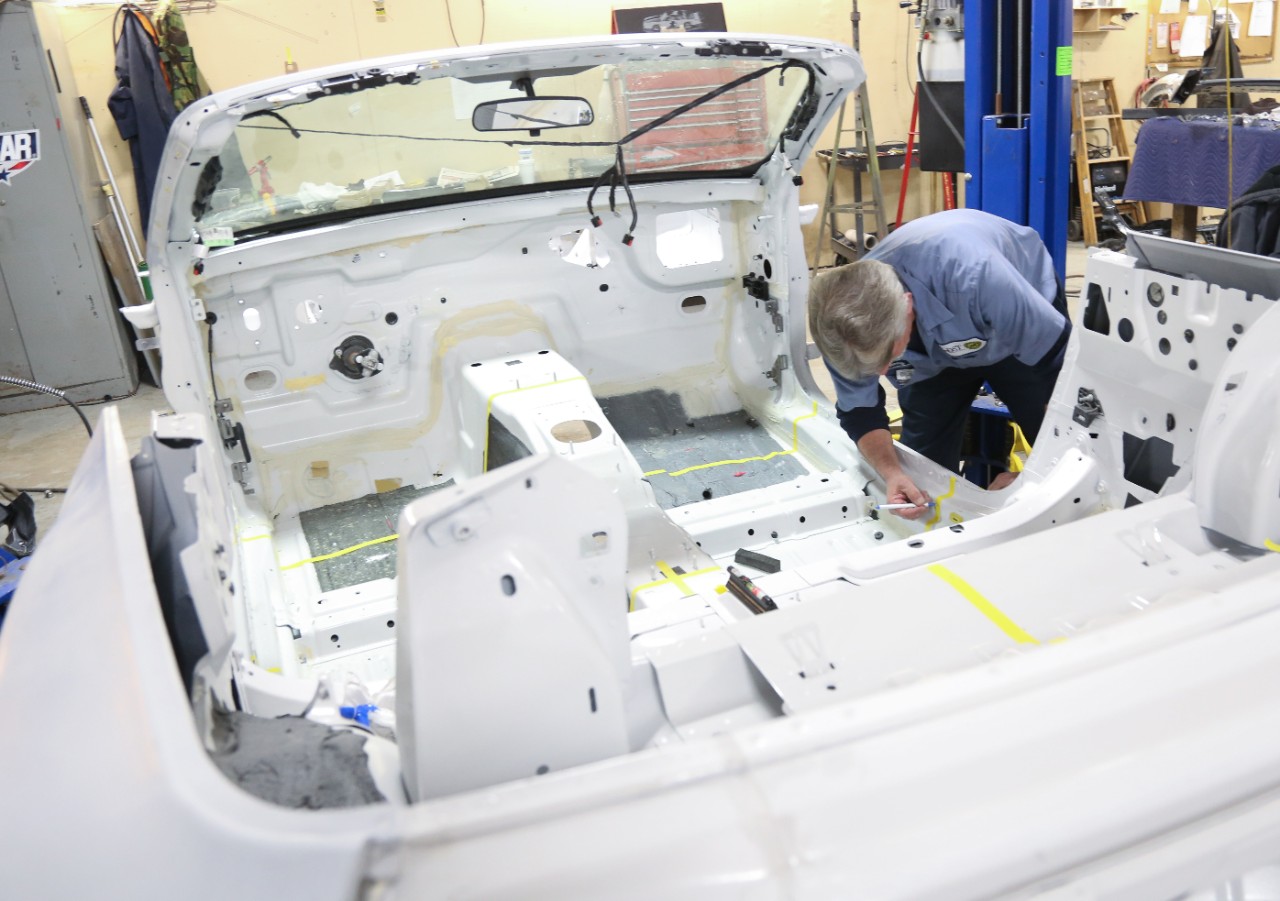 In preparing for the 2014 event, the team at DST worked with two early prototype Mustang convertible body shells. The car that would ultimately make the trip to New York was completely stripped down and the surface cleaned up to make sure everything looked perfect before it was sectioned and painted.