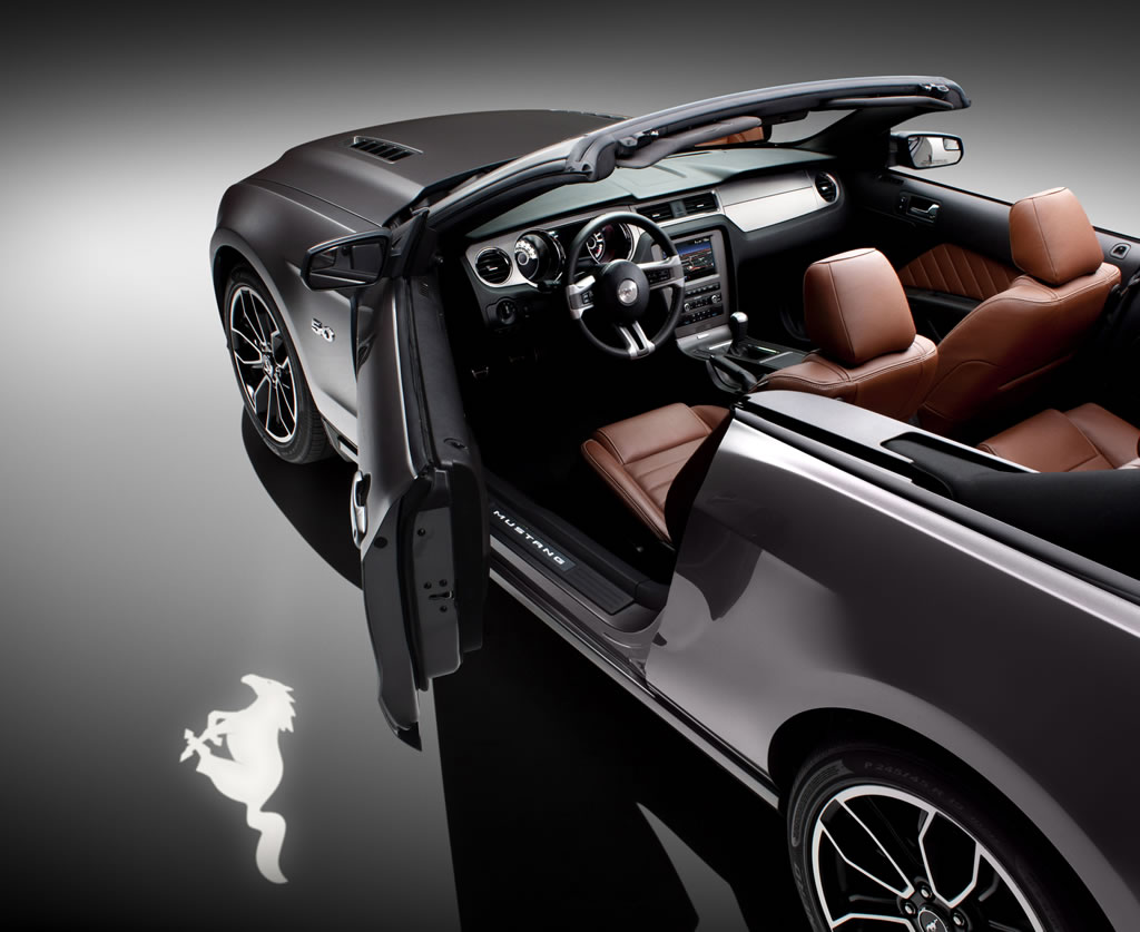One of the new features found on the 2013 Mustang is the pony projection light coming from the underside of the side-mirrors.  This new feature is a first for Ford and what better vehicle to debut it on than a Mustang with the iconic image of the running horse projected on the ground.  The pony image is activated when the driver unlocks the door.  Check out a high-res photo of the new feature below.