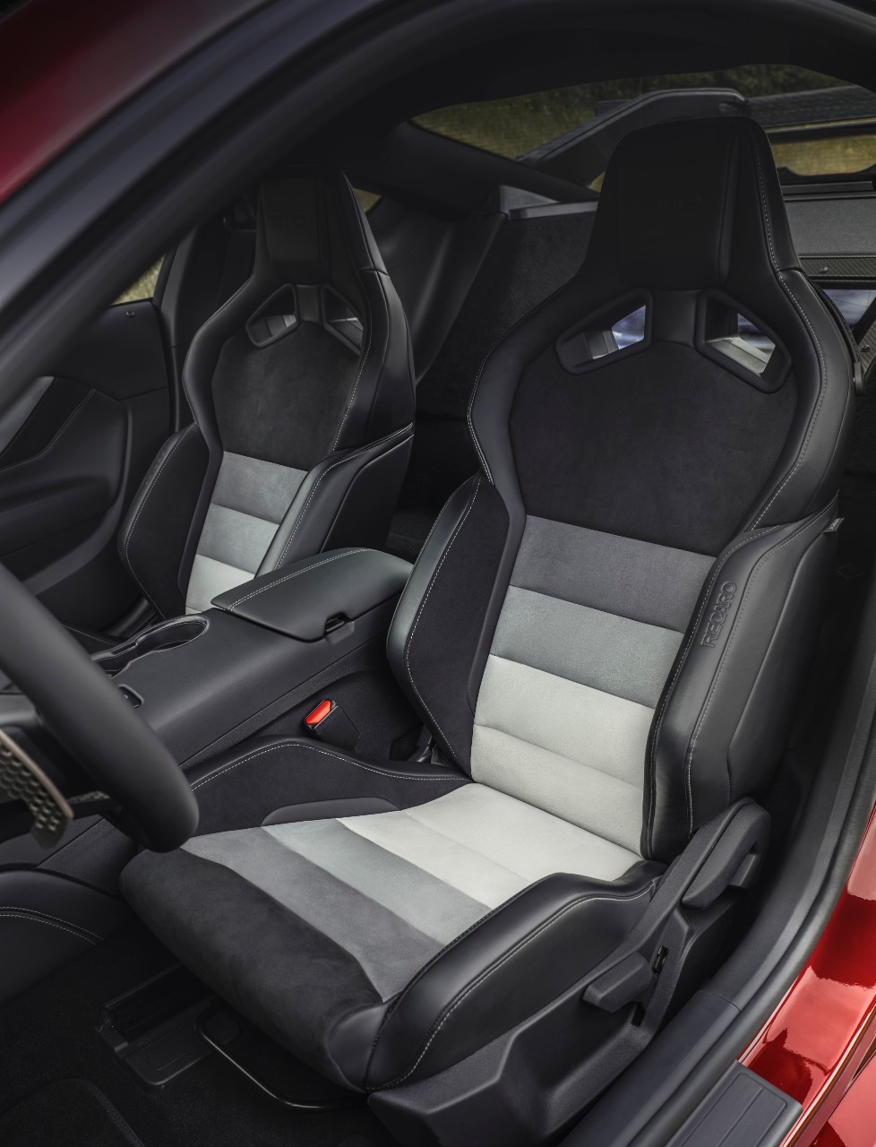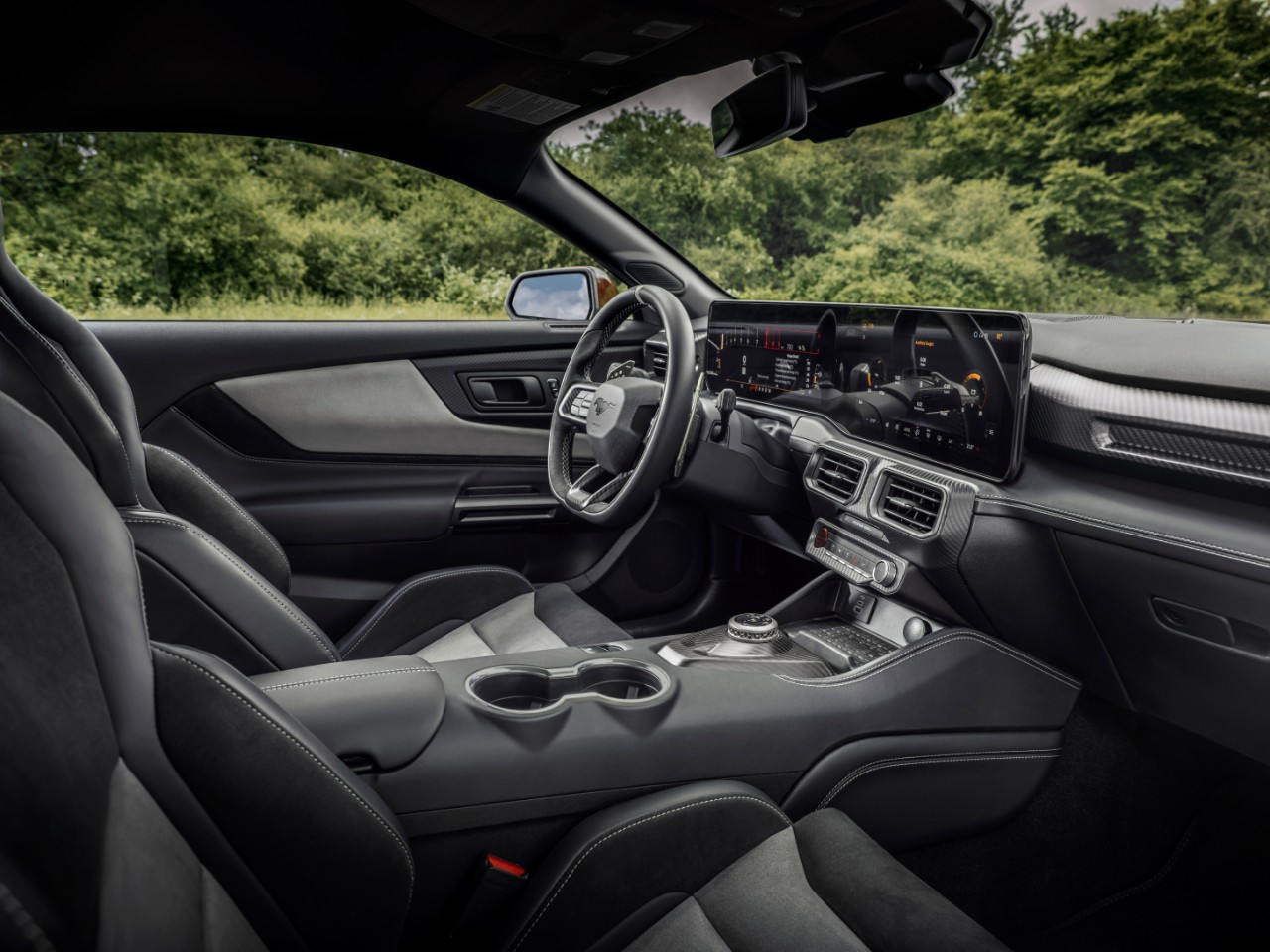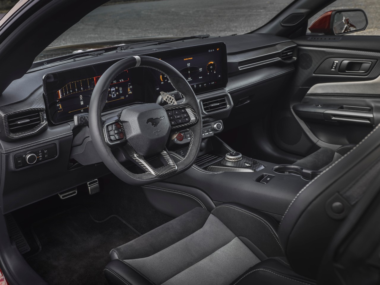 Inside, the Mustang GTD showcases its enhanced driving experience with large 3D-printed titanium paddle shifters, Recaro seats, and a thick-rimmed flat-bottom steering wheel clad in Dinamica and leather. Integrated controls for suspension and exhaust adjustments are conveniently placed on the steering wheel, ensuring seamless operation.