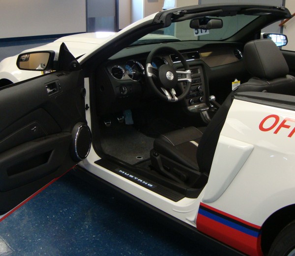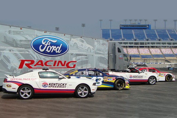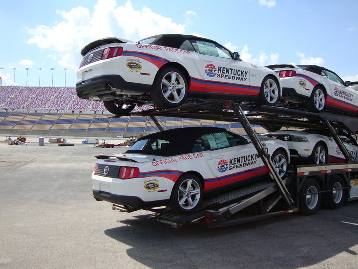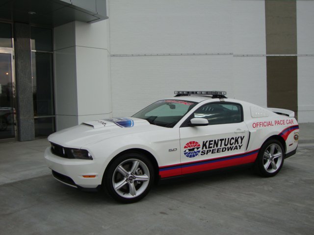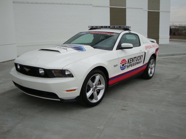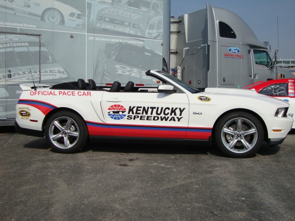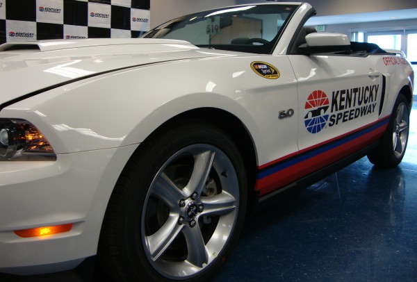 The 2012 pace car Mustangs will come in white with black cloth convertible tops, special badging and the standard 5.0-liter V8 producing 412 horsepower. The Mustangs are numbered for collectible purposes and feature unique “Official Pace Car” badging along with NASCAR and Kentucky Speedway logos.