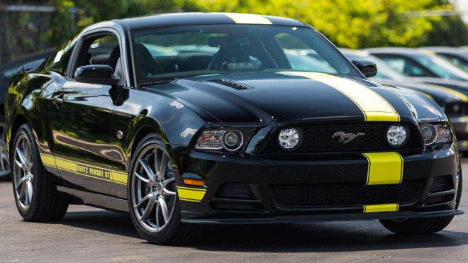 - Exterior Upgrades Include: Black exterior with unique Hertz yellow racing stripes, Boss 302 Front Splitter, GT500 Rear Valence, Upgraded Suspension and Handling, Custom Graphics Package, and Custom Hertz Faux Gas Cap