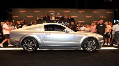 This past weekend the Barrett-Jackson Las Vegas Collector car auction was going on at the Mandalay Bay hotel & casino. One of the main highlights of the auction was the 2009 1/2 Iacocca 45th Anniversary edition Mustang #005 being auctioned off. The vehicle brought an amazing $352,000 given it’s the fifth production unit and not the first which would typically bring the big money. This limited edition Mustang is a coach built vehicle from ILegacy, Lee Iacocca’s company. Production is limited to just 45 units and the remaining will be sold exclusively through Galpin Motors in California. Auction photos can be seen after the jump…