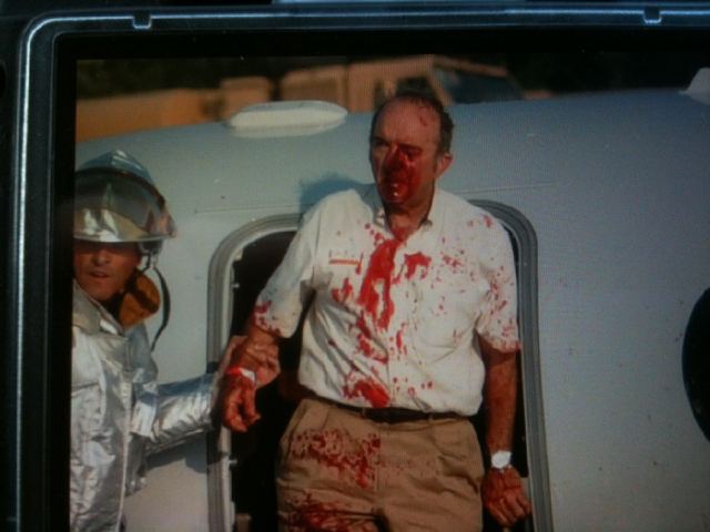 Roush attempted to land the plane and then hit the runway with the nose of the plane causing it to crash and break in two.  Roush sustained severe facial injuries which you can see in a photo below.  He was admitted to the hospital in stable condition and is said to be doing well.  Doctors have said he will make a full recovery.  As for his flying days, they might be coming to an end as this is his second plane crash in 8 years.  Check out a few photos after the jump…