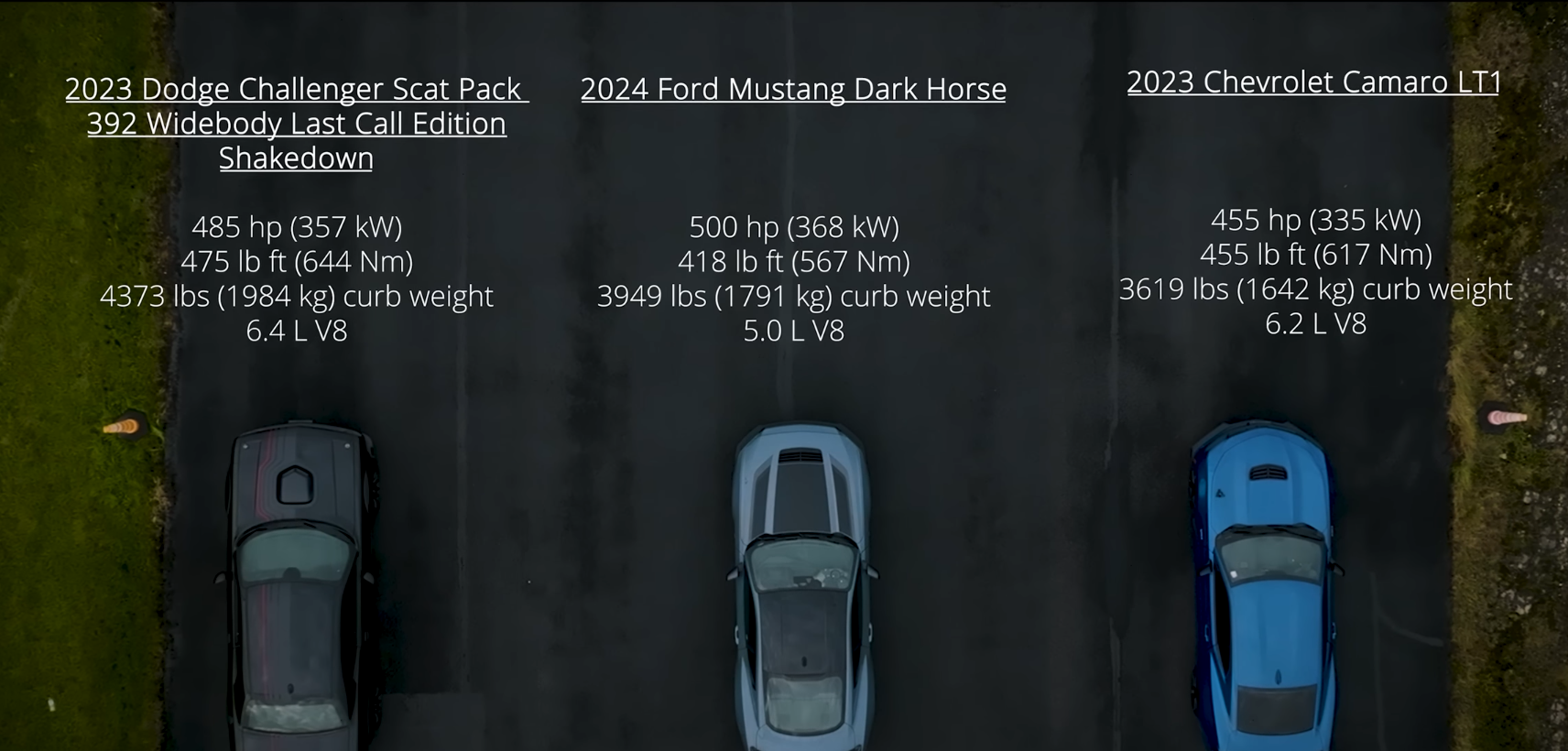 Each car lined up with a manual transmission and rear-wheel drive. The Mustang Dark Horse led in power at 500 horsepower, while the Camaro LT1 brought 455 horsepower and the Challenger Scat Pack Widebody packed 392 cubic inches of muscle.