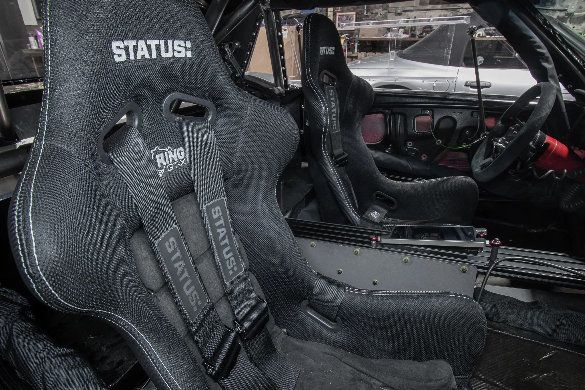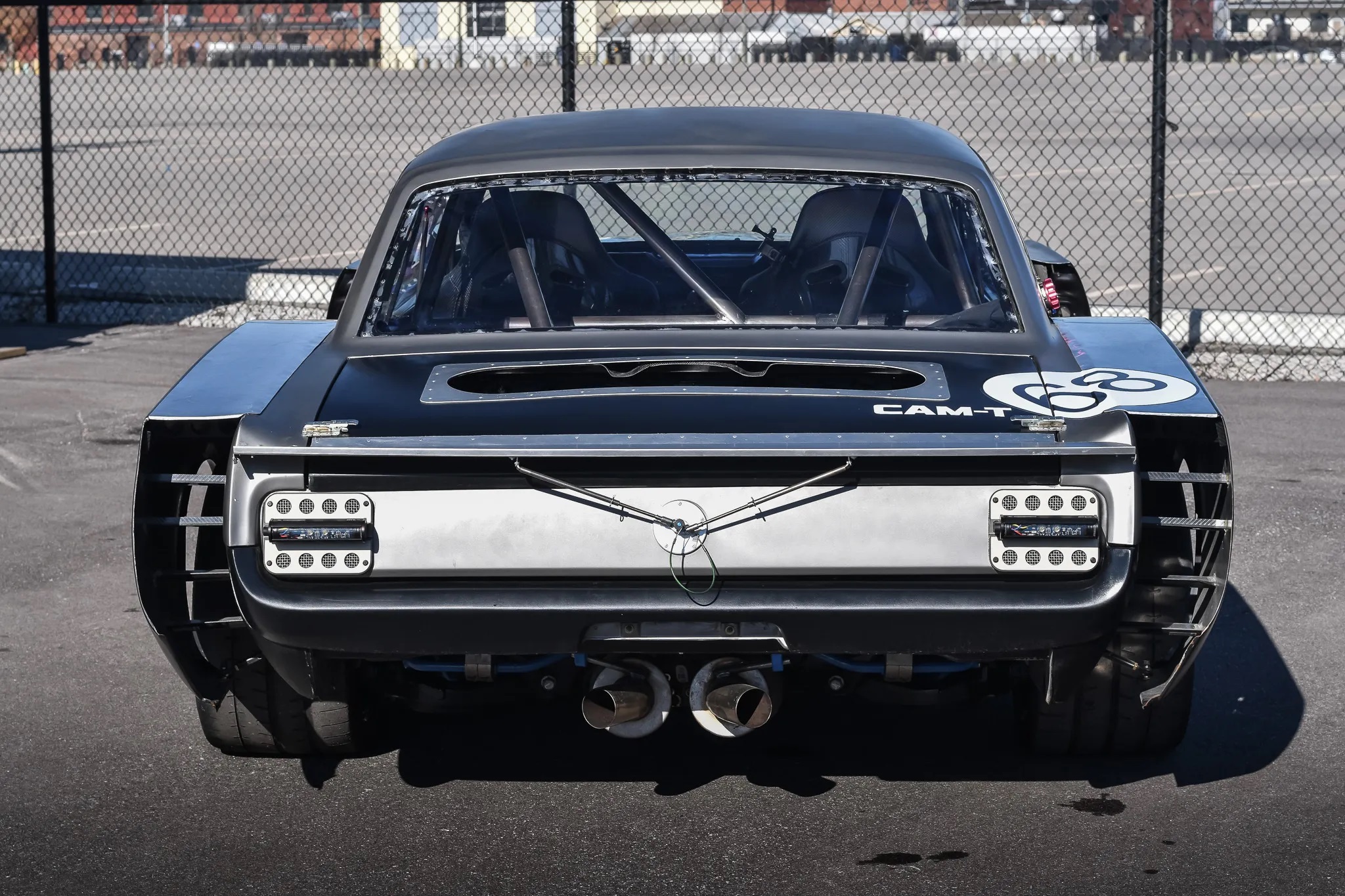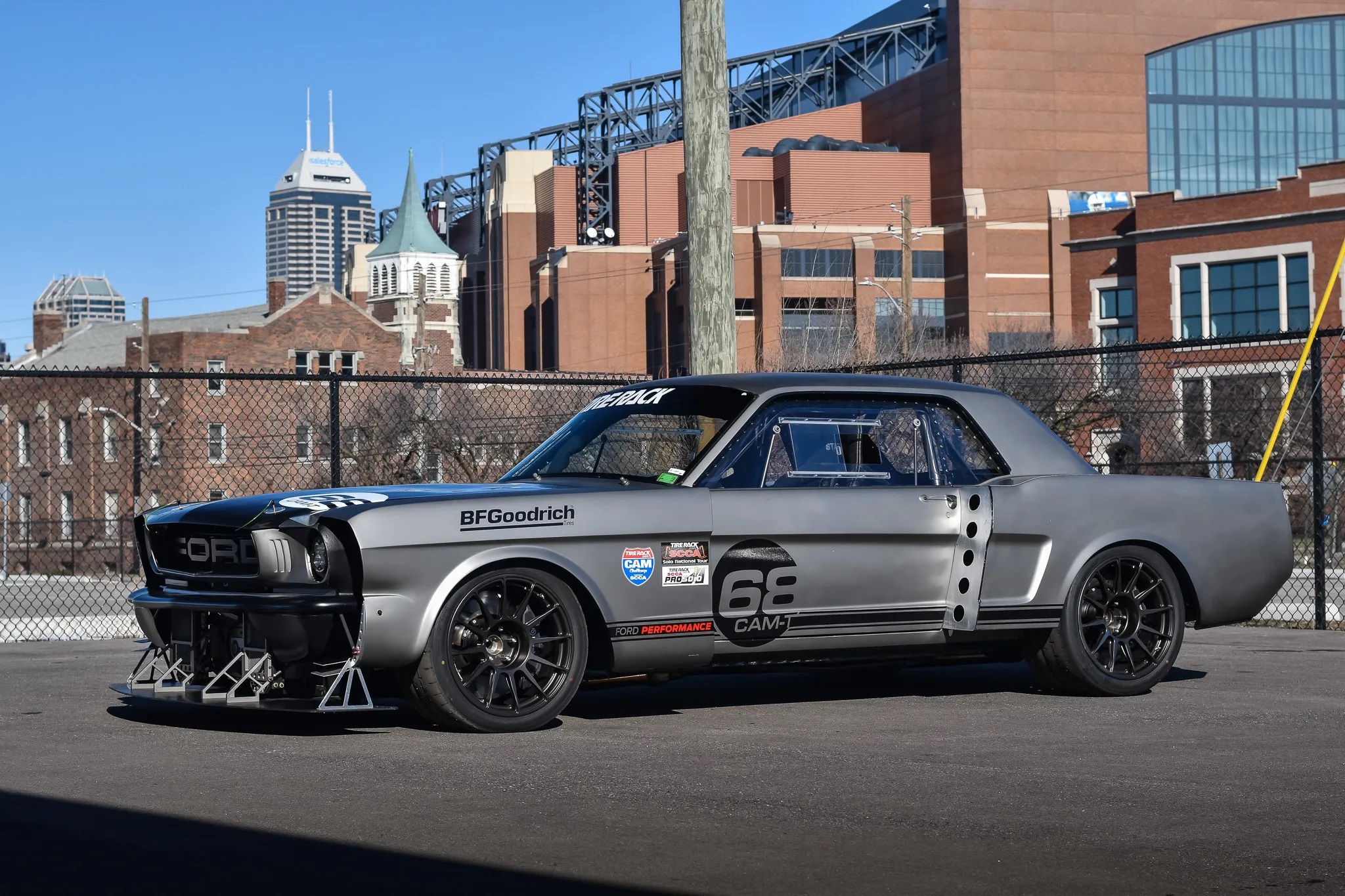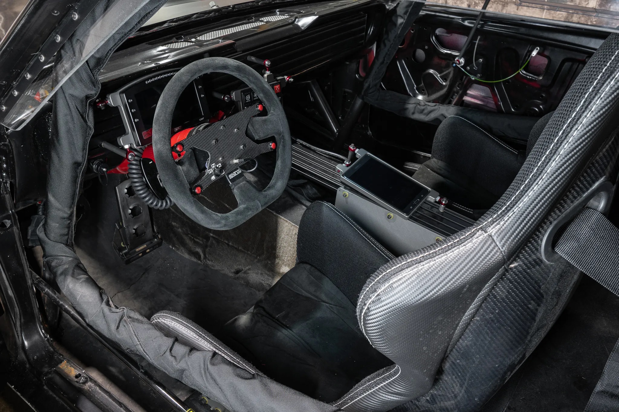 The custom interior boasts a chromoly roll cage, Status carbon-fiber bucket seats, racing harnesses, a MoTeC digital dash unit, and a MoTeC switch panel. The Mustang rides on black CCW 18×12″ wheels.
