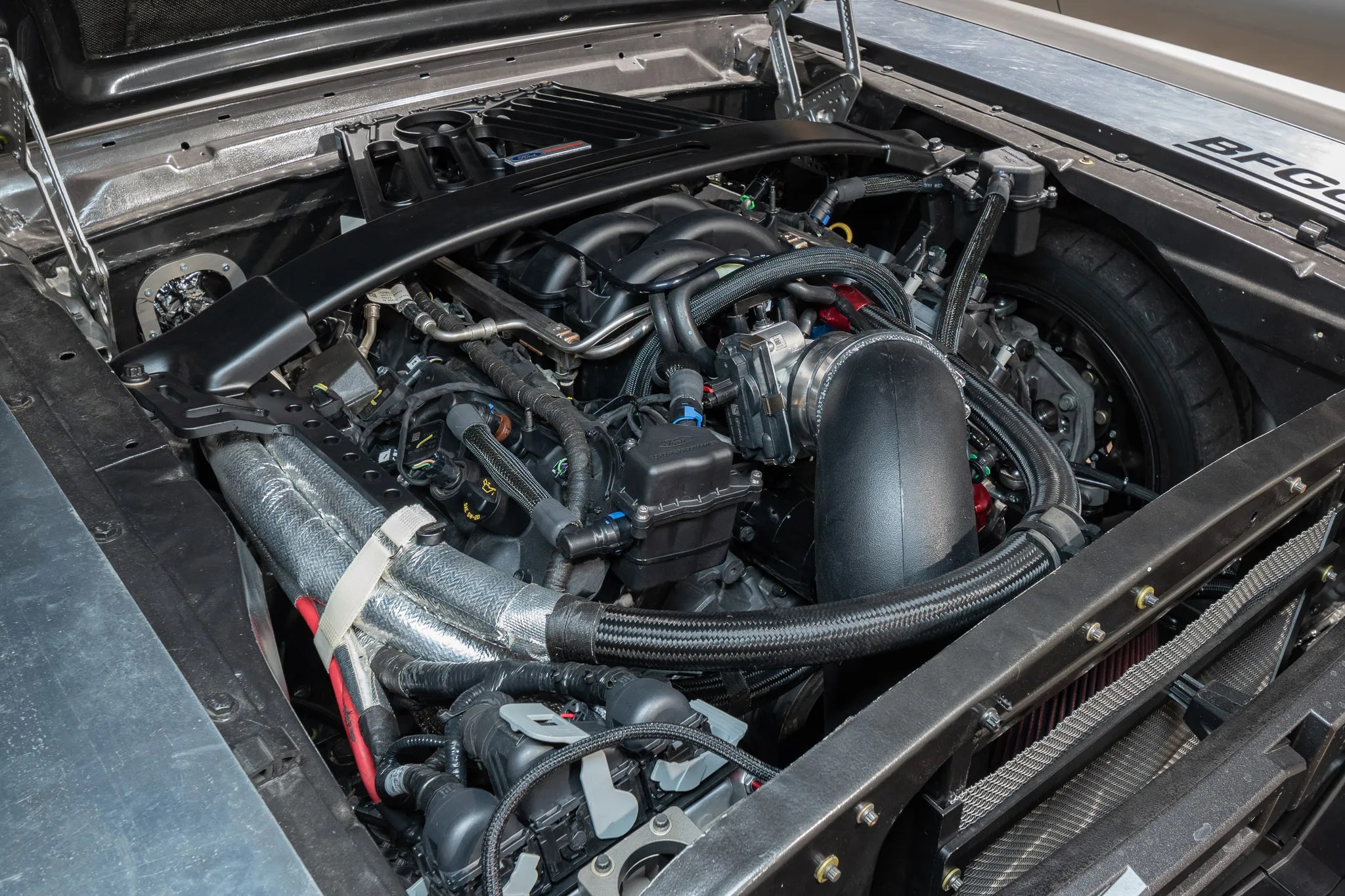 The Gen3 Coyote 5.0-liter V8 is equipped with a GT350 intake, throttle body, oiling system, custom cold air box, electric water pump, Kooks headers with a 3″ exhaust, and a Modular Motorsports Racing timing-protection system. Power is sent to the rear wheels through a 10R80 10-speed automatic transmission with modified control software.