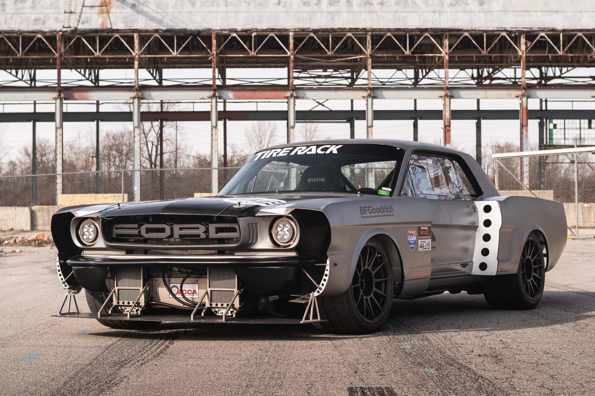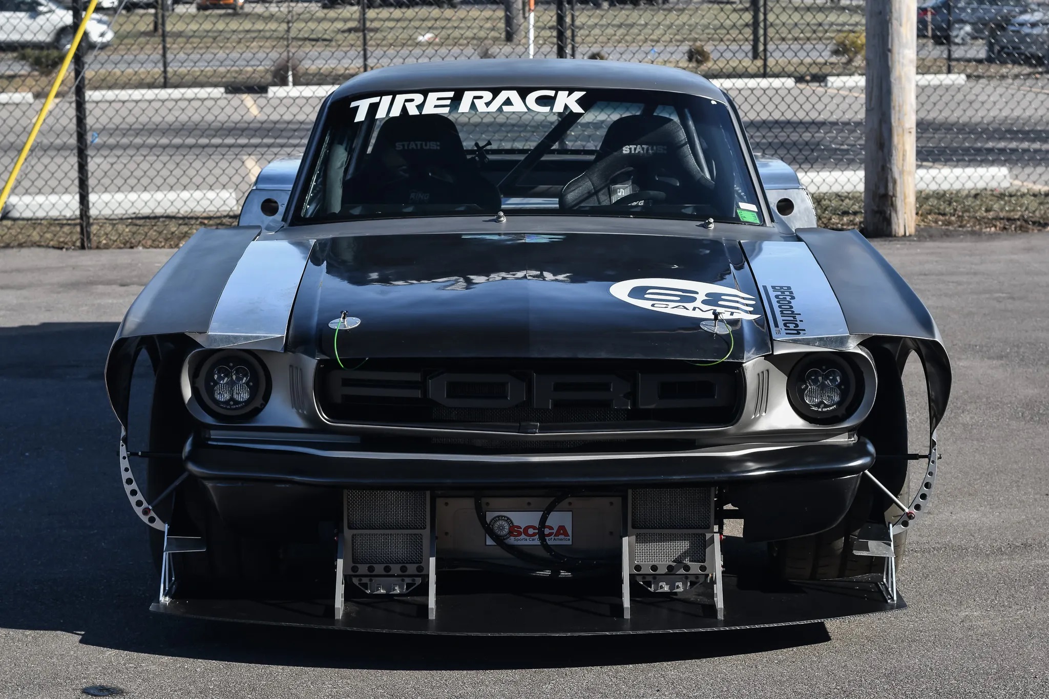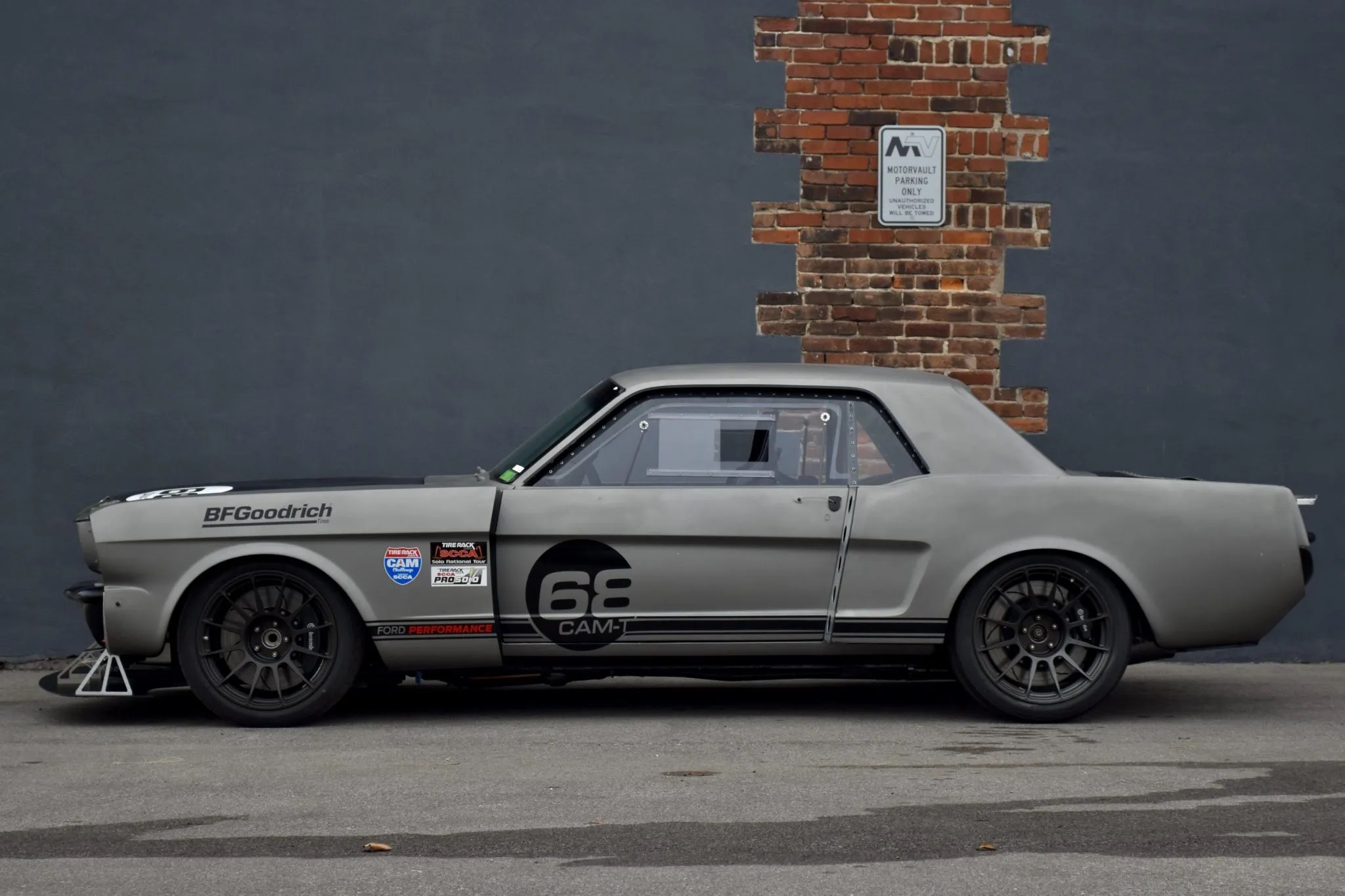 This 1965 Ford Mustang coupe has been extensively modified with subframes from a 2020 Mustang GT350 and widened bodywork. The factory fenders were cut and extended outward to fit the GT350 suspension, and the car’s exterior is finished in a metal-look Steel-It material.
