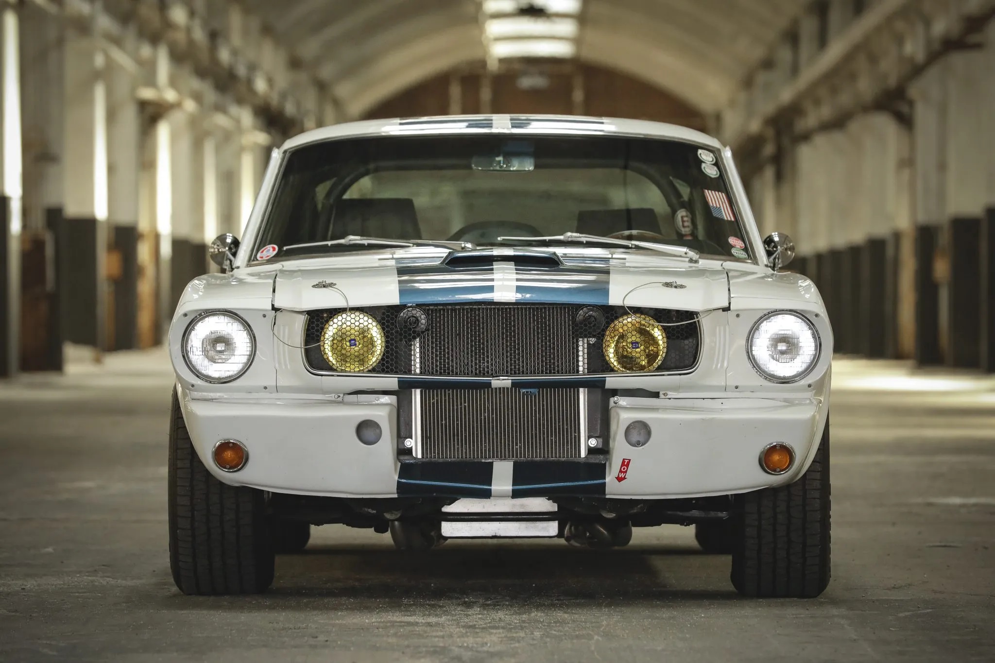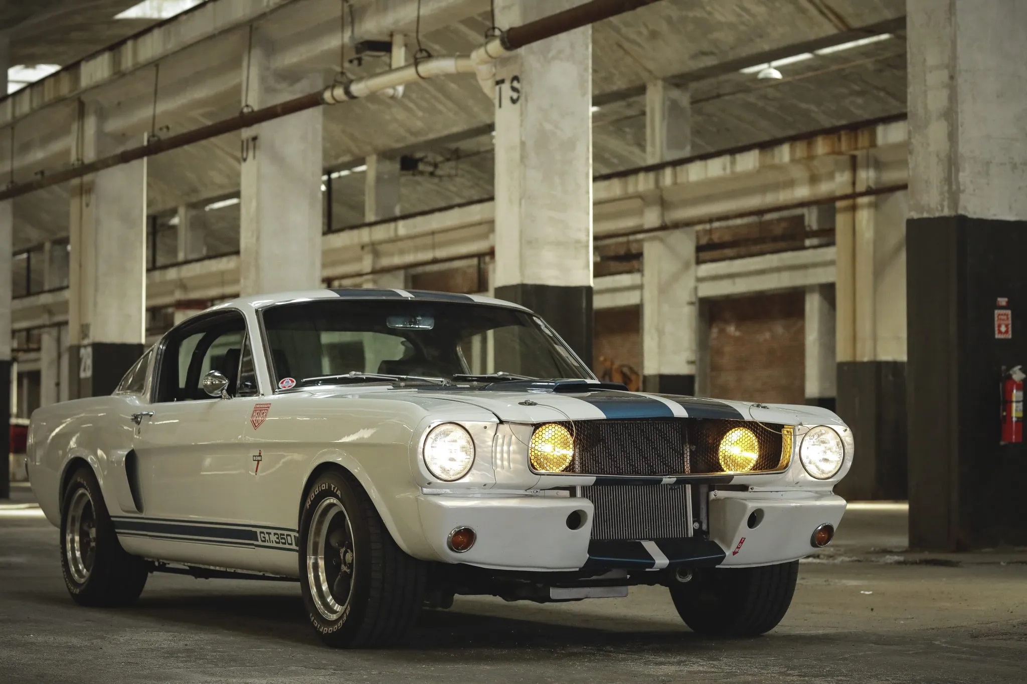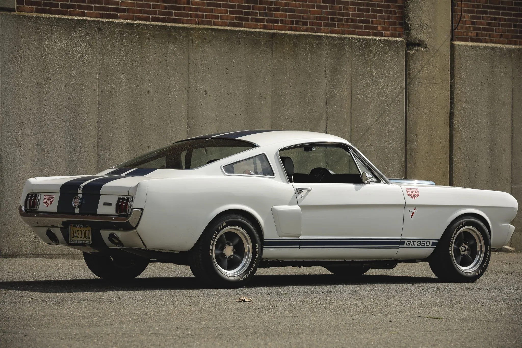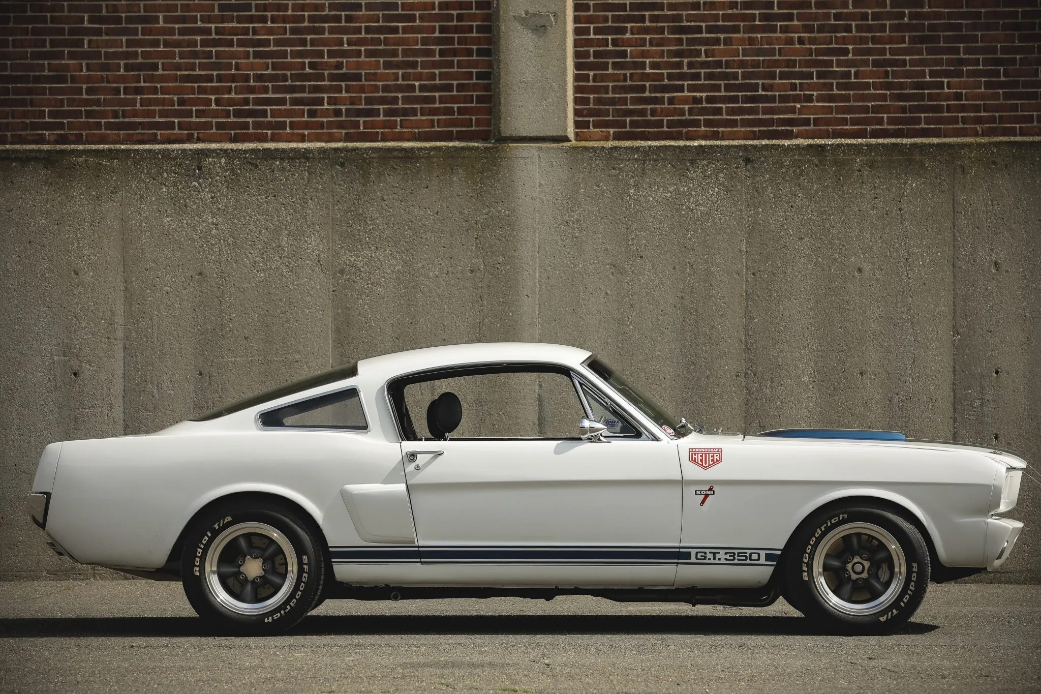 This 1965 Ford Mustang, originally built as an A-code fastback, has been modified to resemble a GT350R. It features a fiberglass hood with a scoop, an R-style front valance, a GT-style rear valance, side scoops, and has been repainted in white with blue stripes.