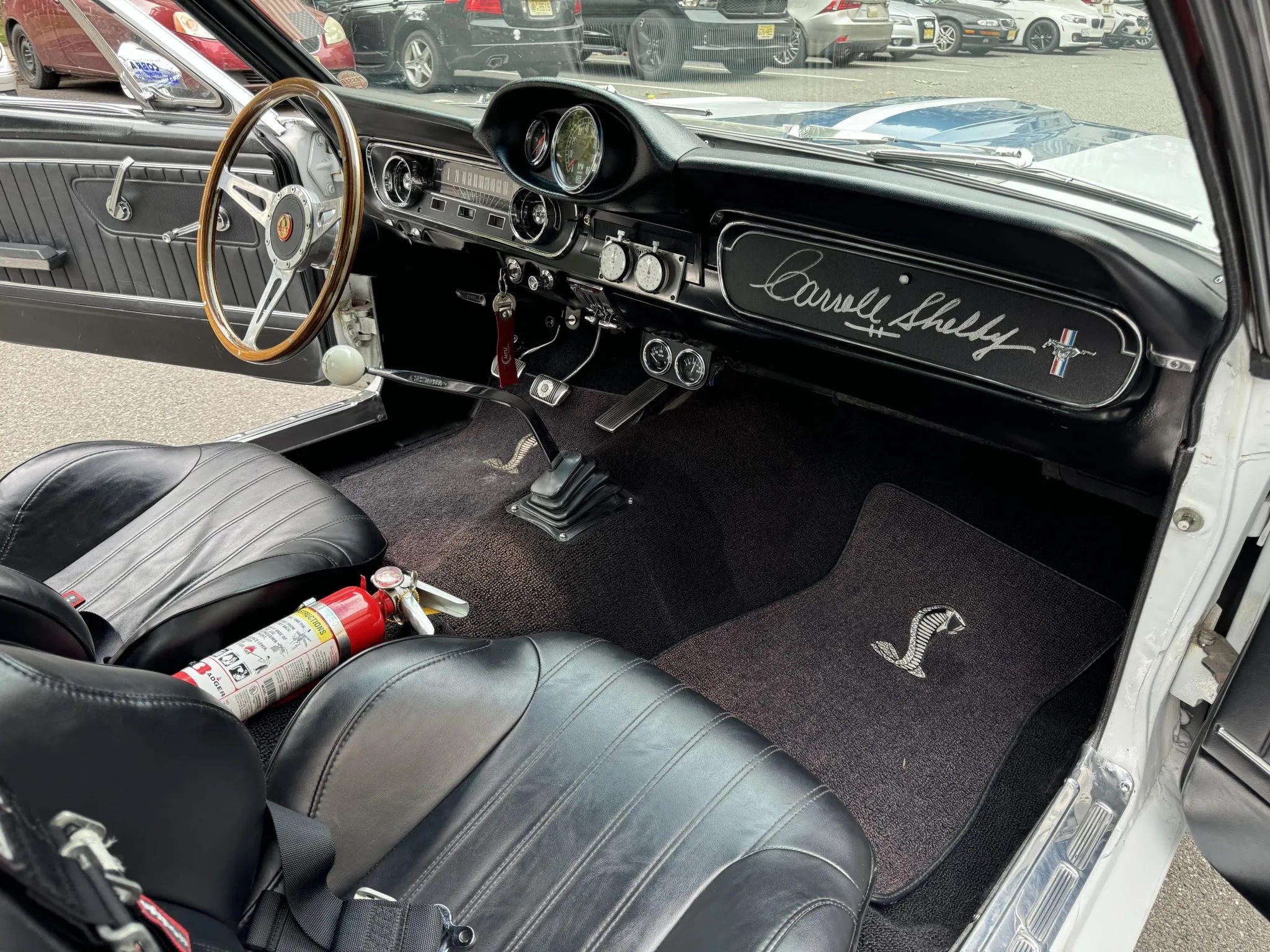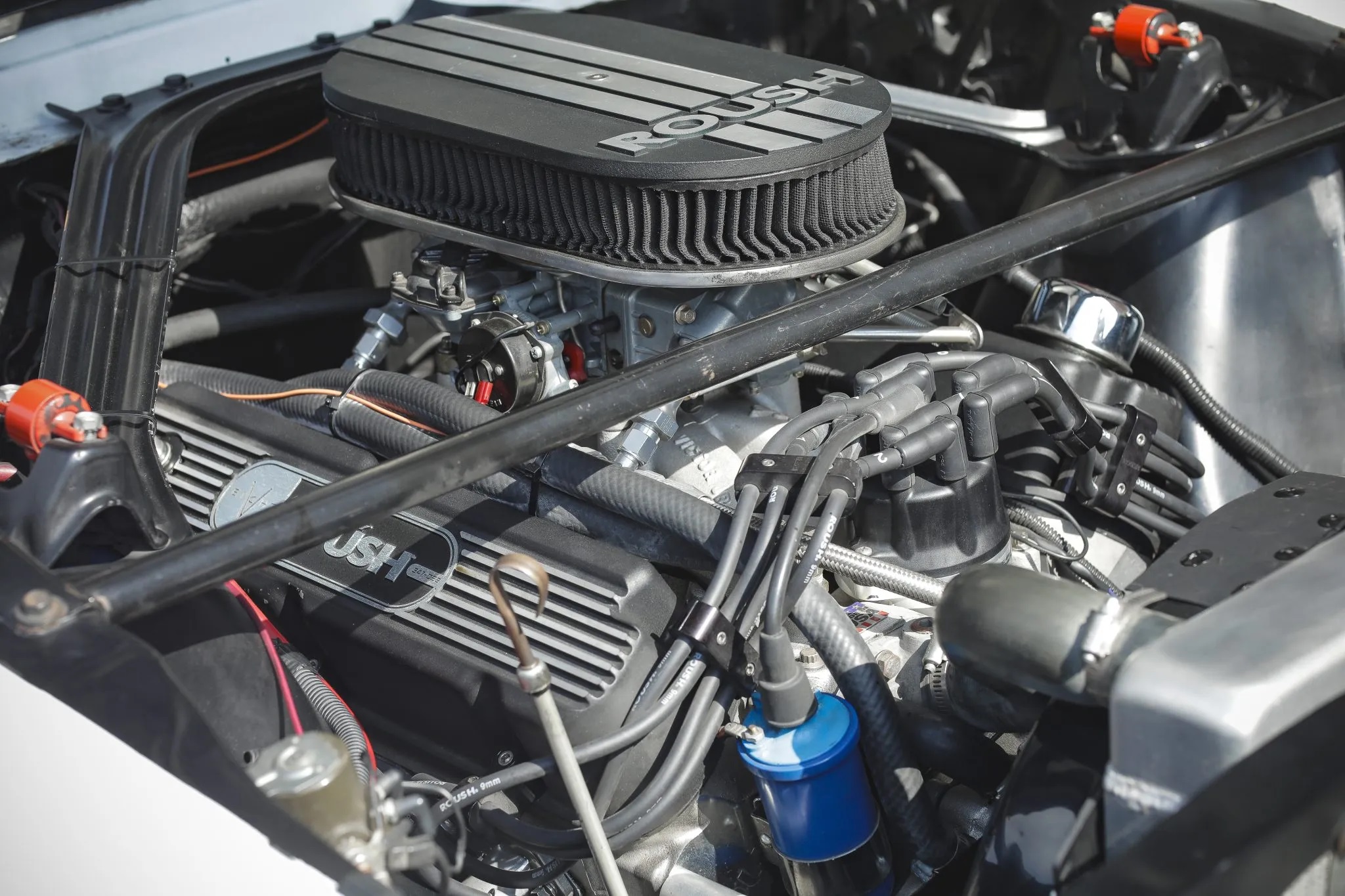 The car is powered by a Roush 347ci V8 engine producing 474 horsepower and 426 lb-ft of torque, sent to the rear wheels via a Tremec T-5 five-speed manual transmission with a Centerforce clutch. It also has an 8″ rear end equipped with an Eaton Detroit Truetrac 3.55 differential.