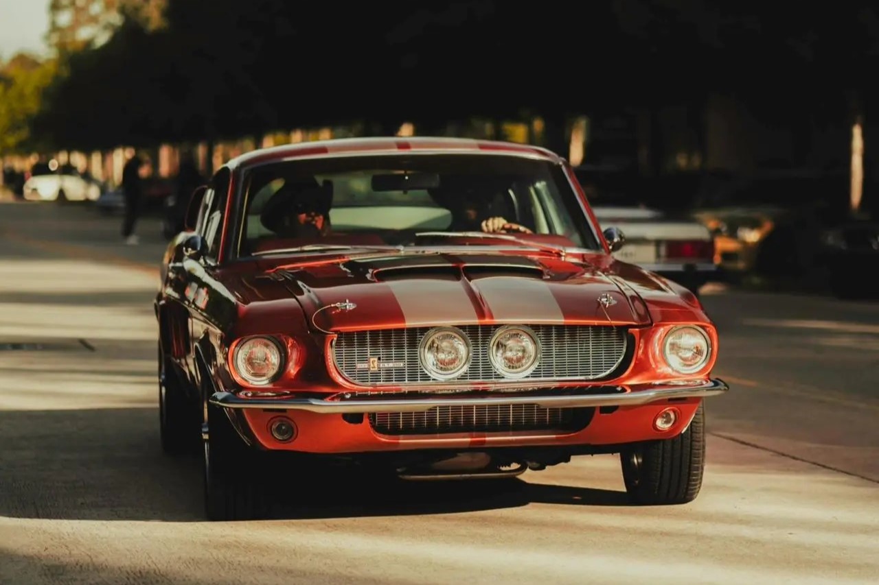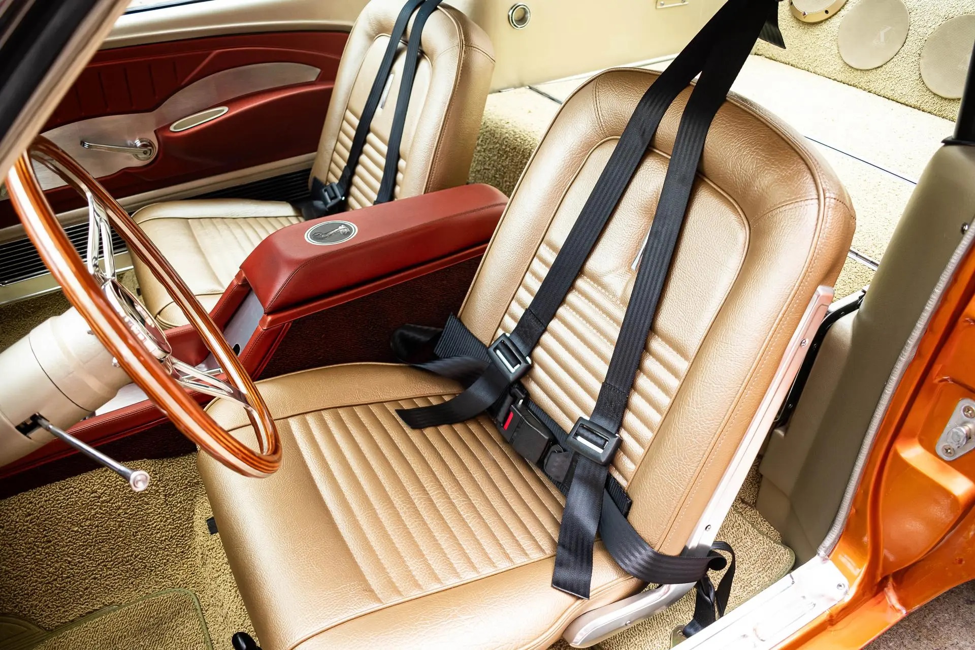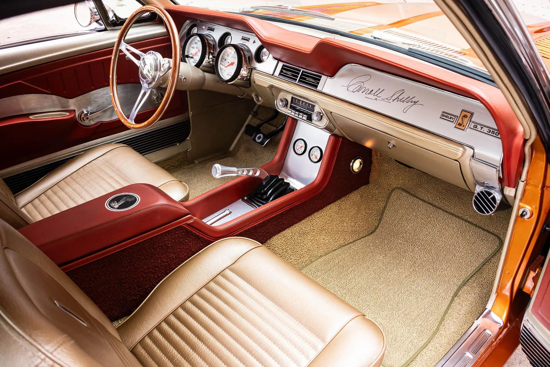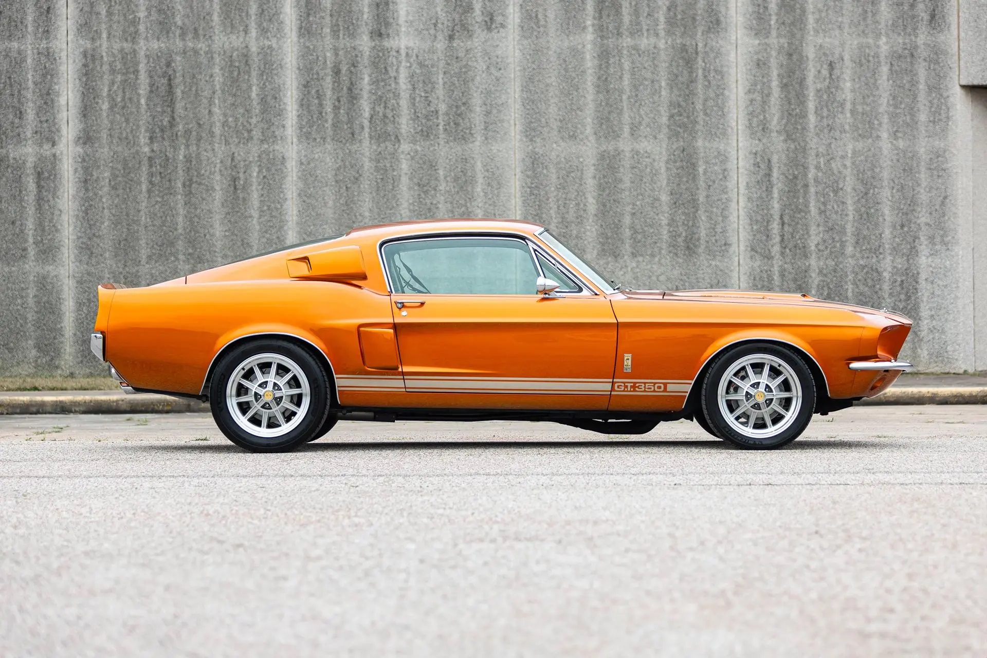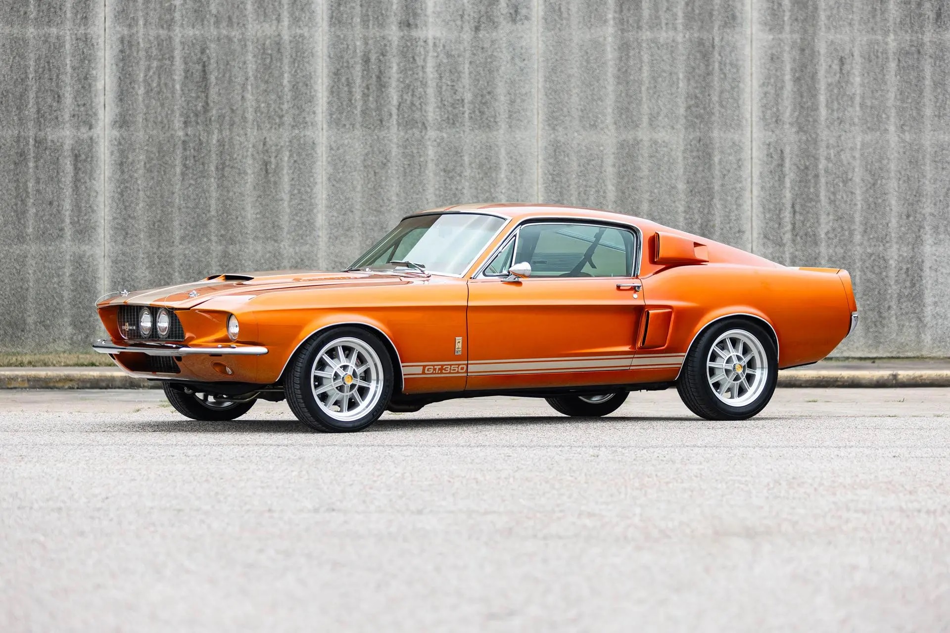This customized 1967 Ford Mustang fastback underwent extensive modifications, starting with a stunning House of Kolor metallic orange repaint. Under the hood lies a powerful 289ci V8 engine paired with a Tremec five-speed manual transmission and a limited-slip rear end. Its exterior features GT500-style bodywork and GT350 badges, giving it a distinctive look.