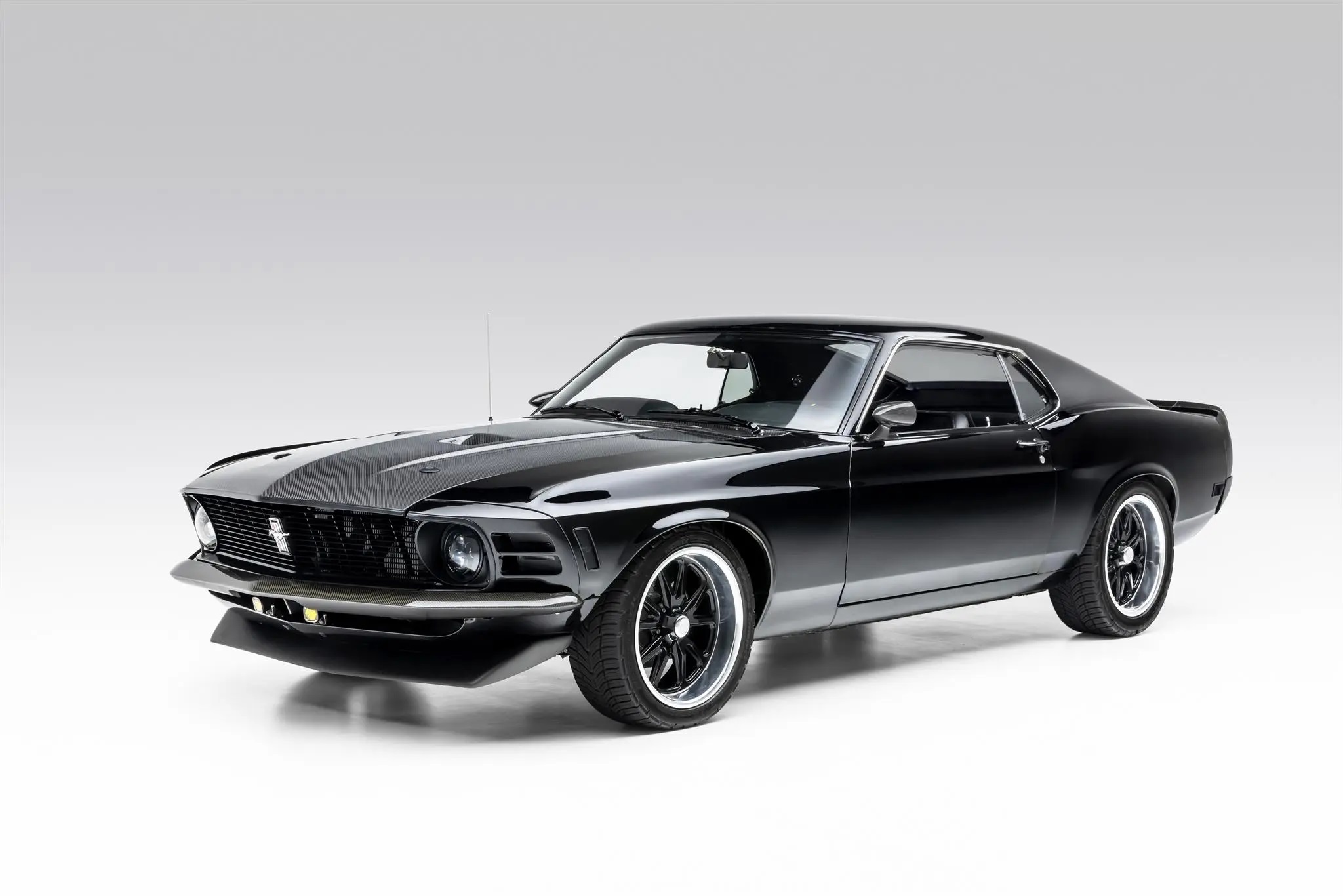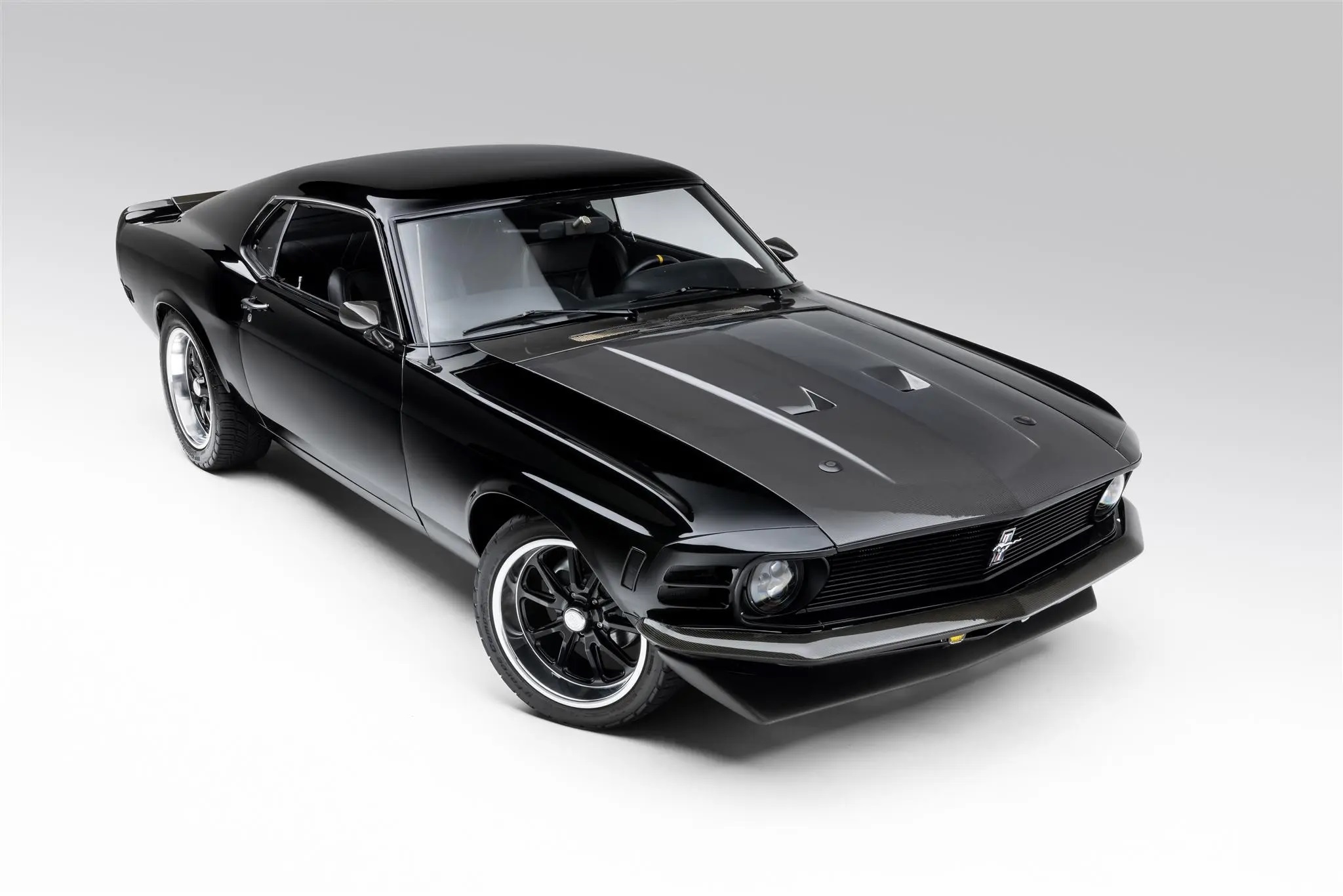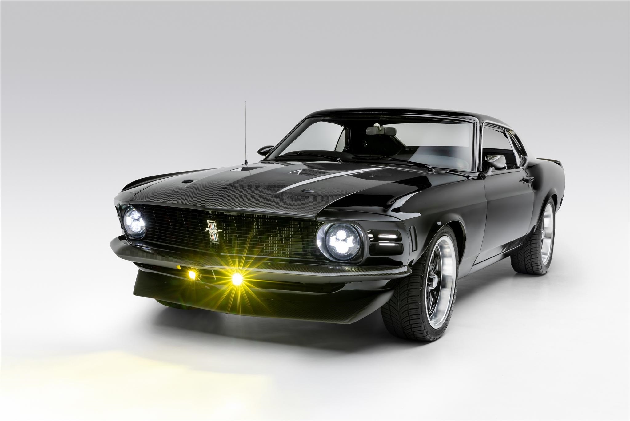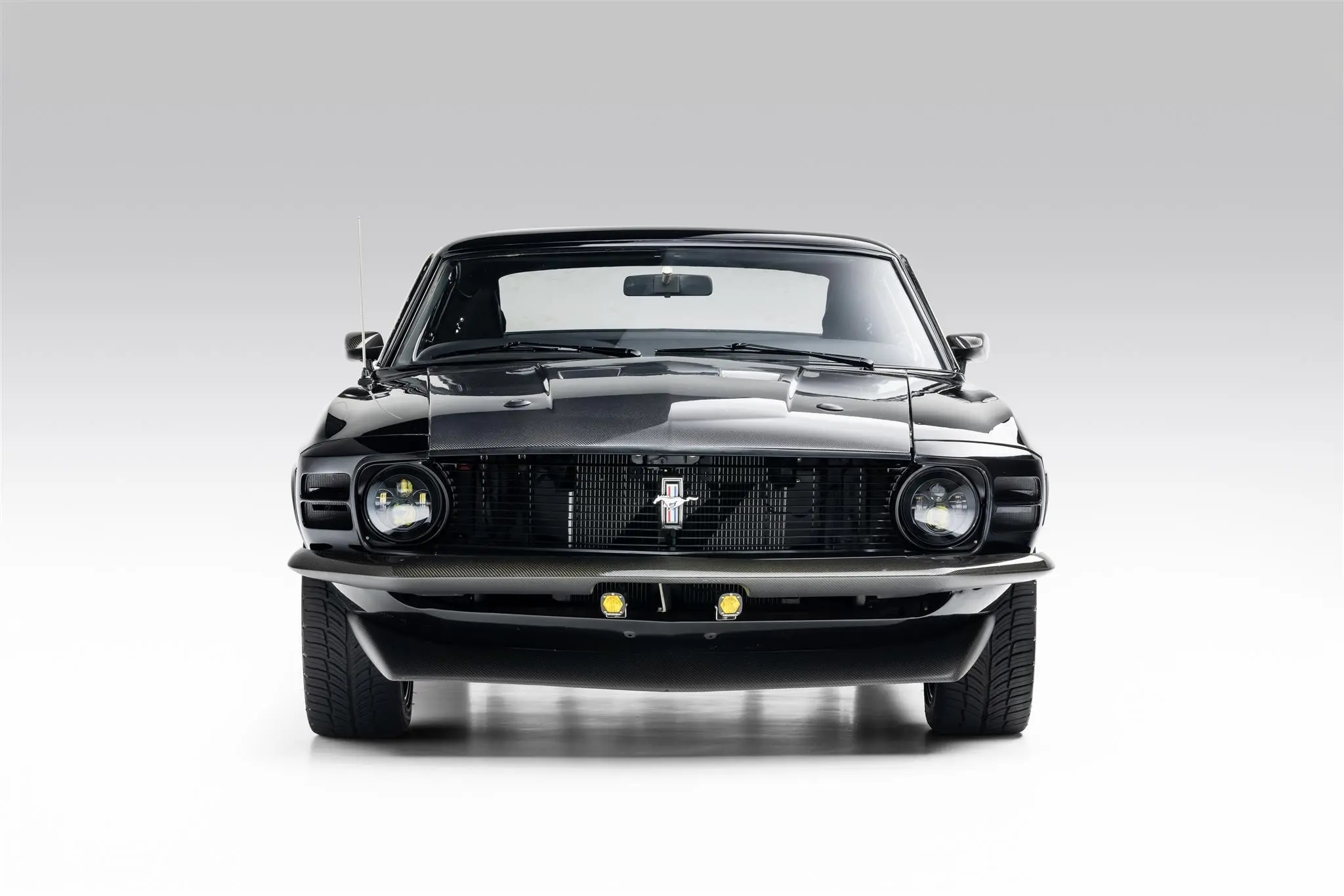 This 1970 Ford Mustang SportsRoof underwent a stunning transformation as part of a Rockstar Energy promotion in 2020. It boasts a head-turning look with lightweight carbon-fiber components for the hood, trunk, and bumpers, along with aggressive LED and Baja Designs exterior lighting.