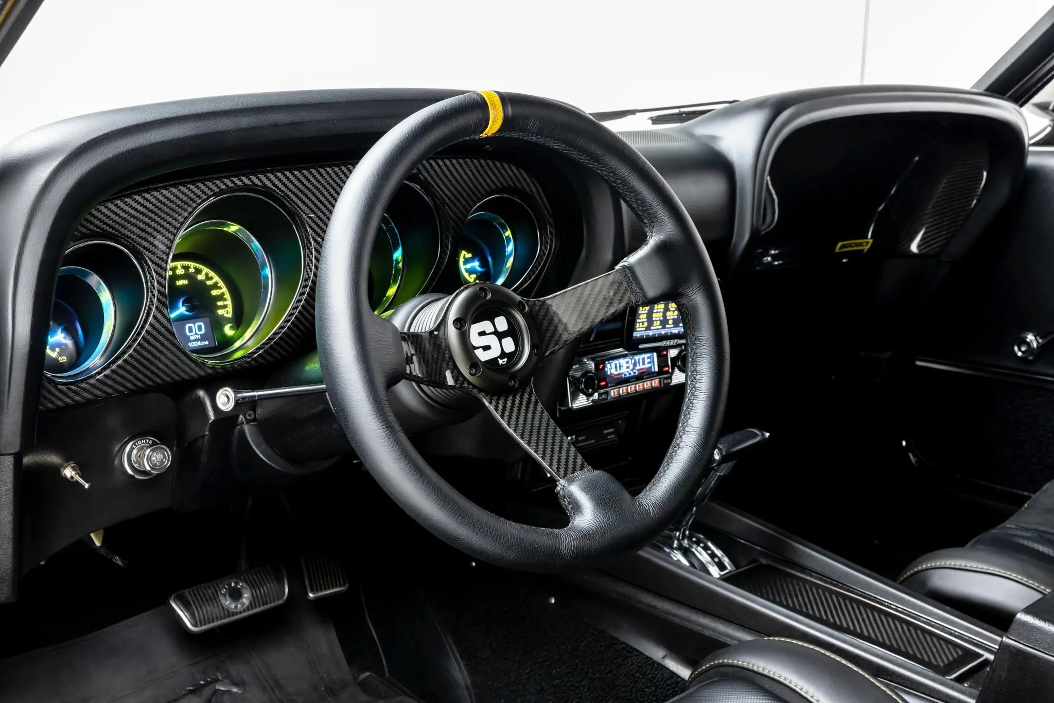 The interior complements the exterior’s boldness with black upholstery featuring yellow stitching and microsuede inserts. A Custom AutoSound head unit and Kicker speakers provide a premium sound system, while Dakota Digital instrumentation and carbon-fiber interior trim add a touch of modern luxury.