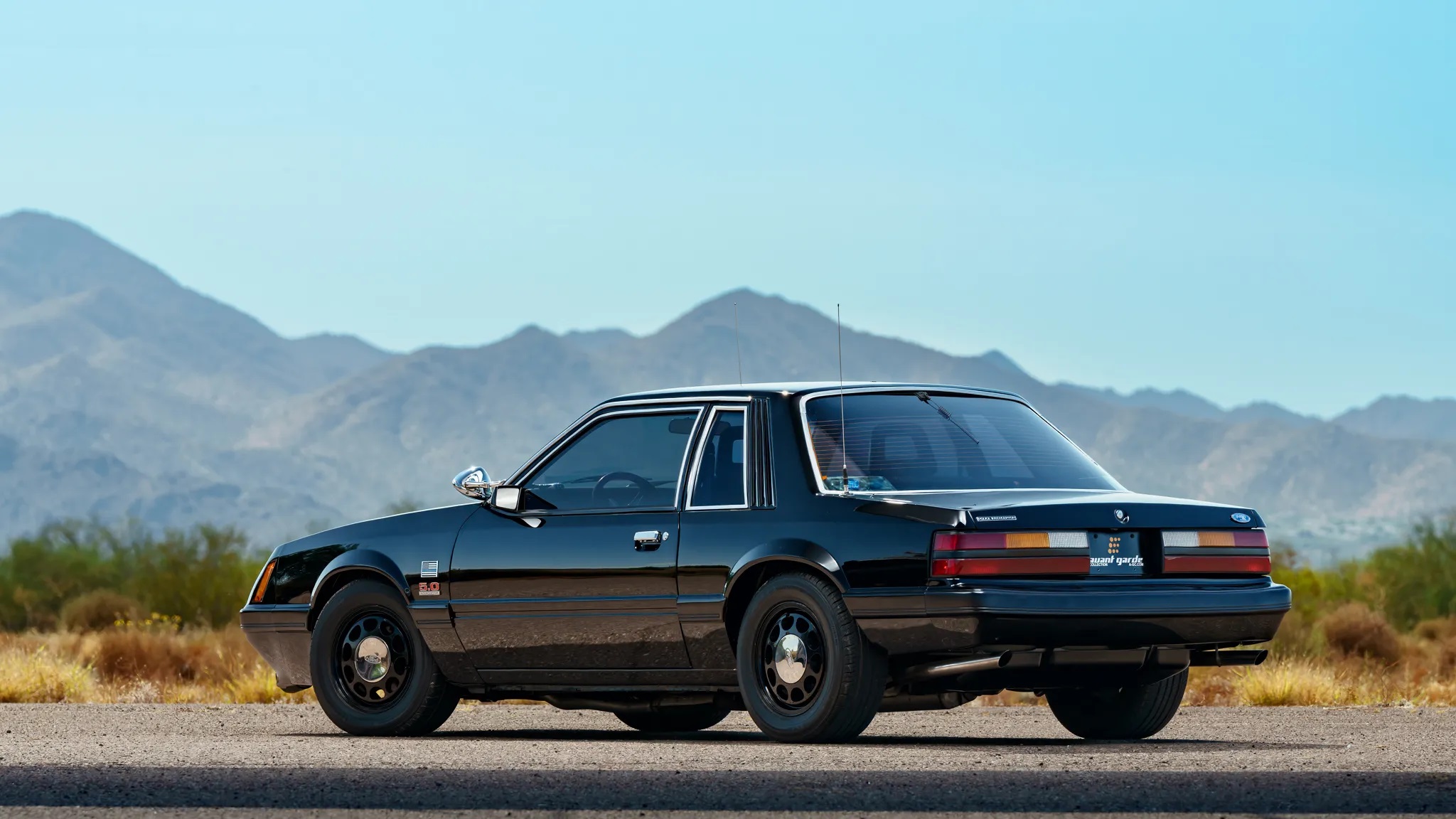 This 1985 Ford Mustang LX notchback SSP model is powered by a Roush 347ci V8 crate engine and finished in black with gray cloth upholstery. It features a five-speed manual transmission, Centerforce clutch, Holley electronic fuel injection, JBA headers, red and blue grille lights, and various police equipment.