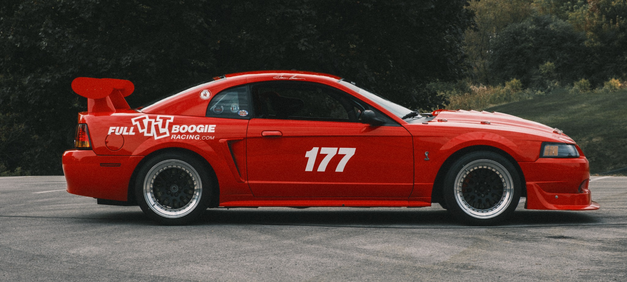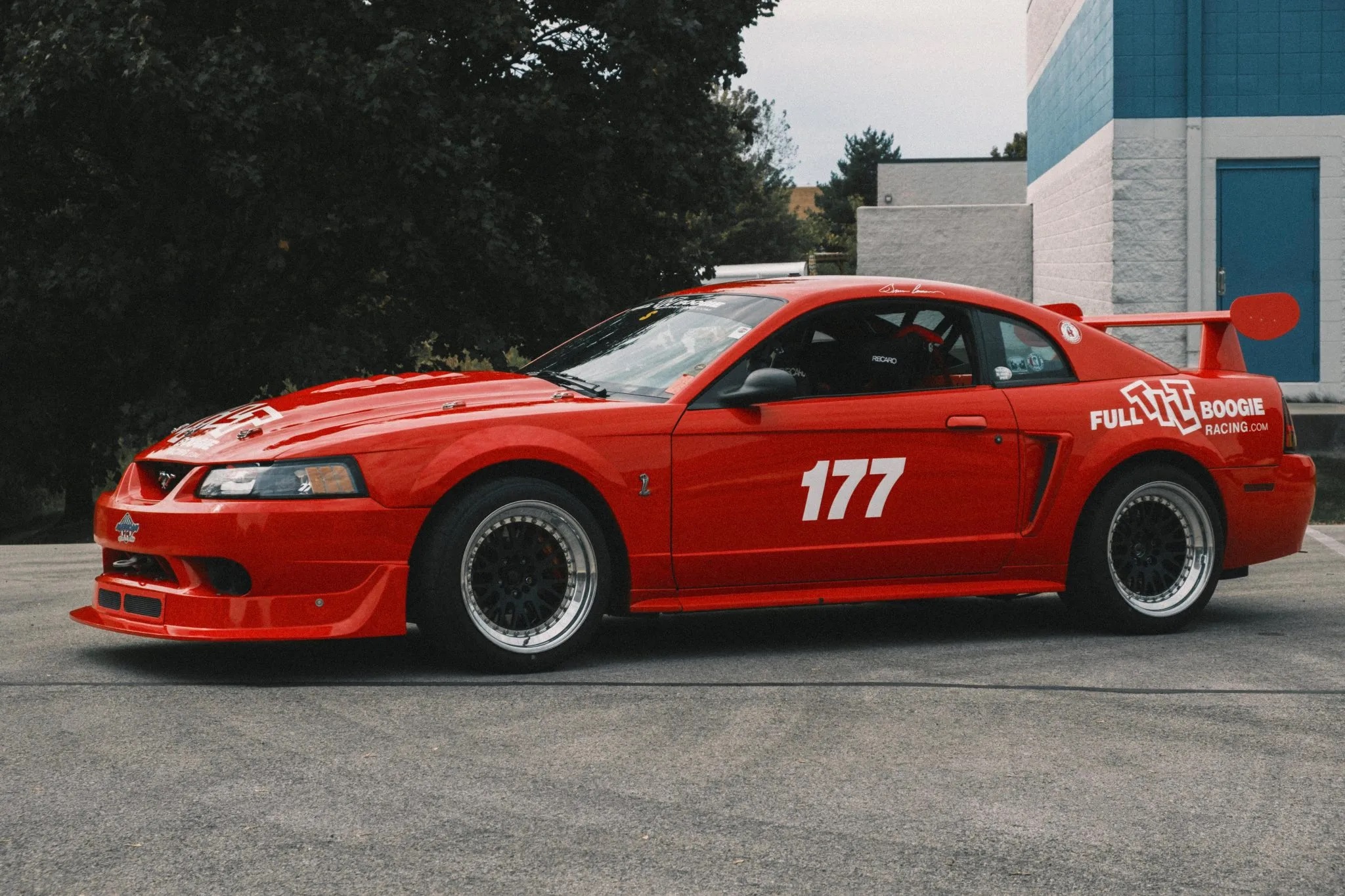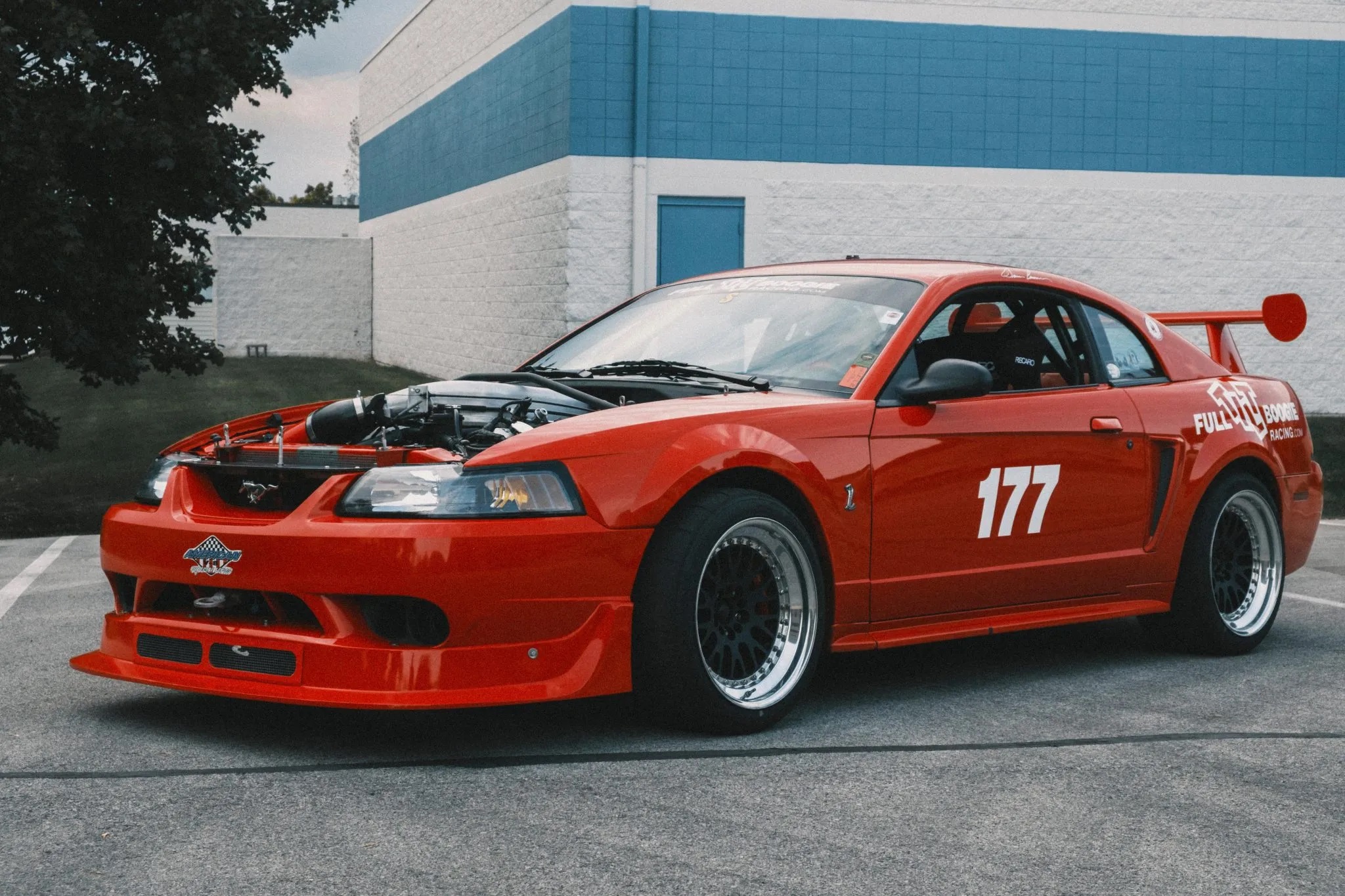 This particular 2000 Cobra R has been modified by Full Tilt Boogie Racing with additions like a roll cage, Maximum Motorsports k-member, advanced suspension upgrades, Brembo brakes, CCW wheels, and a carbon-fiber hood. Other enhancements include 3:73 gears, a Torsen T2-R differential, and FTBR’s MAF kit for improved engine performance.