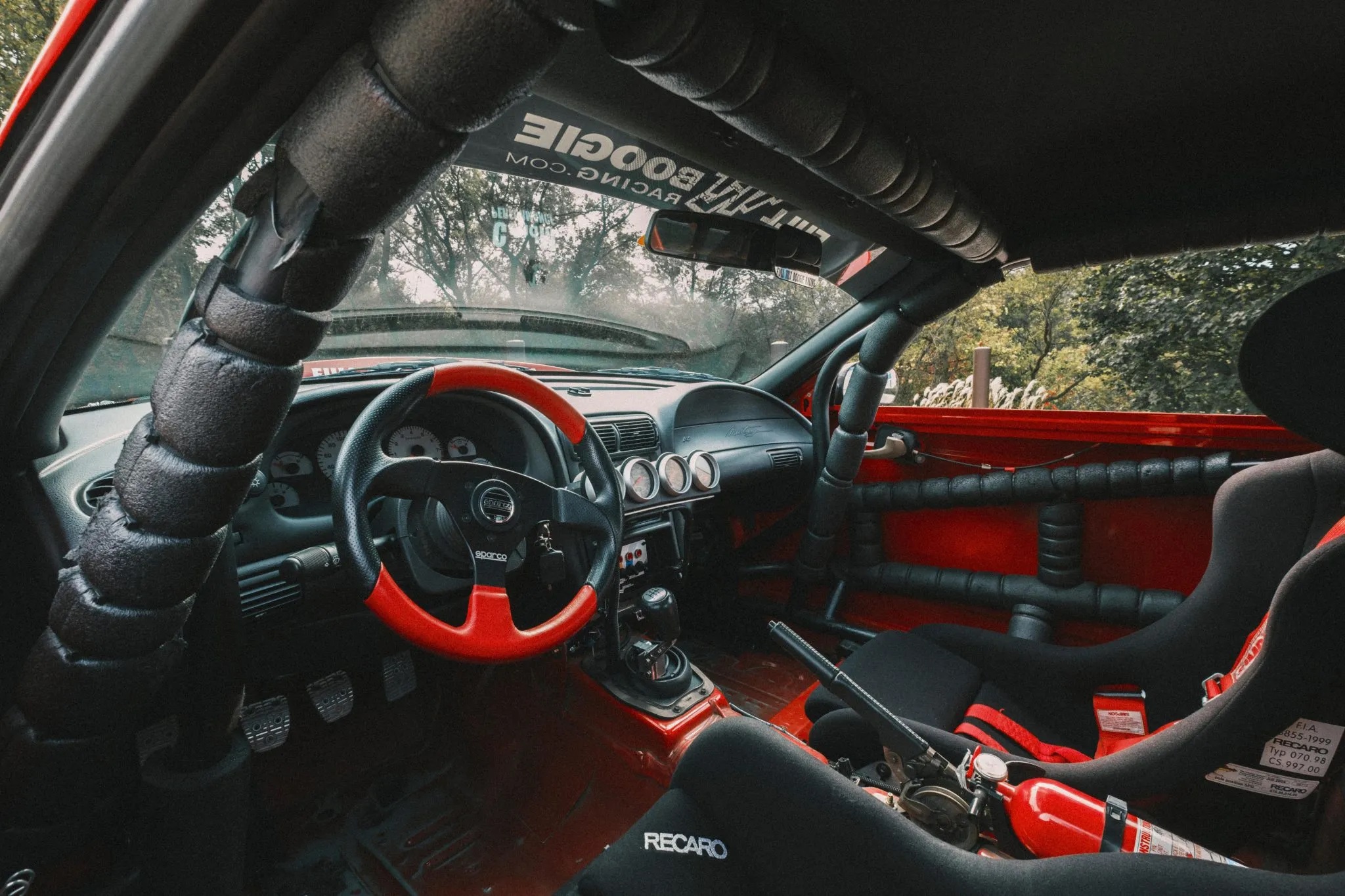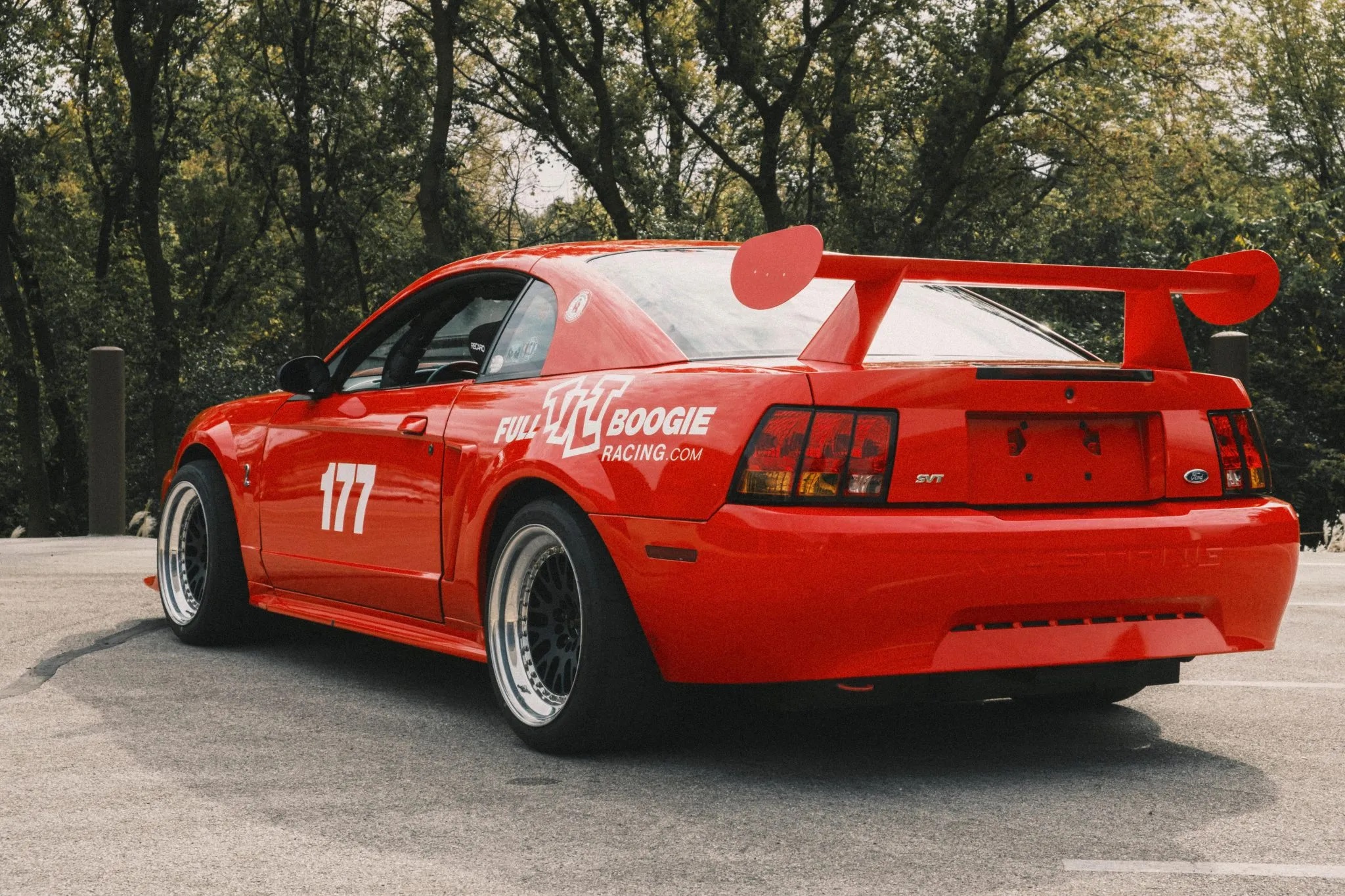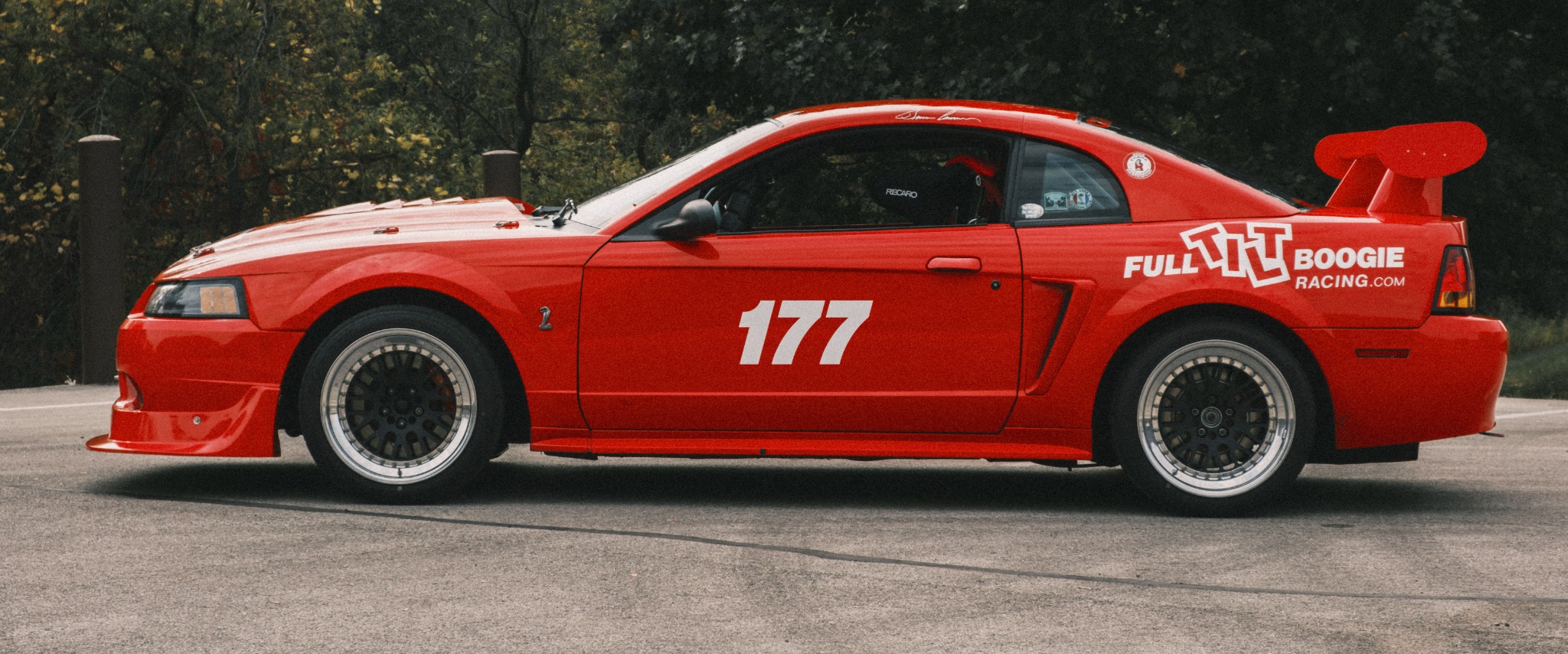 This particular 2000 Cobra R has been modified by Full Tilt Boogie Racing with additions like a roll cage, Maximum Motorsports k-member, advanced suspension upgrades, Brembo brakes, CCW wheels, and a carbon-fiber hood. Other enhancements include 3:73 gears, a Torsen T2-R differential, and FTBR’s MAF kit for improved engine performance.