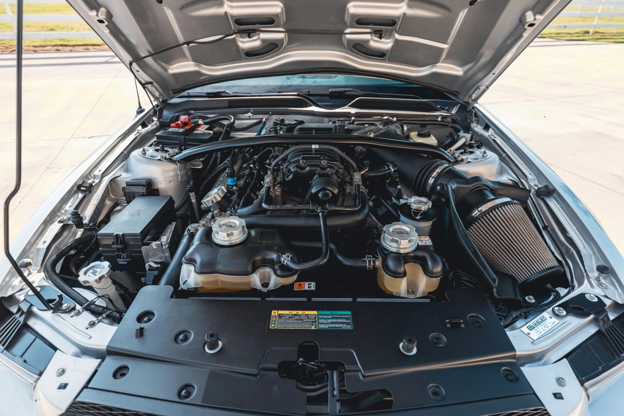 The GT500KR featured a supercharged 5.4L DOHC V-8 engine producing 540 HP, which was 40 more horsepower than the standard GT500. This boost in power was achieved through Ford Racing’s Power Pack upgrade, incorporating updated ignition and air/fuel calibrations, a special dual exhaust with X-pipe, and a cold-air intake that was matched with the KR’s distinctive hood featuring scoops.