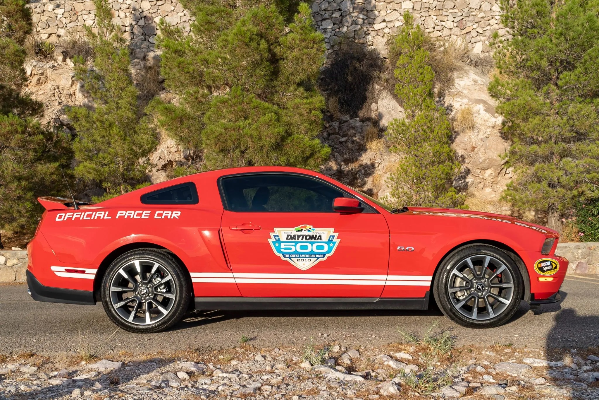 50 special Mustang GT Pace Cars were built. One of which was used to pace the 2010 Daytona 500 race. They are painted Race Red with race decals and special red, white and blue stripes. Modifications from the stock GT include: special Ford Racing suspension kit, strut tower brace, and mufflers; special 19-inch wheels with an Brembo brakes; and a modified front valance.