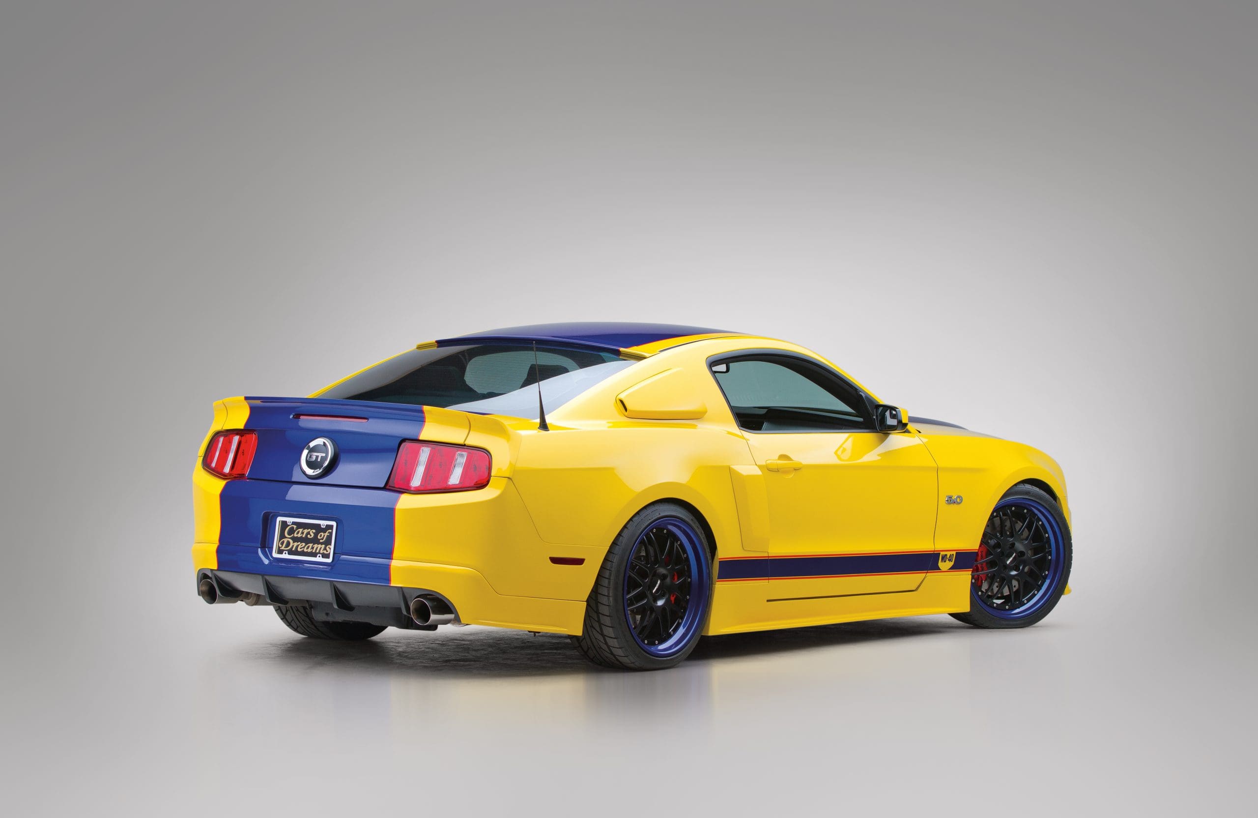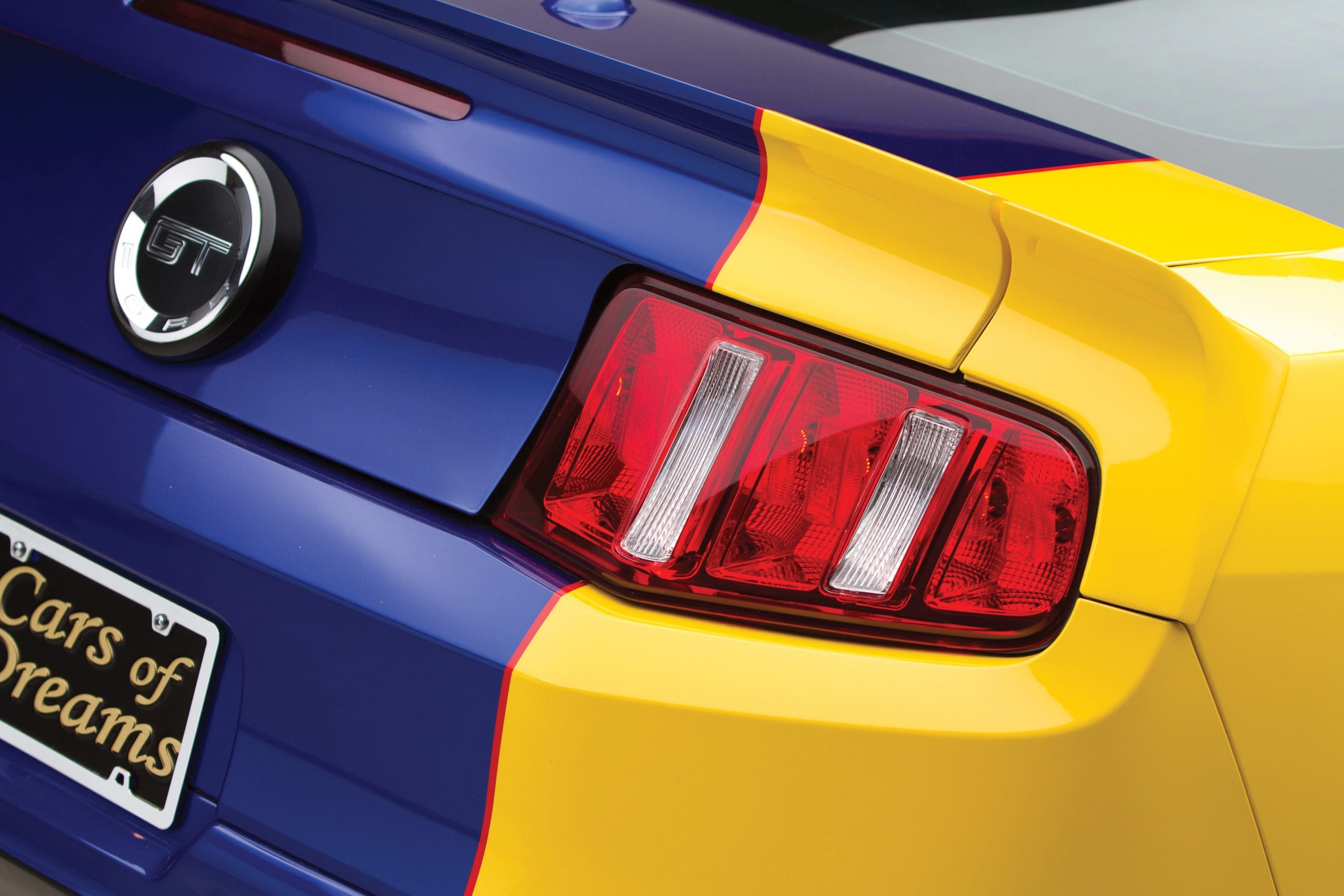 The SEMA/WD-40 team began with a 2011 Mustang GT and integrated a range of member components, including urethane body kits from Street Scene Equipment, Forgeline wheels sized 20×9 in the front and 20×10.5 in the rear, Nitto extreme performance NT555 tires, a Paxton supercharger with intercooler, Stillen/AP Racing brakes featuring six-piston front and four-piston rear calipers, PPG special yellow and blue paint, custom paintwork by L&G Enterprises, Katzkin custom leather interior, MagnaFlow cat-back exhaust system with crossover pipe, Hotchkis sway bars, Panhard rod, springs, and braces, Polk audio amps, speakers, and subwoofers, stereo enhancements by Audio Innovations, an Advance Clutch Technology double-disc clutch system, a Revolution airbag steering wheel from Grant, engine dress-up accessories from California Pony Car, and GTR performance engine and dyno tuning.