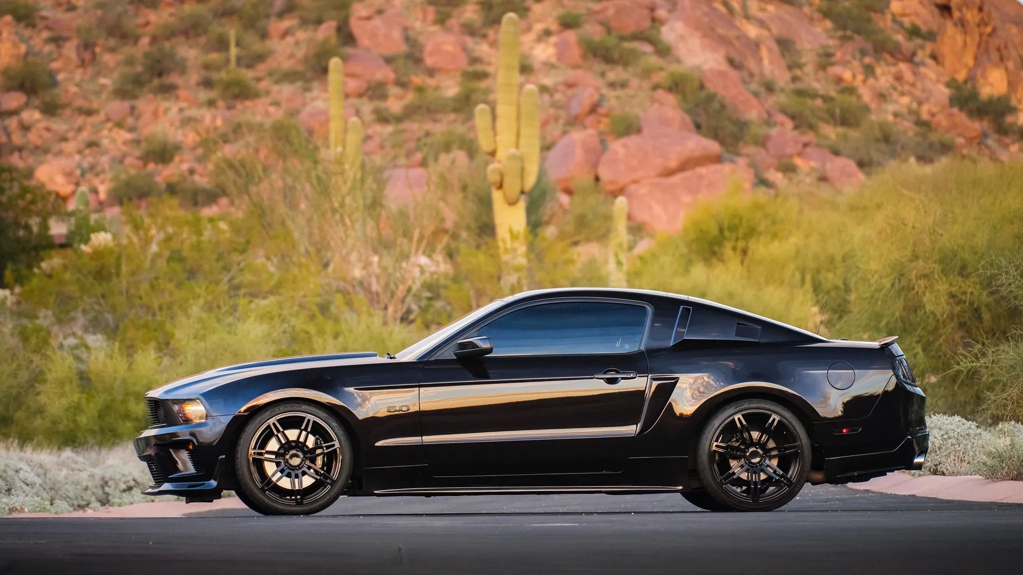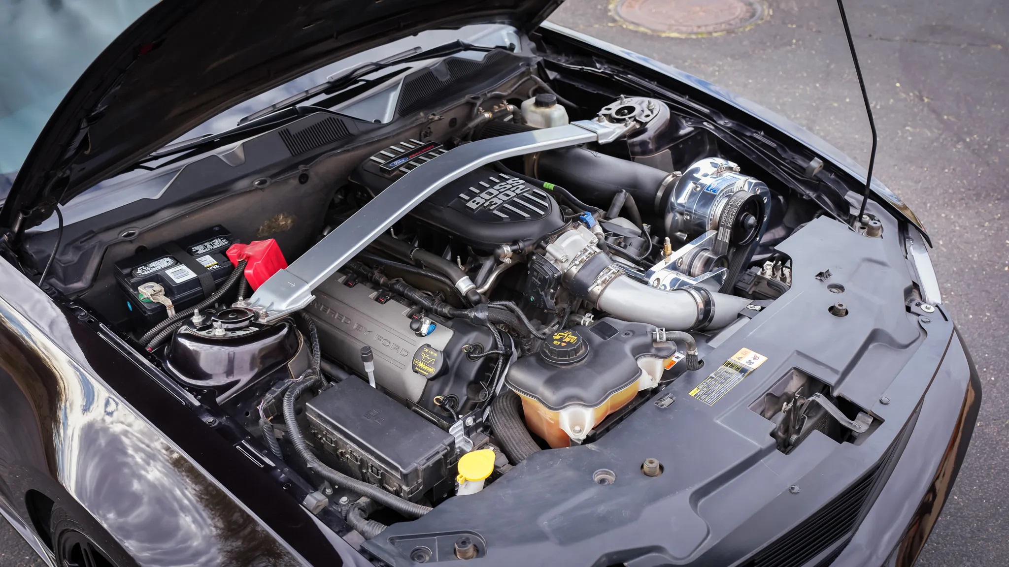 The enhanced supercharged V8, fitted with a ProCharger, Boss 302 intake manifold, intercooler, Ford Racing camshaft, Bama Performance ECU tune, and custom Bassani exhaust, produces over 600 horsepower.